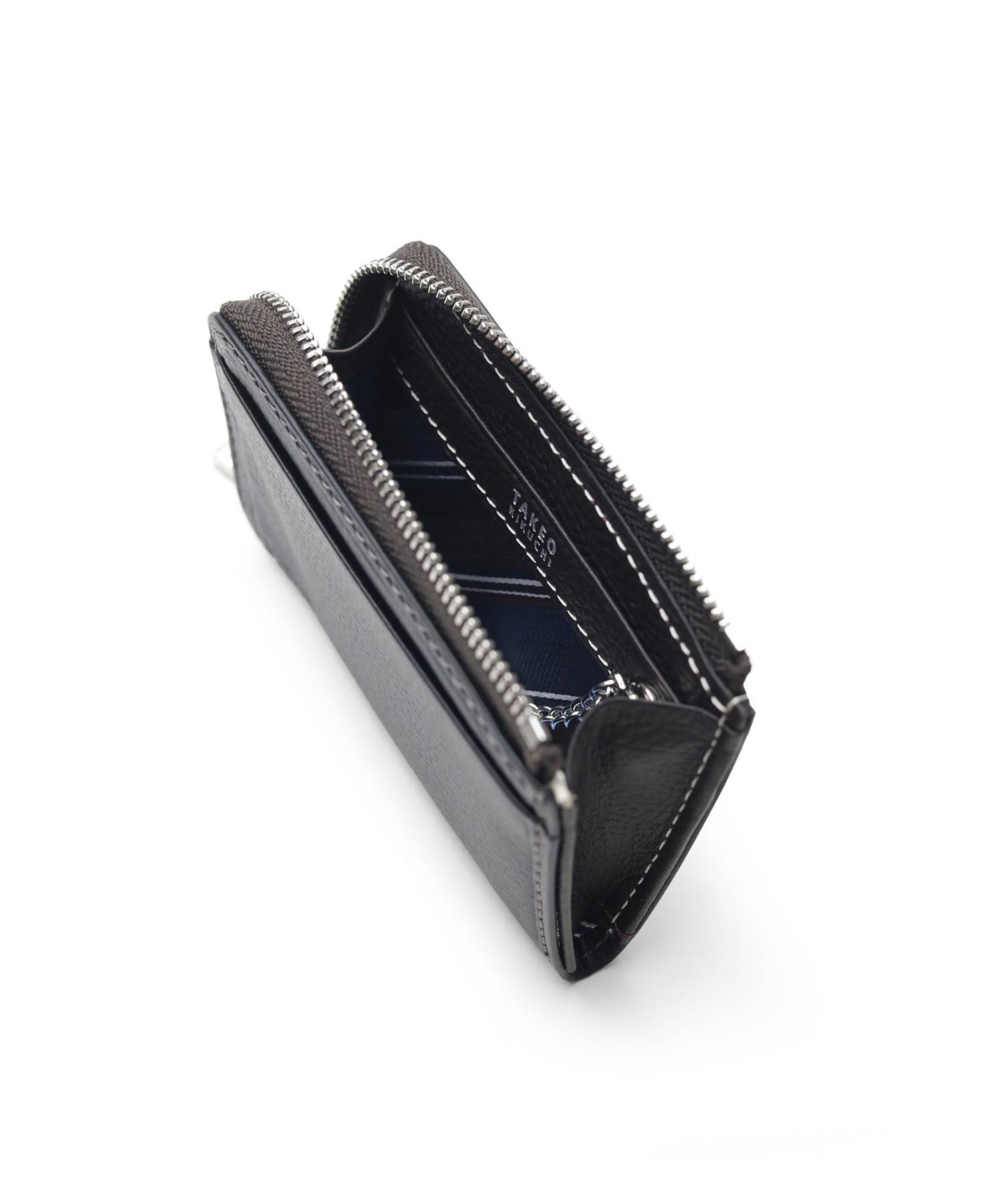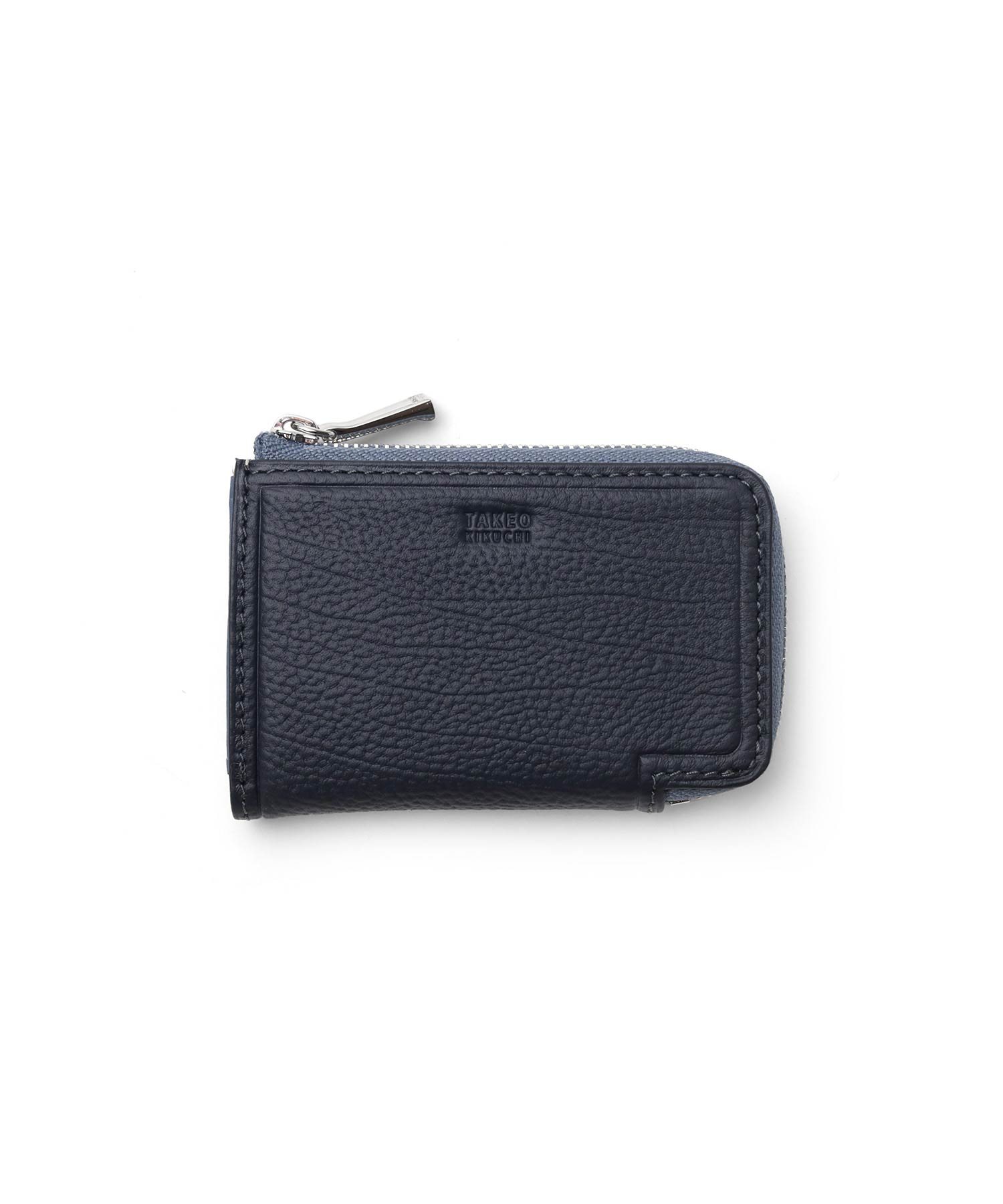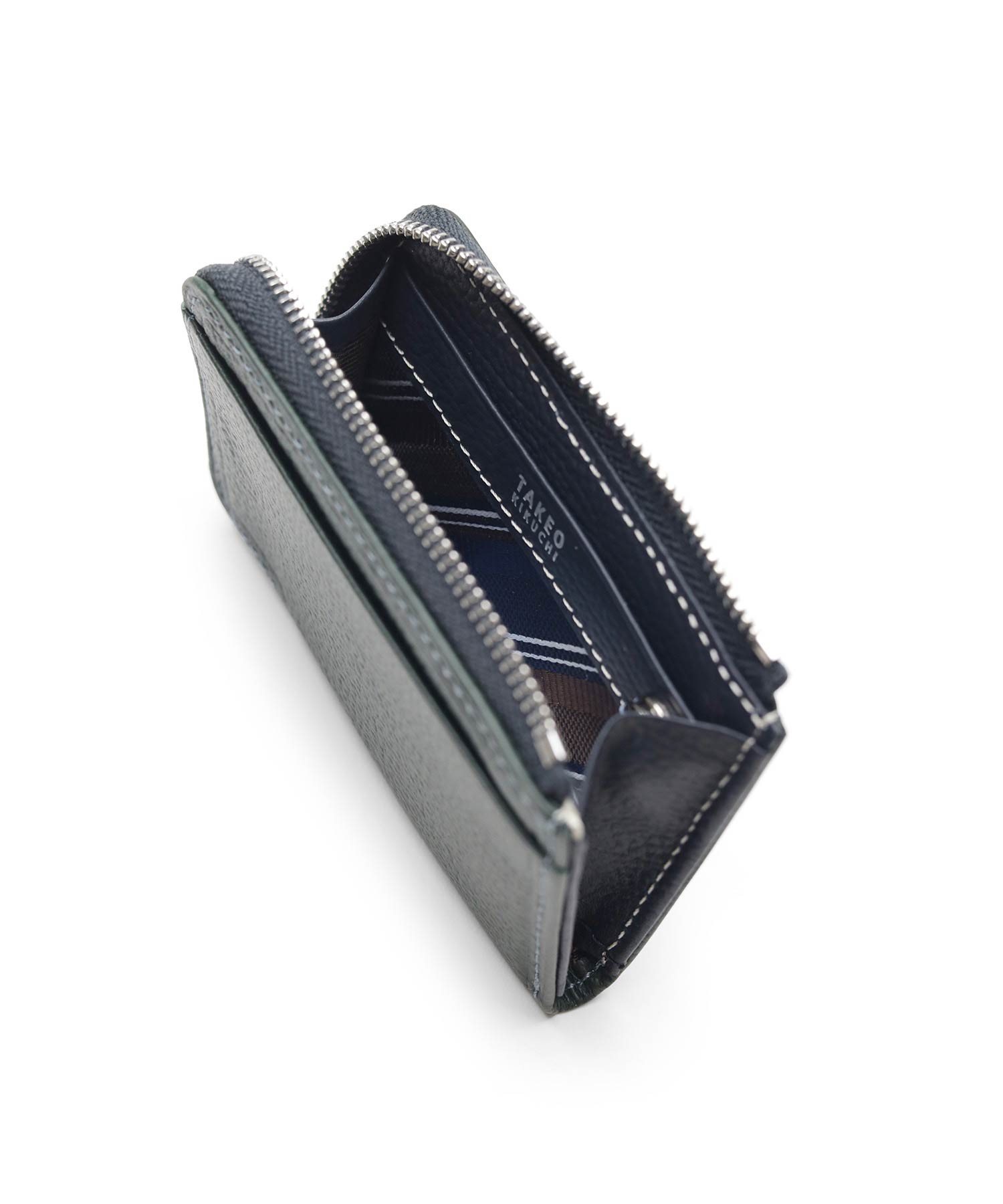 ソフトなキップレザーを使用した、薄マチでスッキリとしたタケオキクチのL字ファスナー型小銭入れです。内装のカラーコンビと、裏地に使用したネクタイ柄ジャガード織り素材がポイントです。