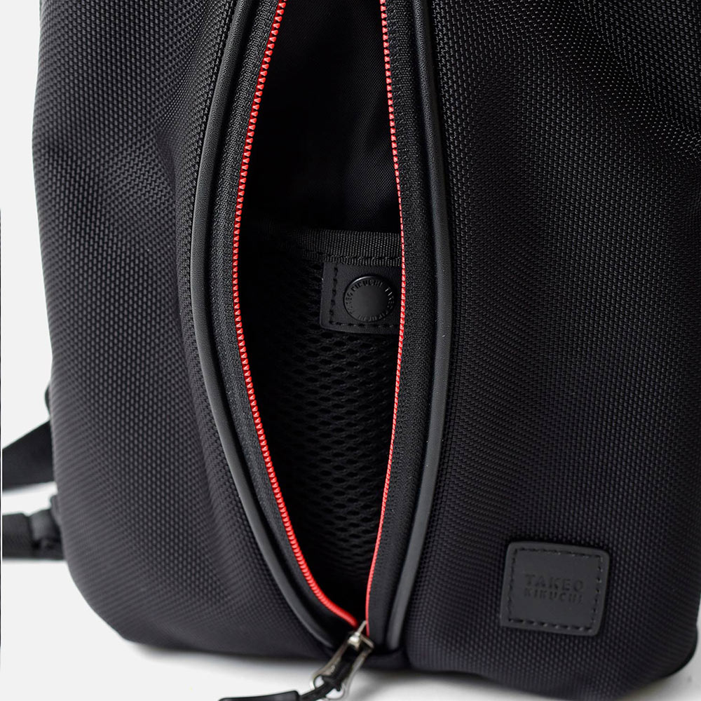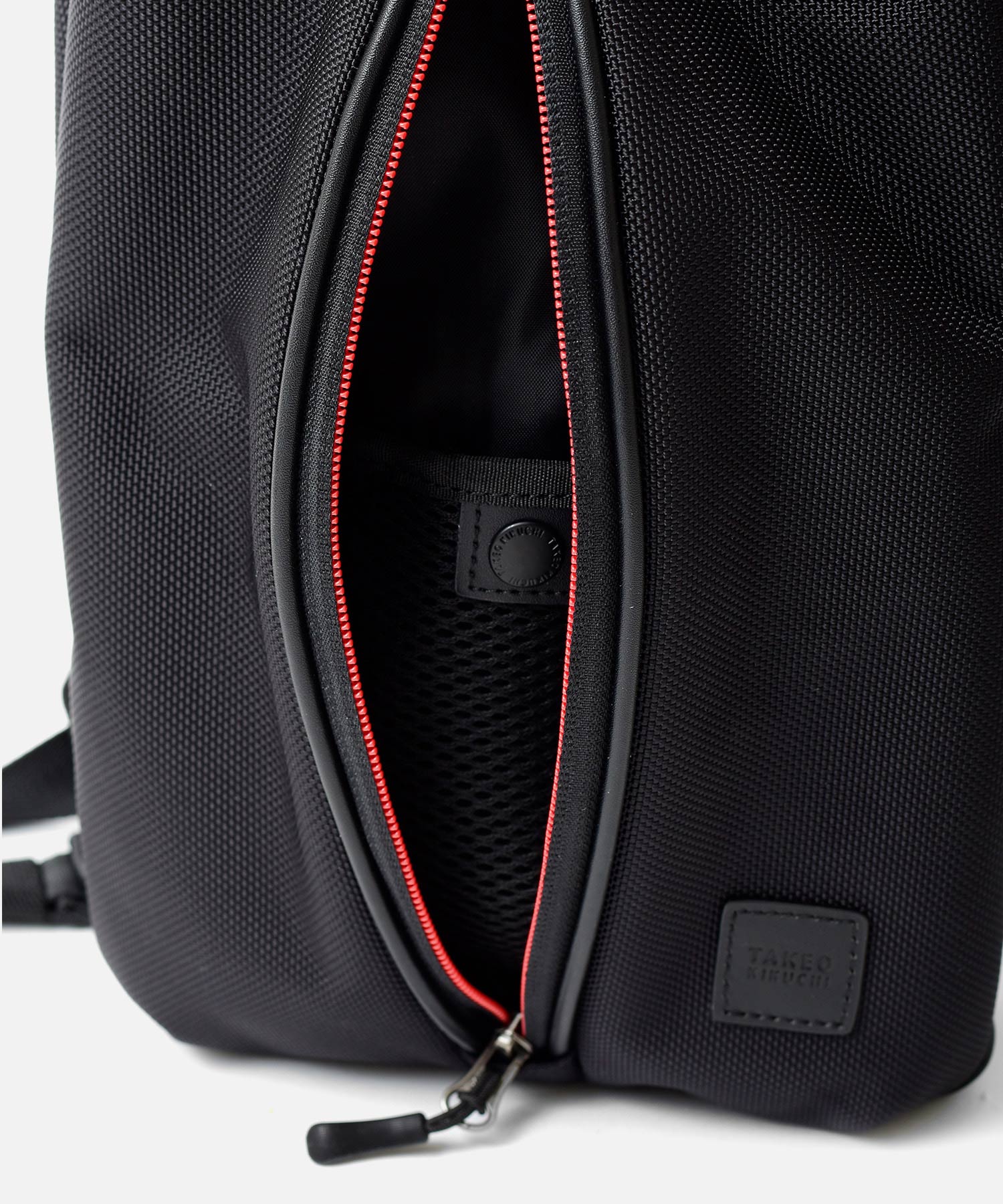TAKEO KIKUCHIを象徴するクロ×アカのカラーコンビネーションを取り入れたスプリットファスナーを使用し、カジュアルながら上品さも表現しました。このデザインはシューズや時計などにも使われています。内装も同様にクロ×アカのデザインになっており、赤色のファスナーポケットとポケットで中身が見やすいのもポイントです。