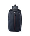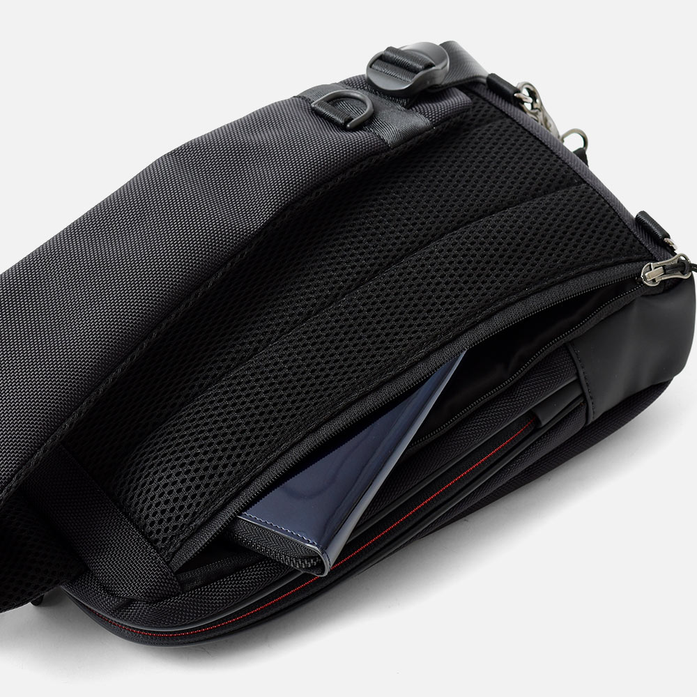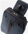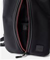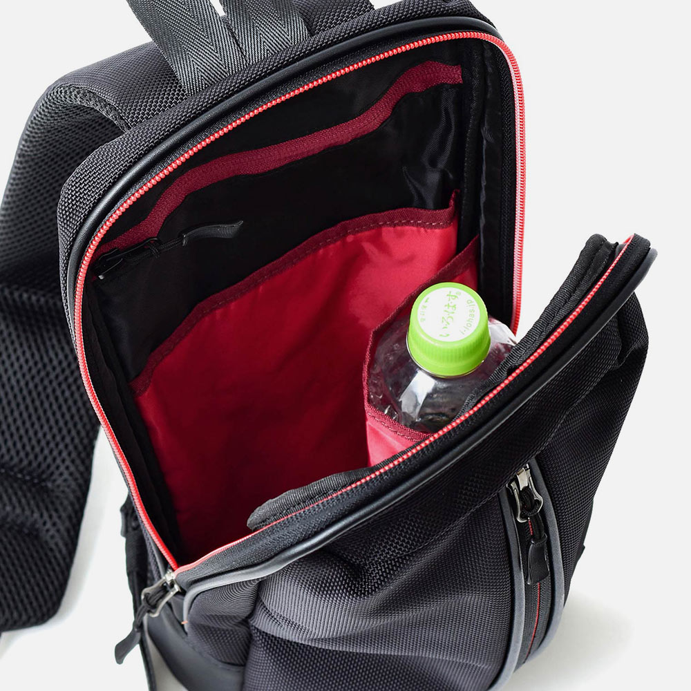 内装にはファスナーポケット、クッションポケット、ペットボトルホルダーが装備されています。ちょっとしたお出かけに必要な荷物をコンパクトにまとめることができます。前面のファスナーポケット内には、さらにメッシュポケットがあります。背面にもファスナーポケットがあり、財布等貴重品の収納に便利です。