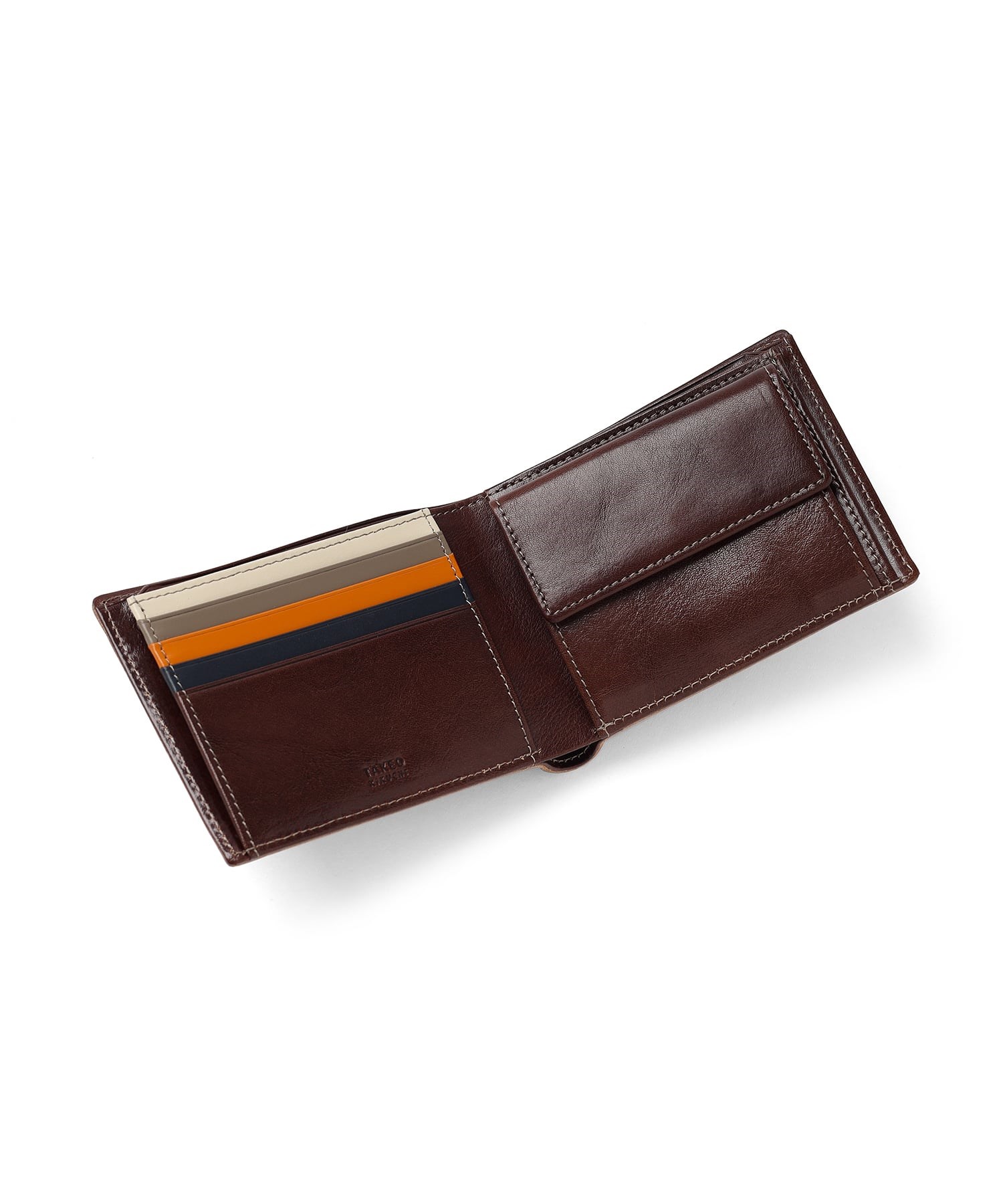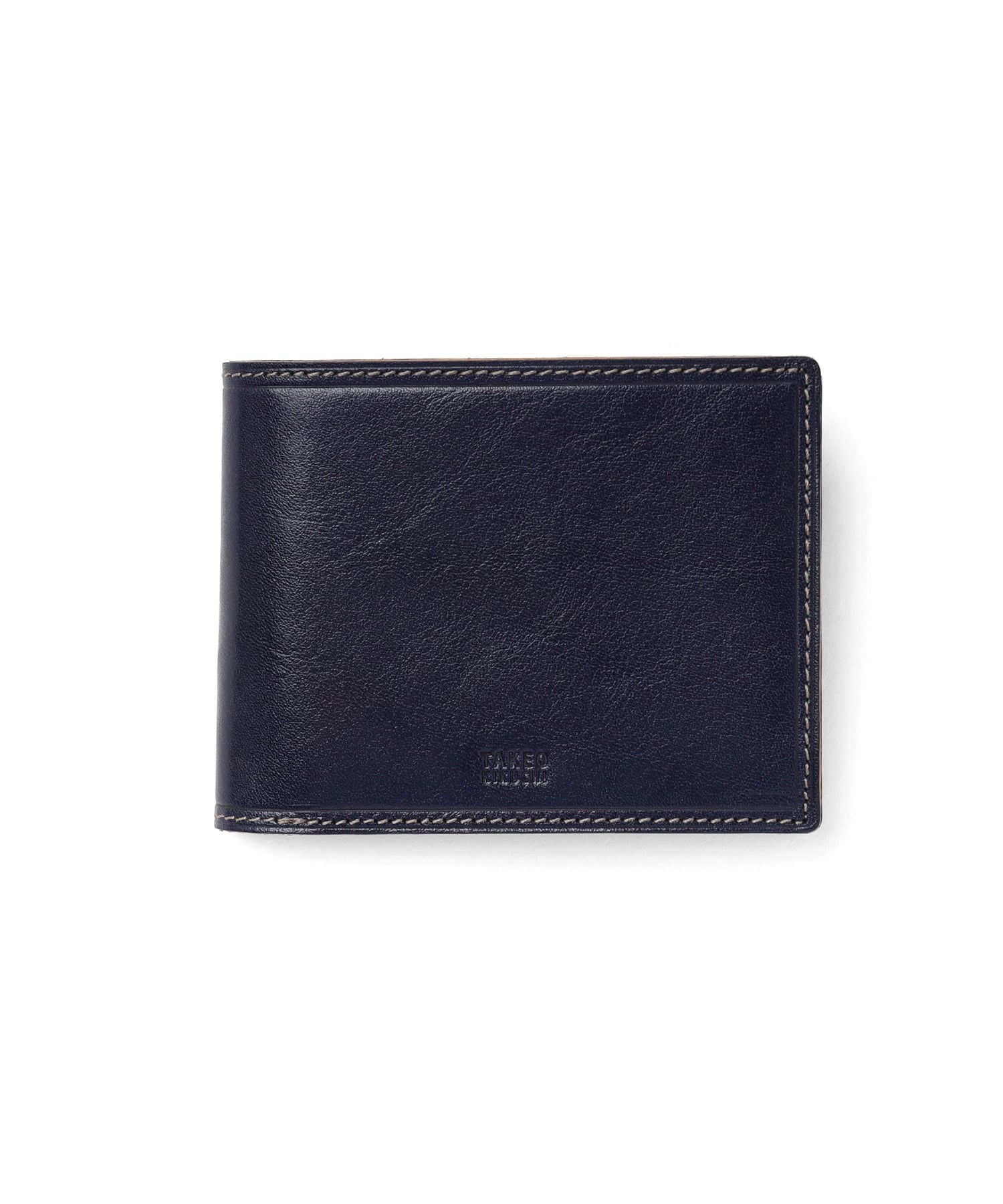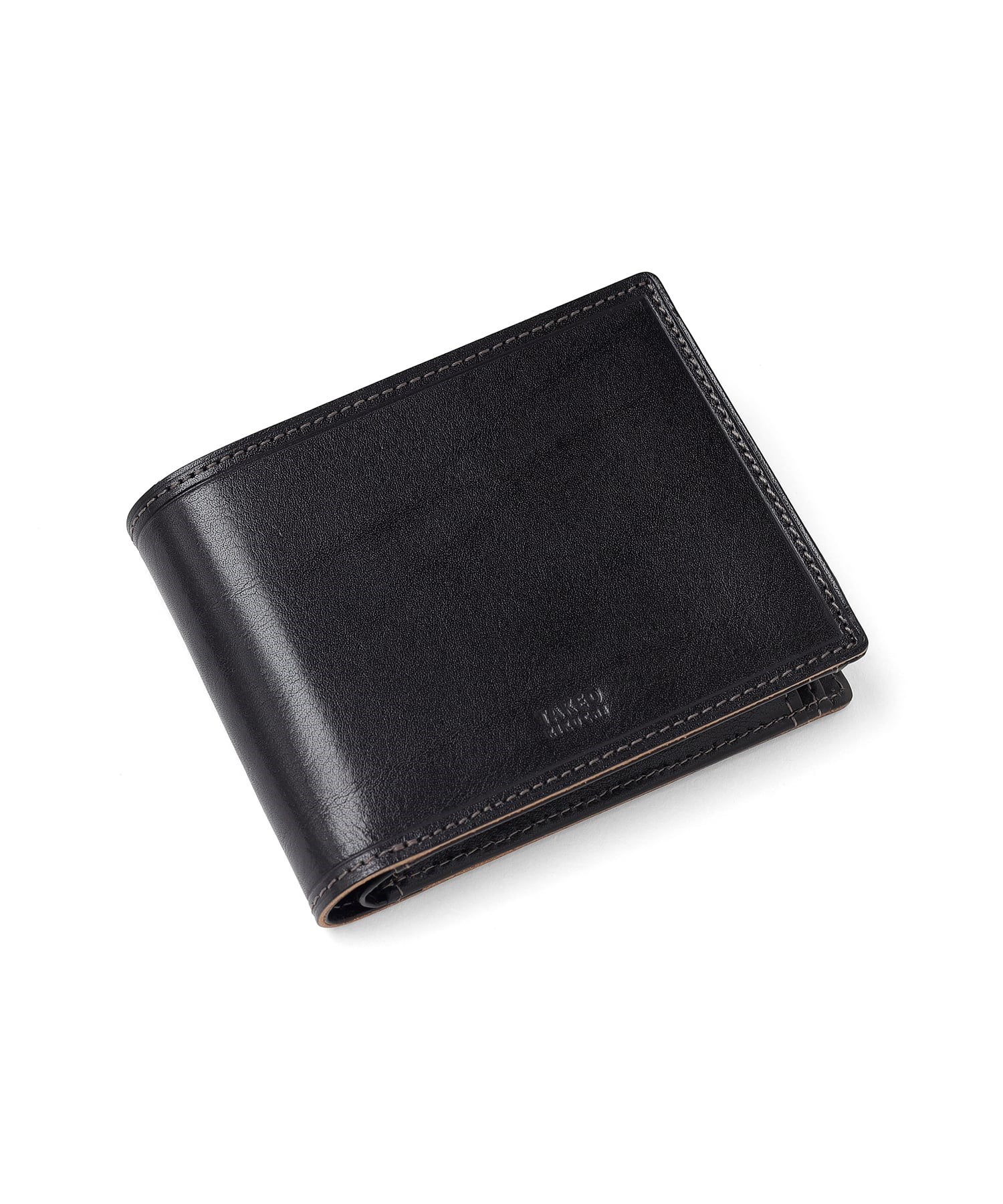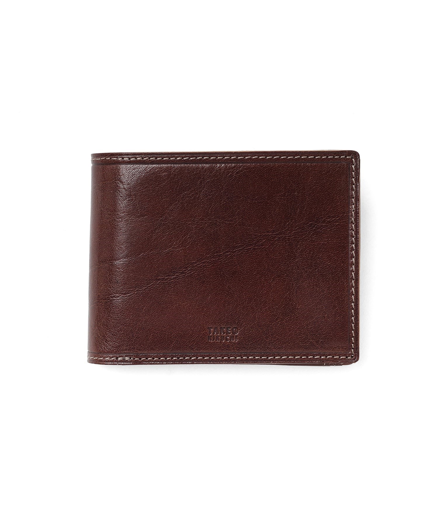 革本来の質感を活かしたシックな印象の外装と、ダスティカラーを取り入れた内装とのコントラストが魅力の、TAKEO KIKUCHIの二つ折り財布。