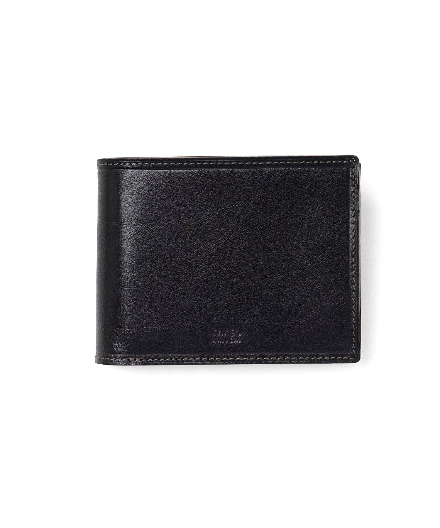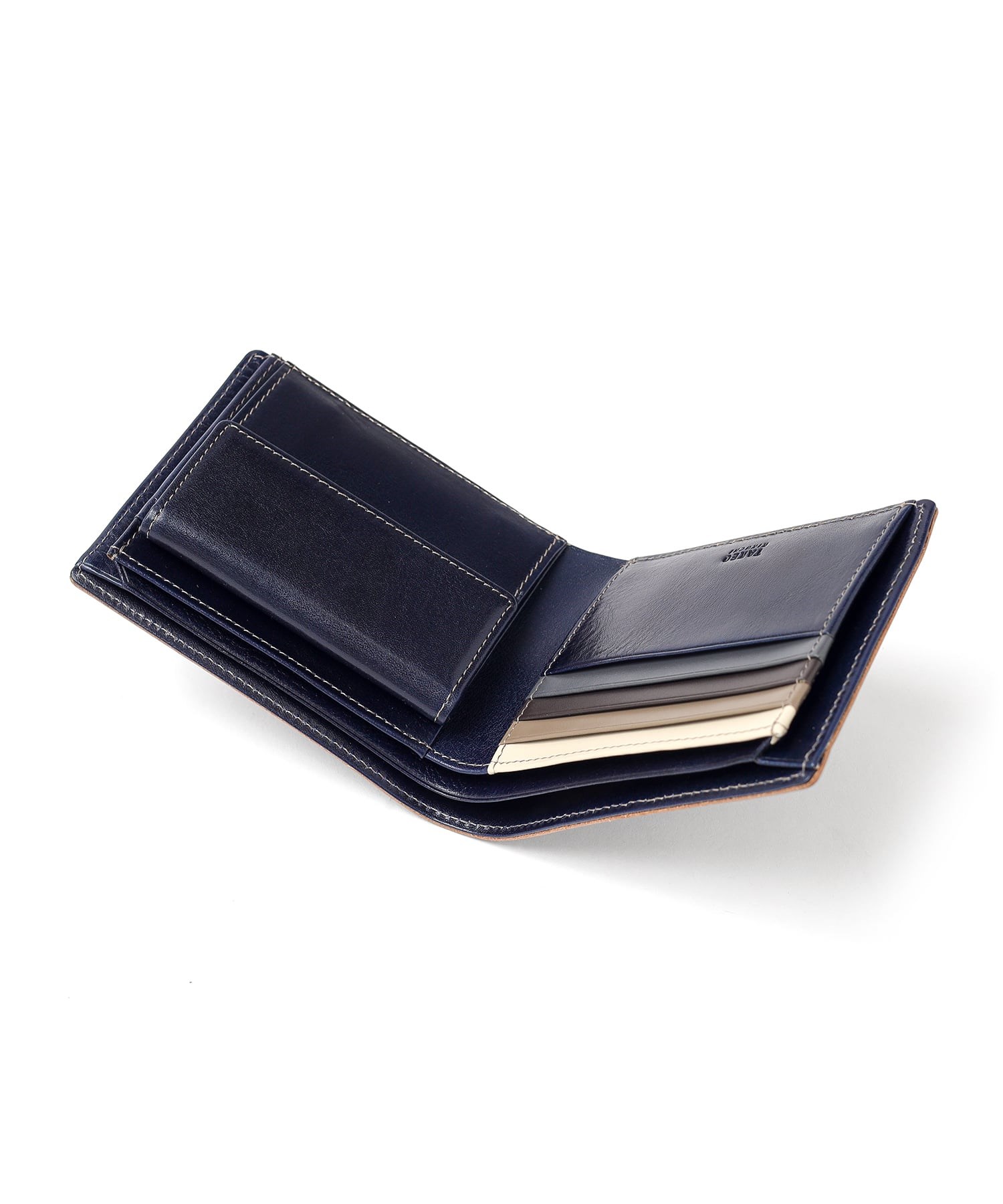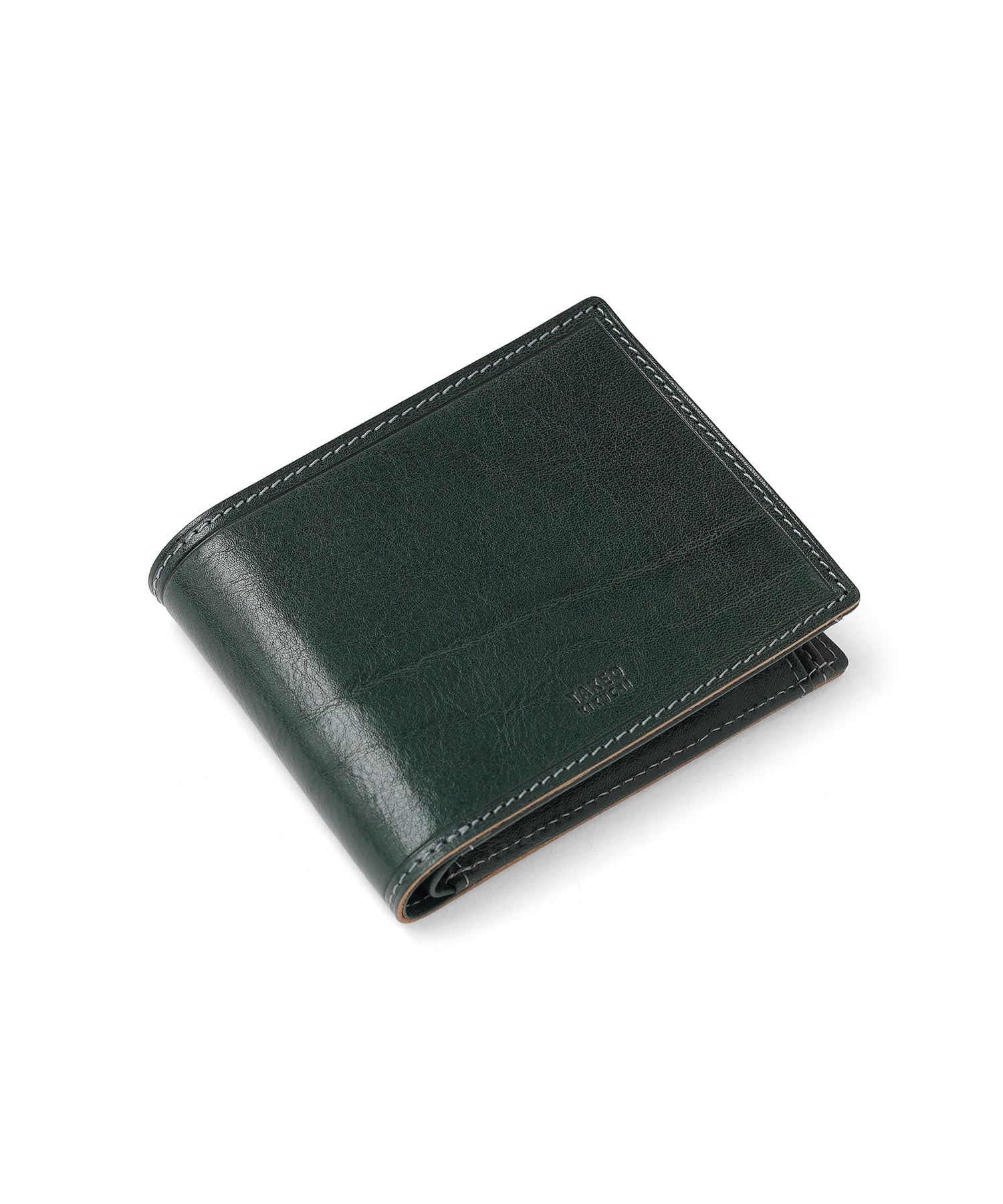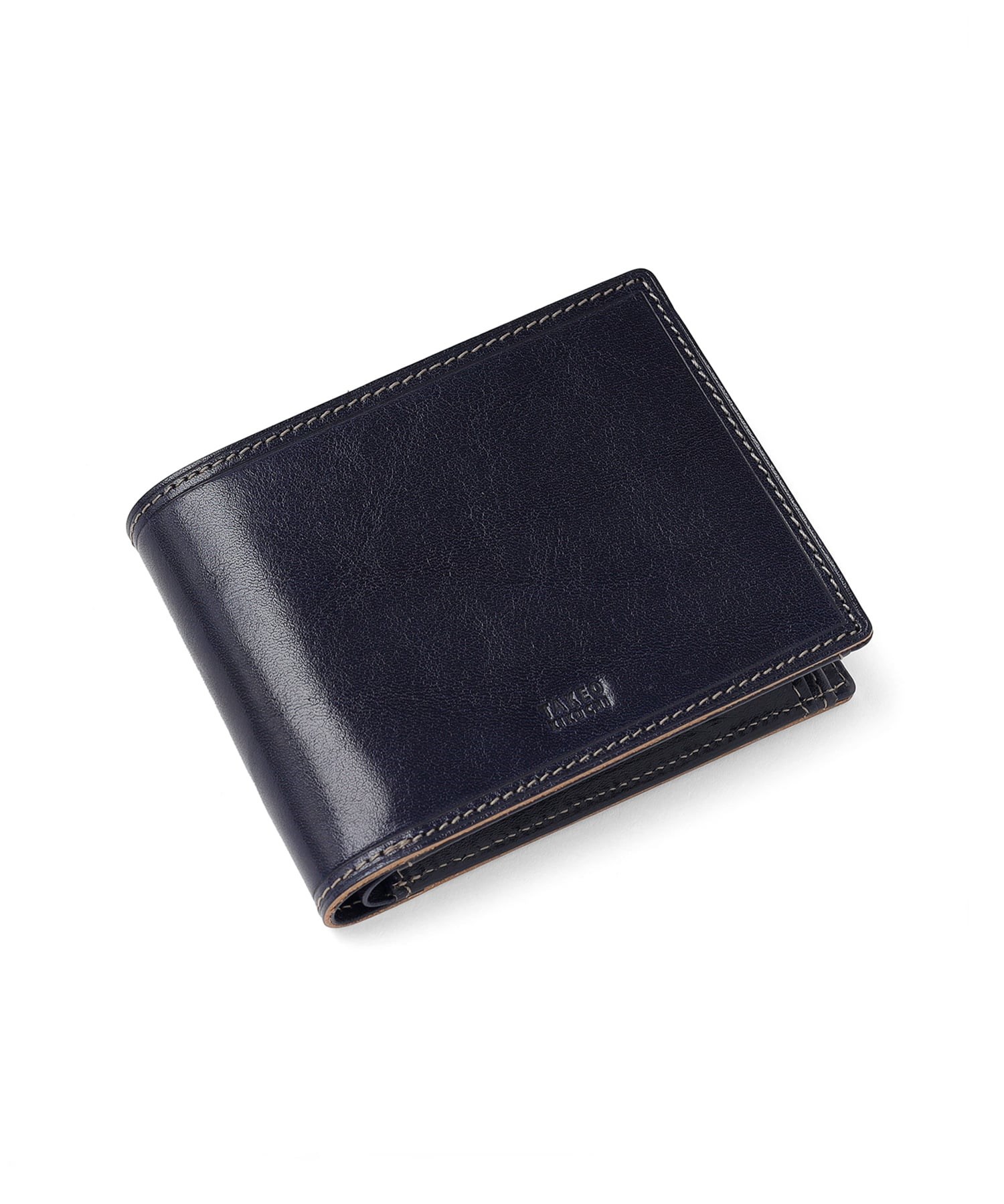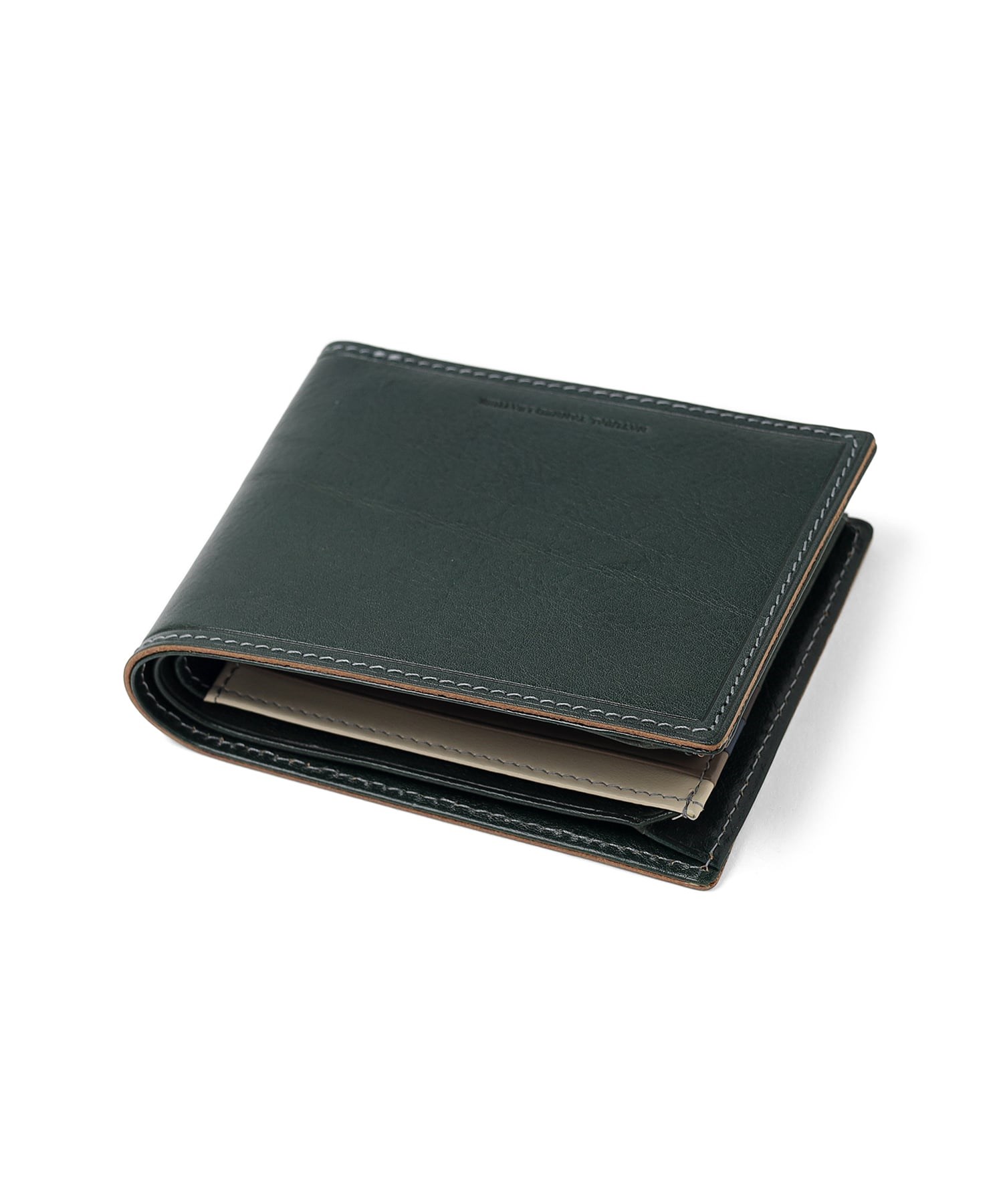 革本来の質感を活かしたシックな印象の外装と、ダスティカラーを取り入れた内装とのコントラストが魅力の、TAKEO KIKUCHIの二つ折り財布。