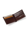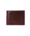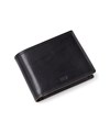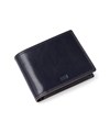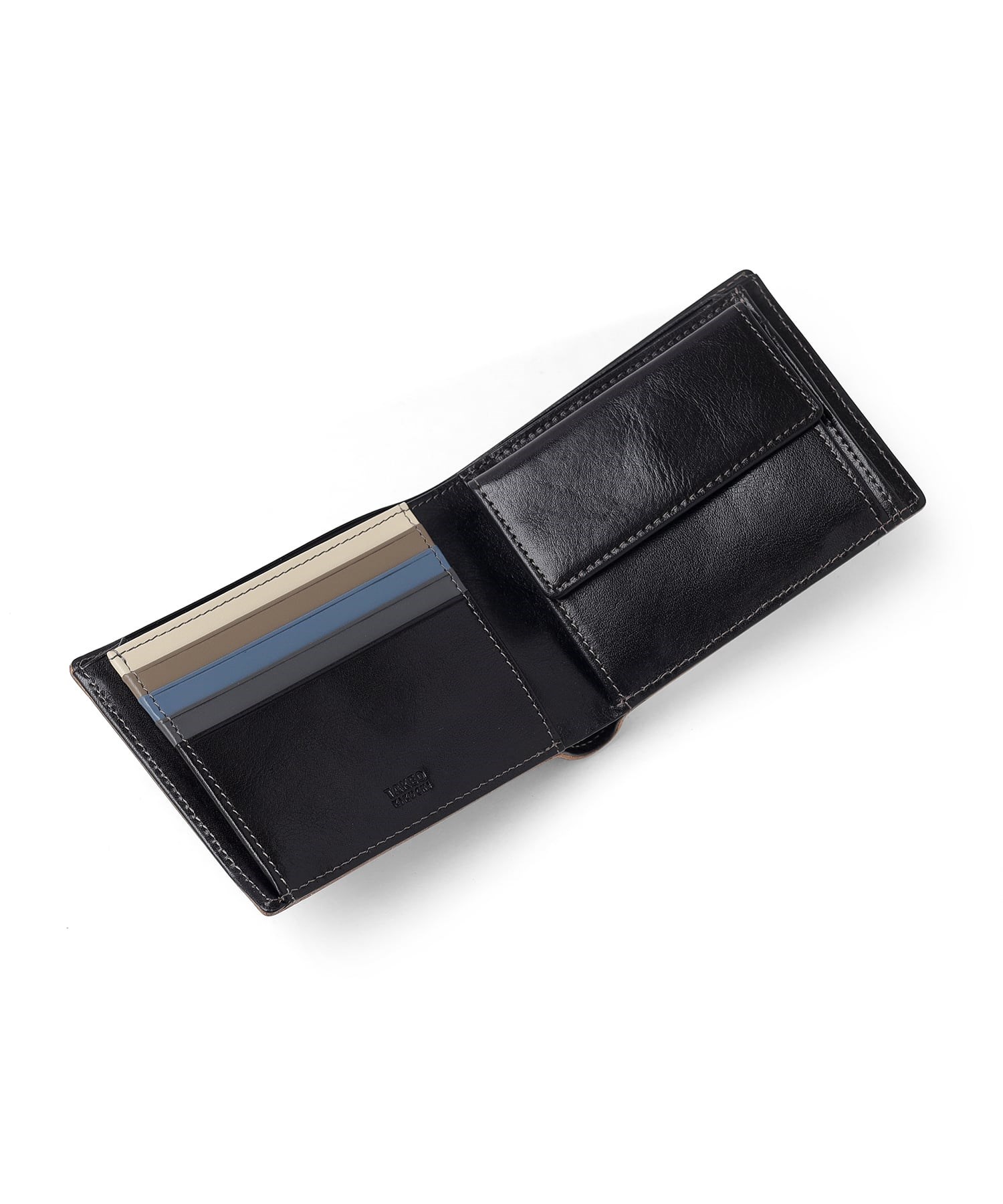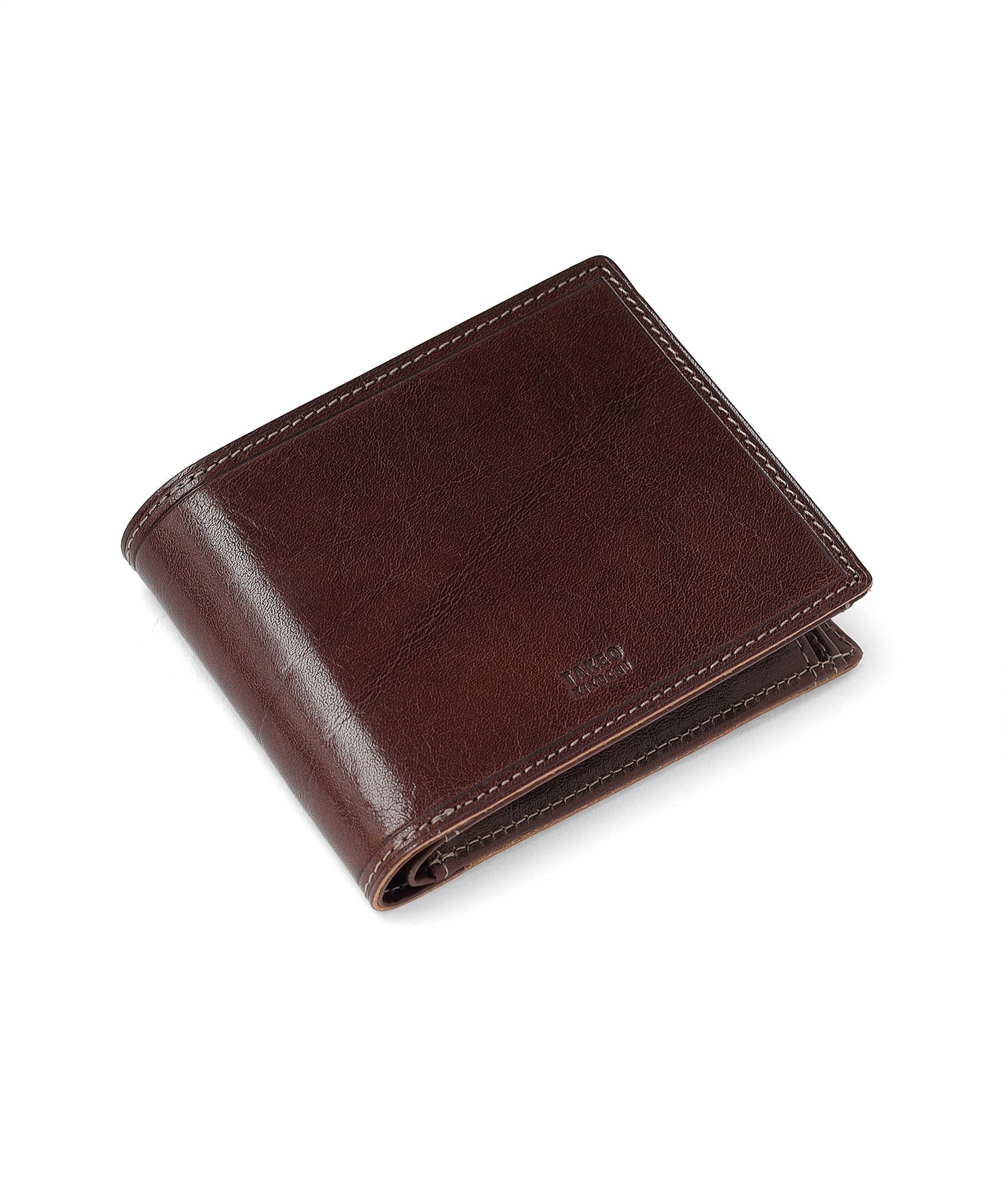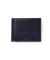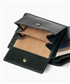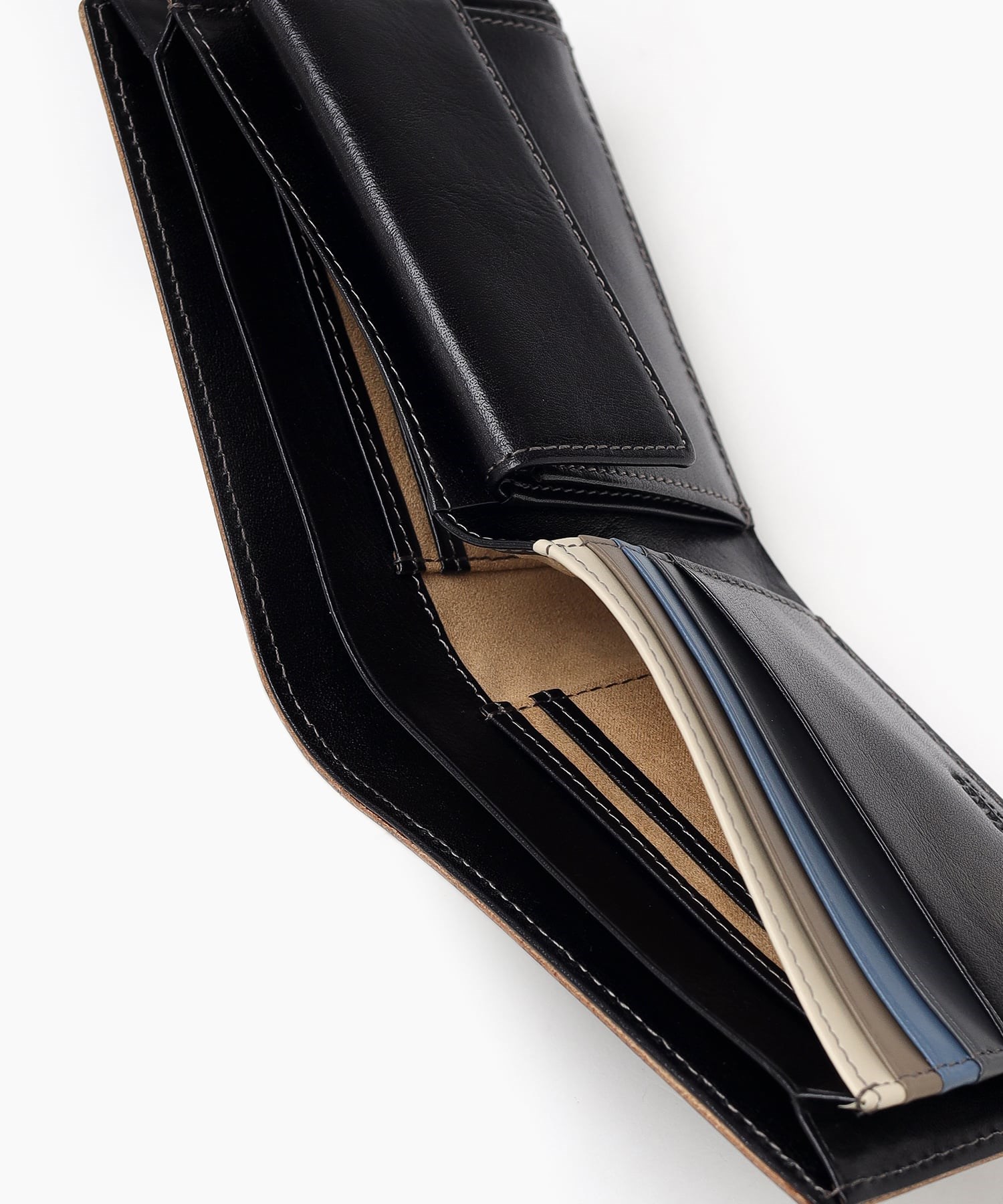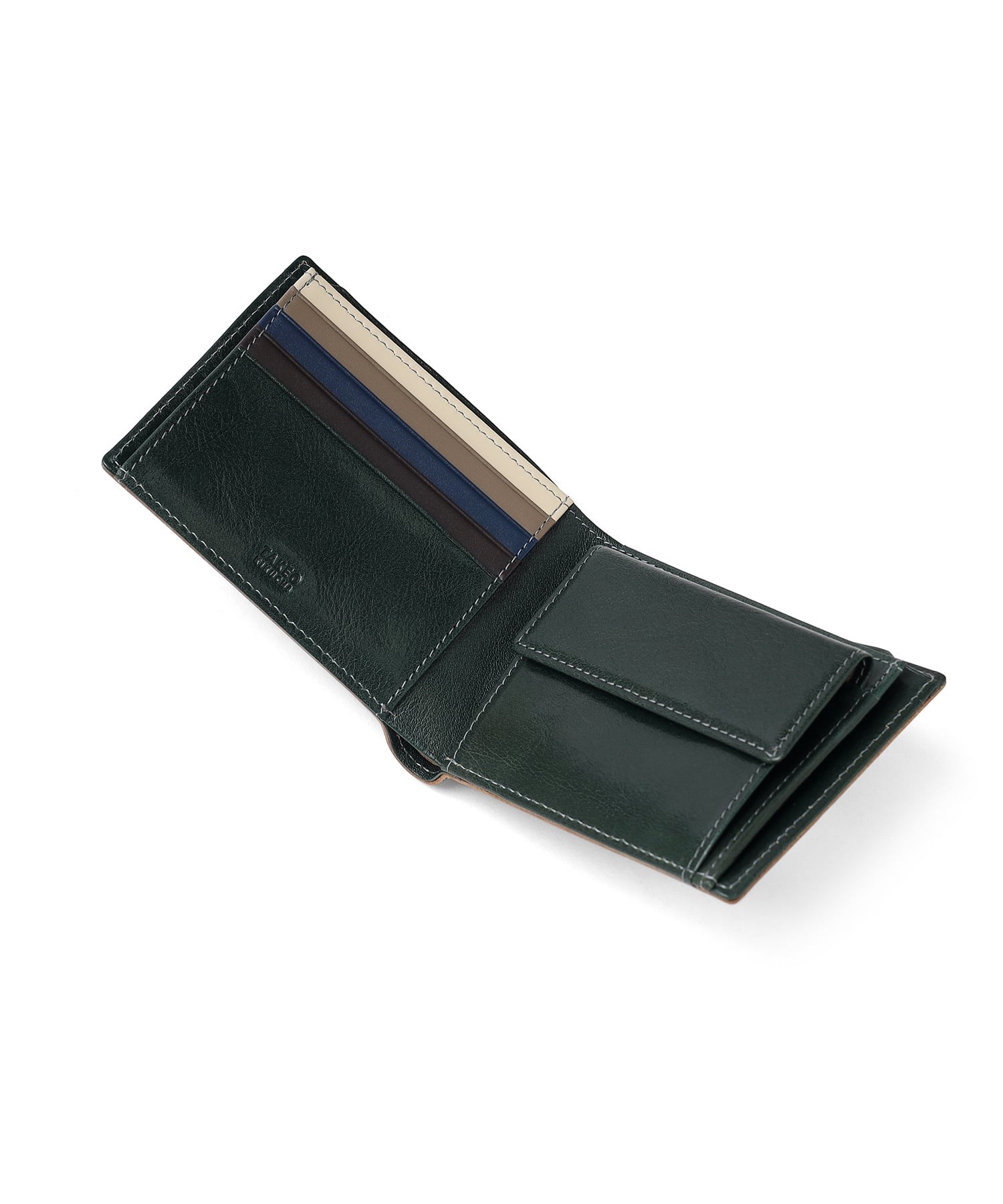 革本来の質感を活かしたシックな印象の外装と、ダスティカラーを取り入れた内装とのコントラストが魅力の、TAKEO KIKUCHIの二つ折り財布。