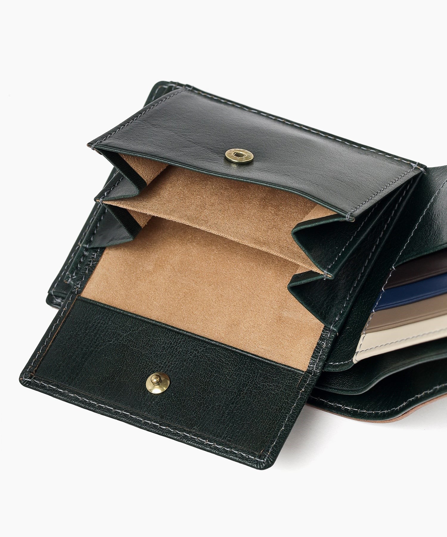 革本来の質感を活かしたシックな印象の外装と、ダスティカラーを取り入れた内装とのコントラストが魅力の、TAKEO KIKUCHIの二つ折り財布。落ち着いたトーンで統一し、洗練された大人の雰囲気に仕上げました。