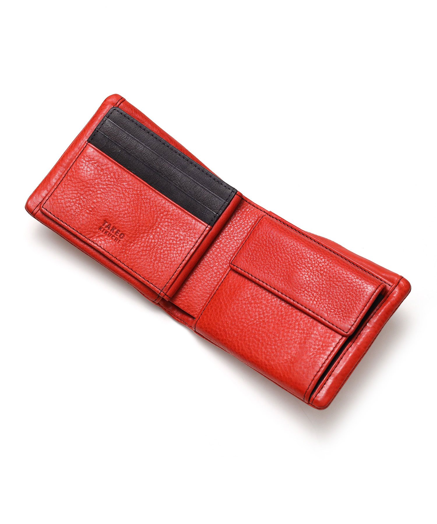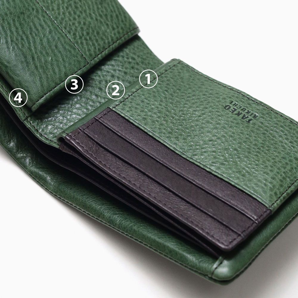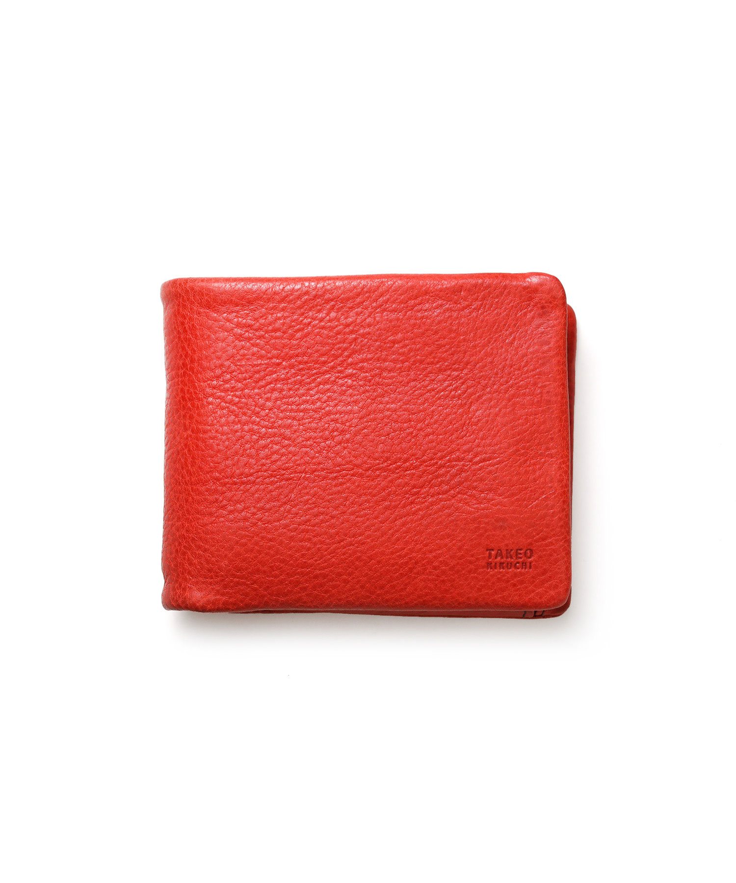 カラフルで質感の良いイタリアンレザーを使用した、タケオキクチのカジュアルな二つ折り財布。袋縫いのふっくらとしたボリューム感が魅力です。中ベラ付きで、カードをたっぷり収納することが可能です。