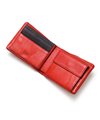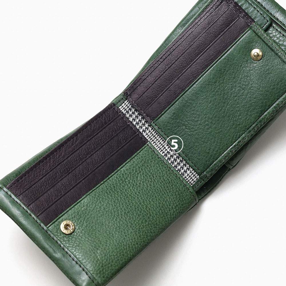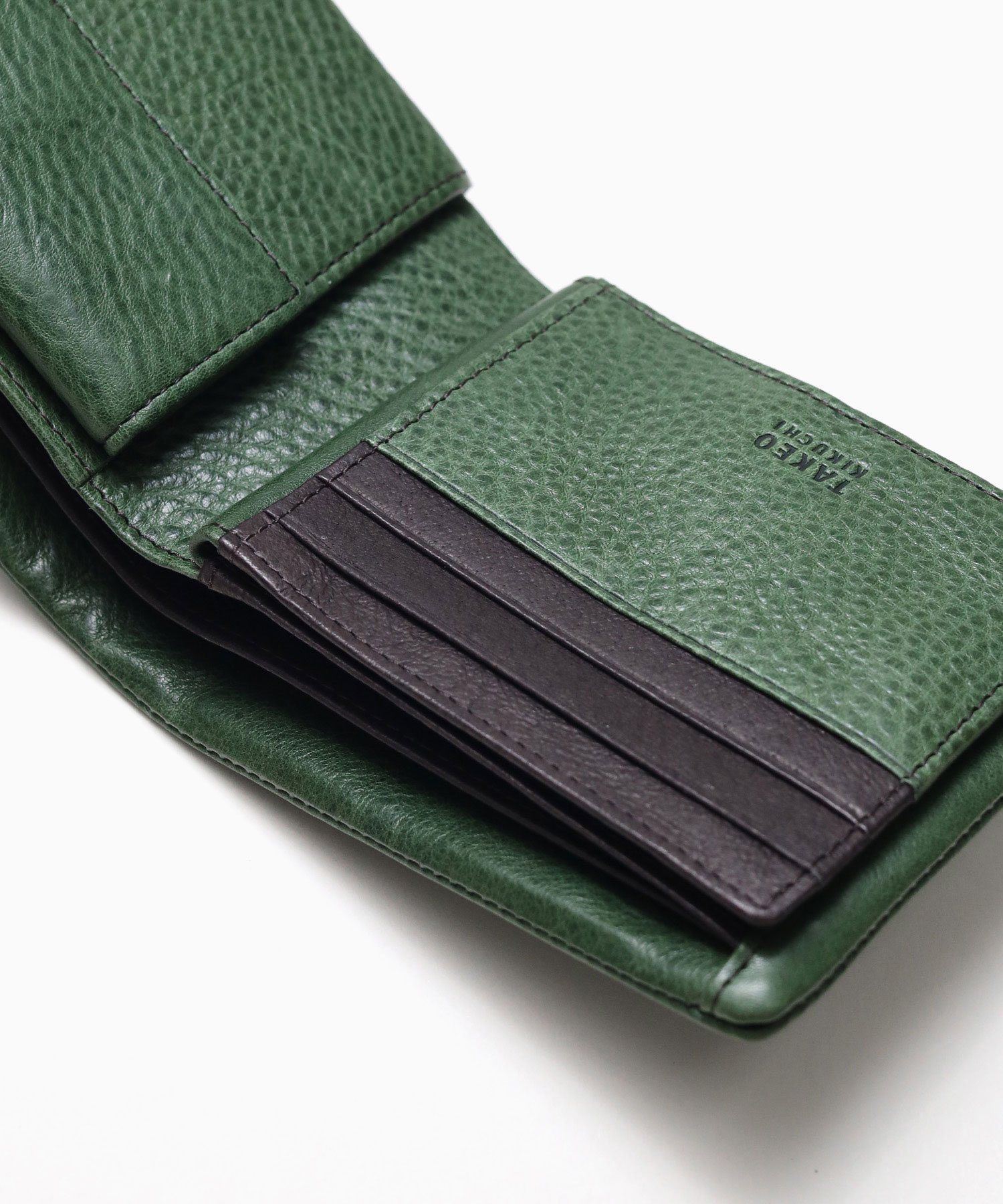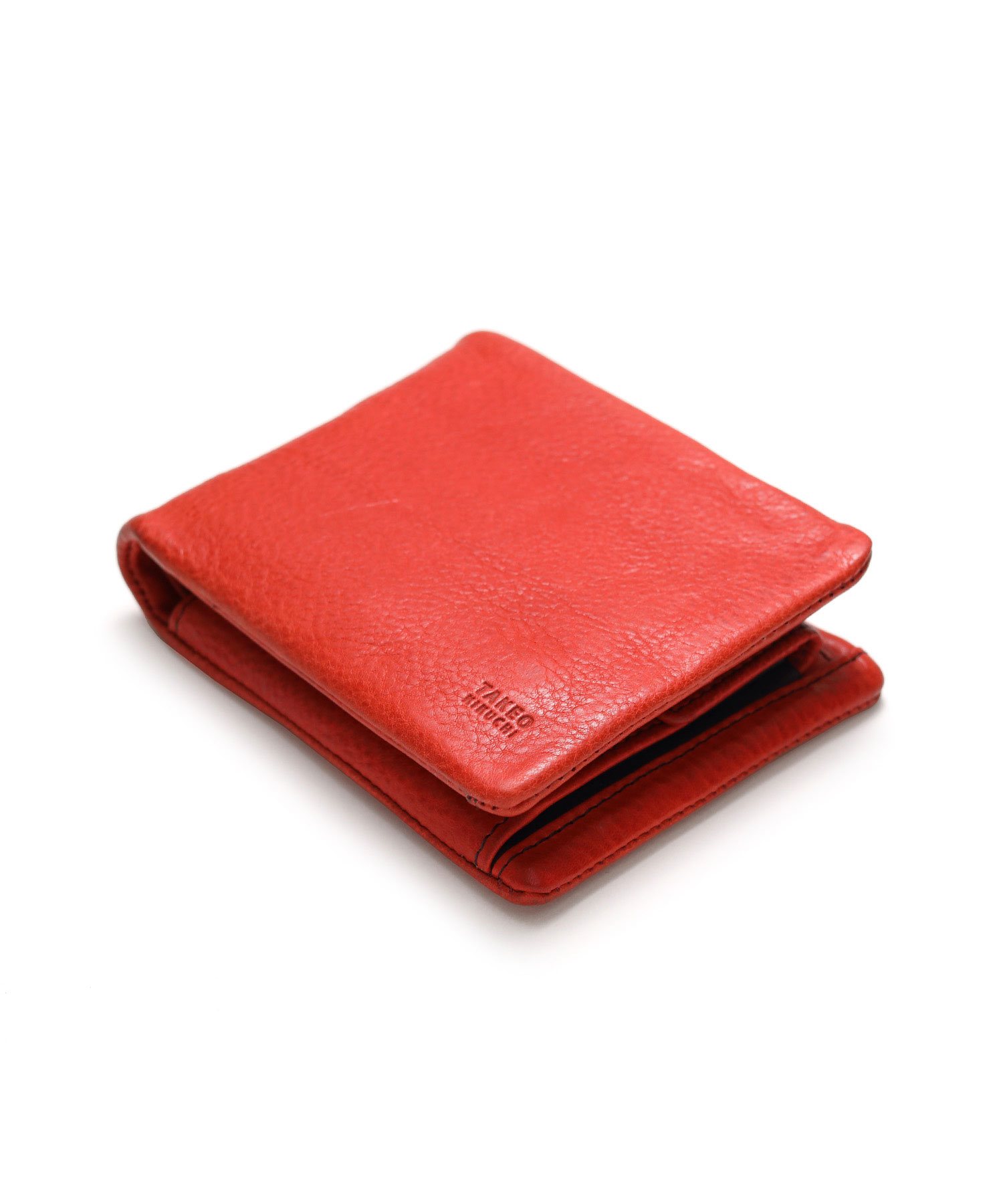 カラフルで質感の良いイタリアンレザーを使用した、タケオキクチのカジュアルな二つ折り財布。袋縫いのふっくらとしたボリューム感が魅力です。中ベラ付きで、カードをたっぷり収納することが可能です。