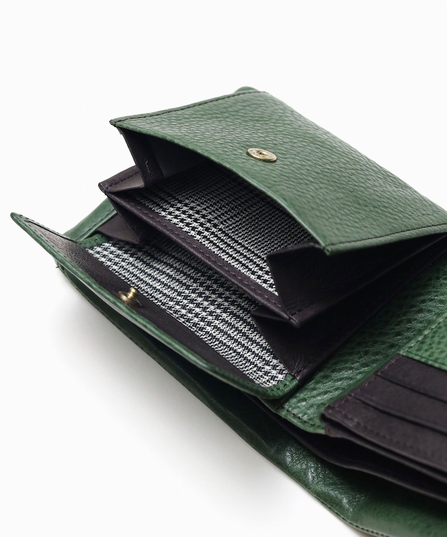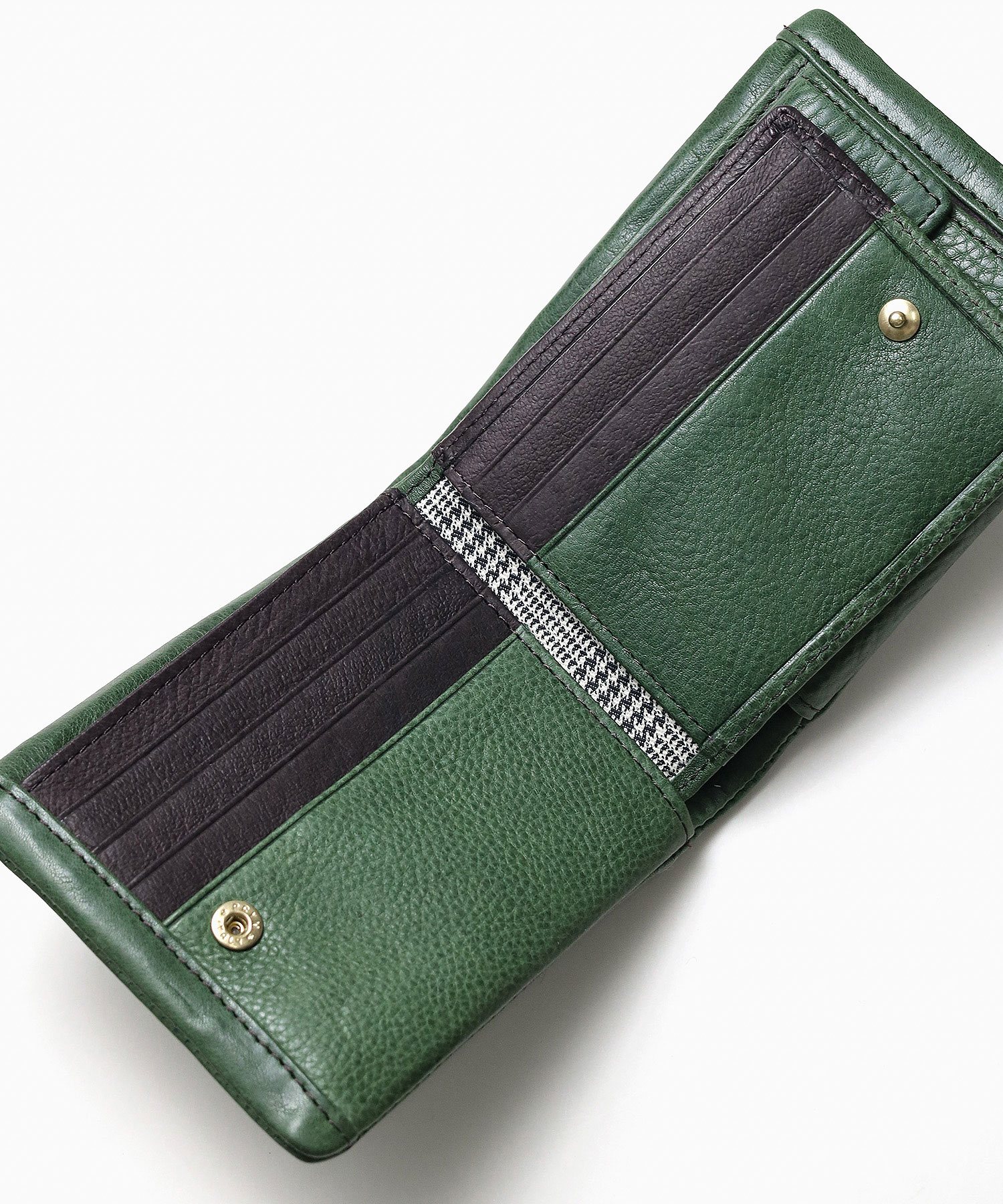 内装にはフリーポケットが5つ、仕切り付きの小銭入れ、札入れが2つ、カード段が合計12あります。中ベラが付いておりポケットがたくさん備わっているので、コンパクトながらカードをたっぷり収納することができます。