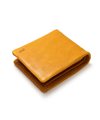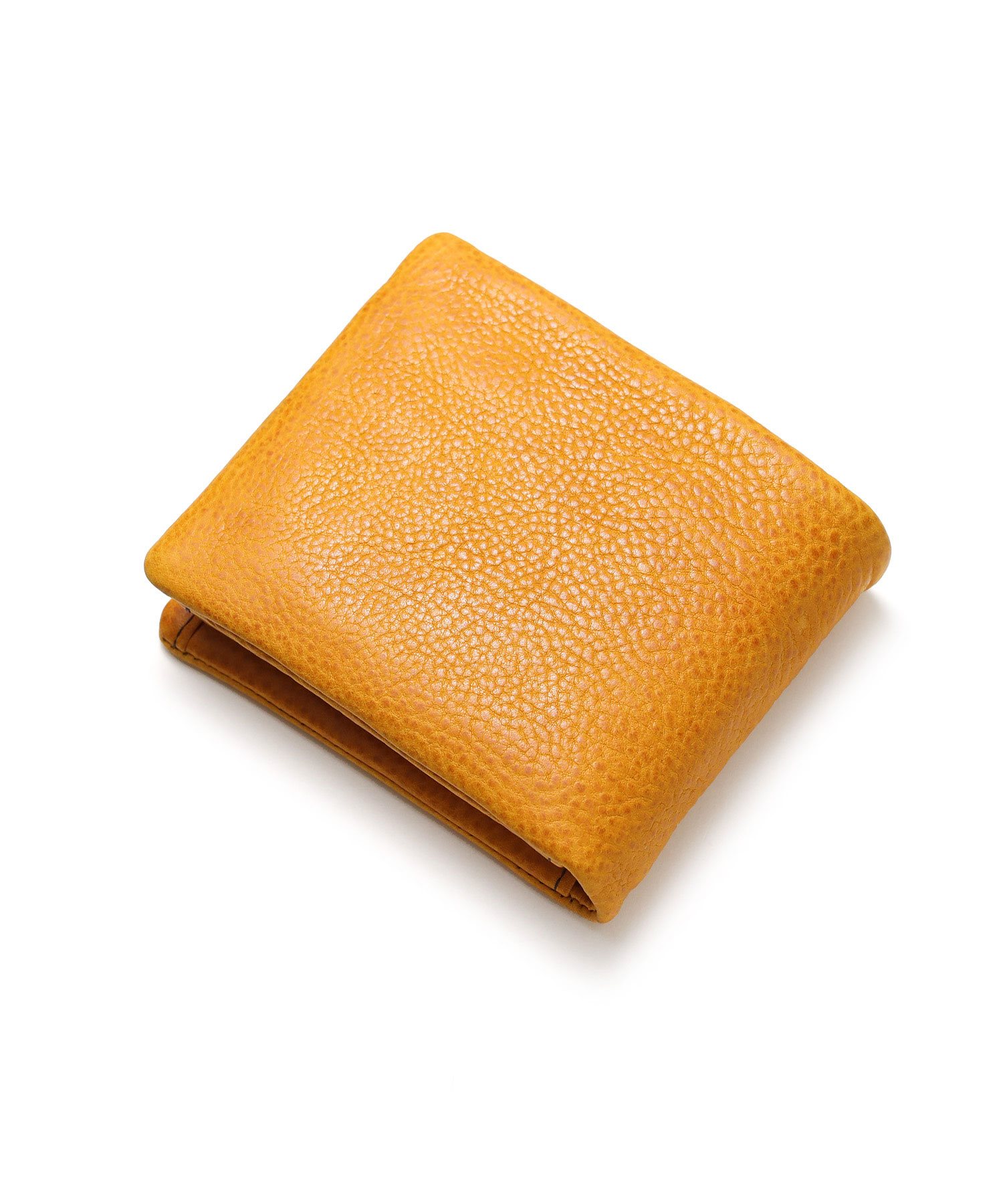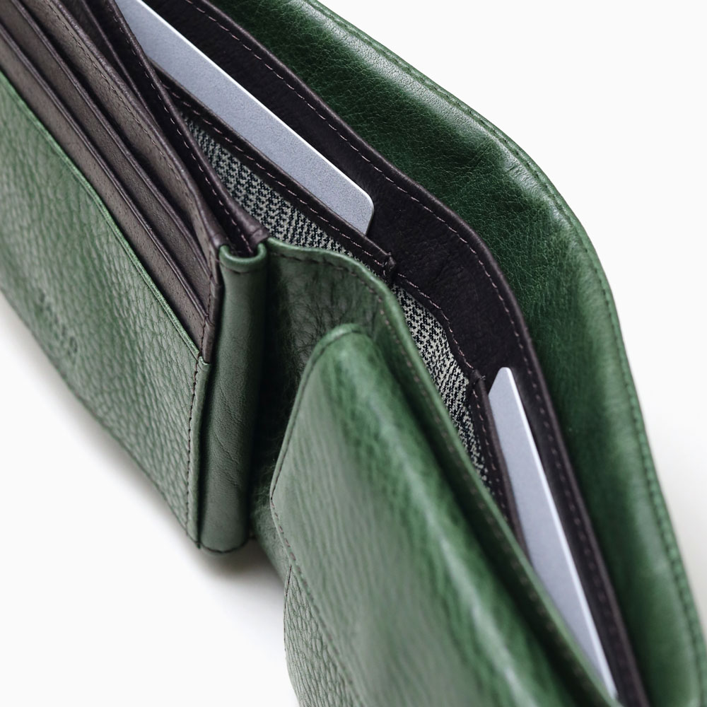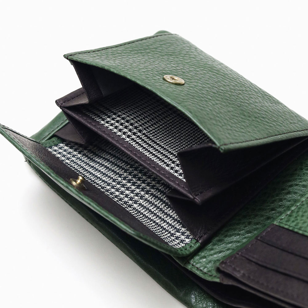 カラフルで質感の良いイタリアンレザーとカード収納たっぷりのボリューム感が魅力的な袋縫いの二つ折り財布。イタリア・トスカーナ地方サンタクローチェで昔ながらのバケッタ製法で作られた、染料・芯通しのフルベジタブルタンニンシュリンクレザーを使用しています。繊維をほぐす加工を行い、優しいシュリンクに仕上がっており、しなやかでしっとりとした手触りと風合いが特徴です。
