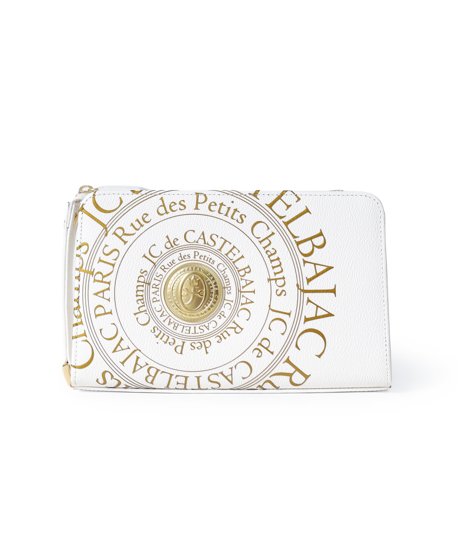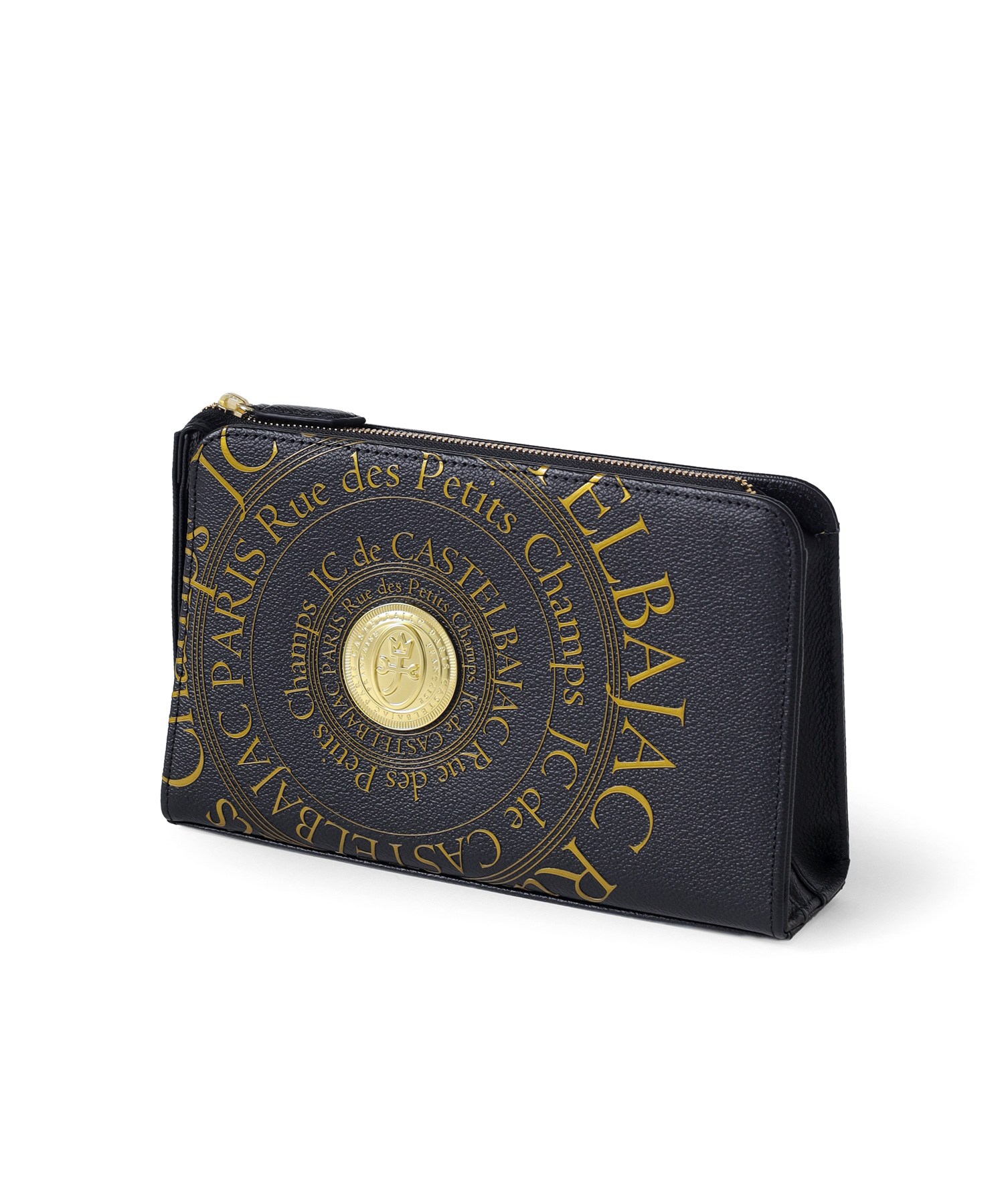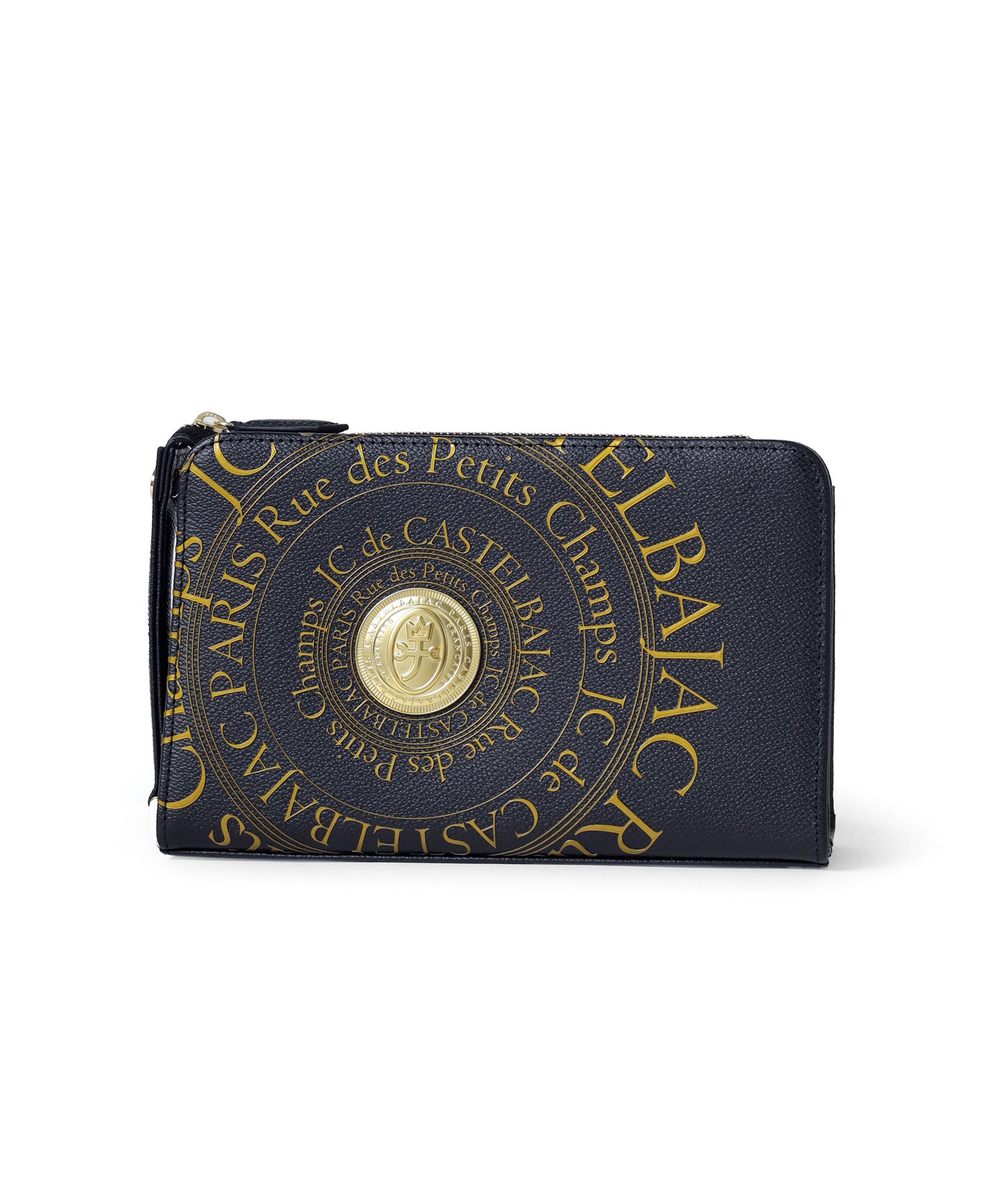 カステルバジャックのオールレザーで上質なクラッチバッグ。フランスのコインをモチーフにした立体的なゴールドプレートと、その周りに施されたゴールドプリントがハイグレードな男っぽさを演出します。ゴールドが映える、クロと白の2色展開です。持ち物のアクセントになるので派手好きの方にはぴったりなアイテムとなっております。
