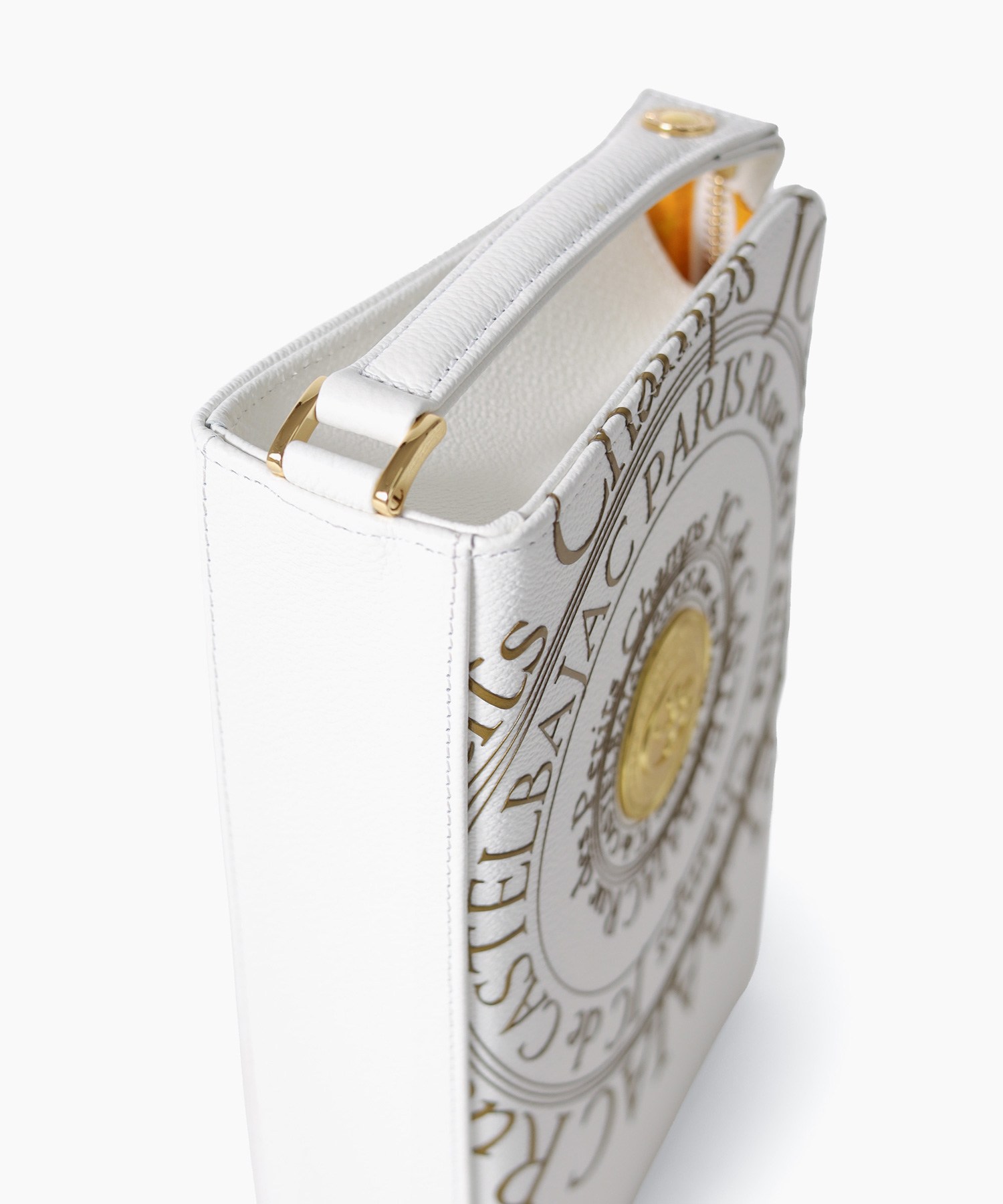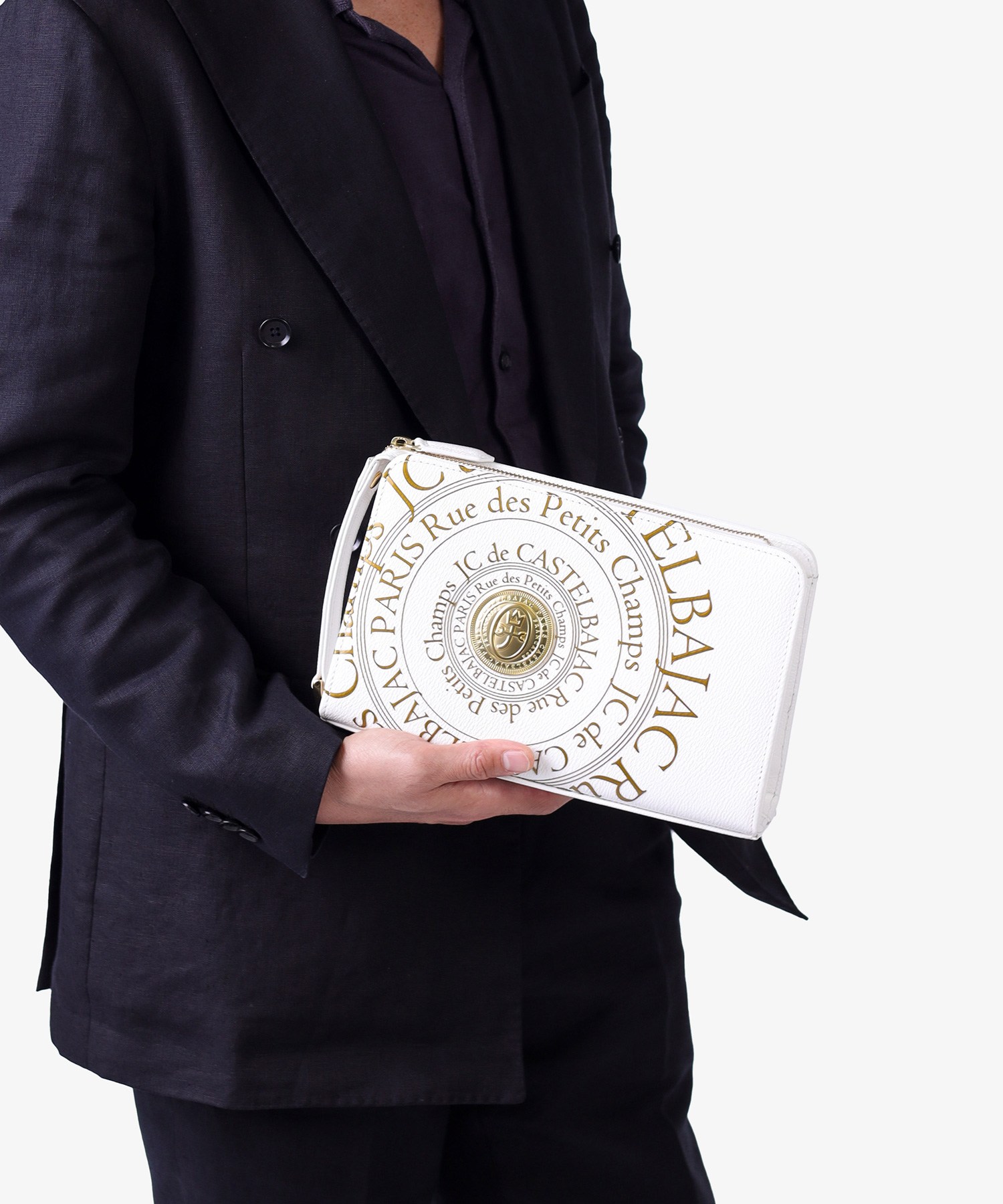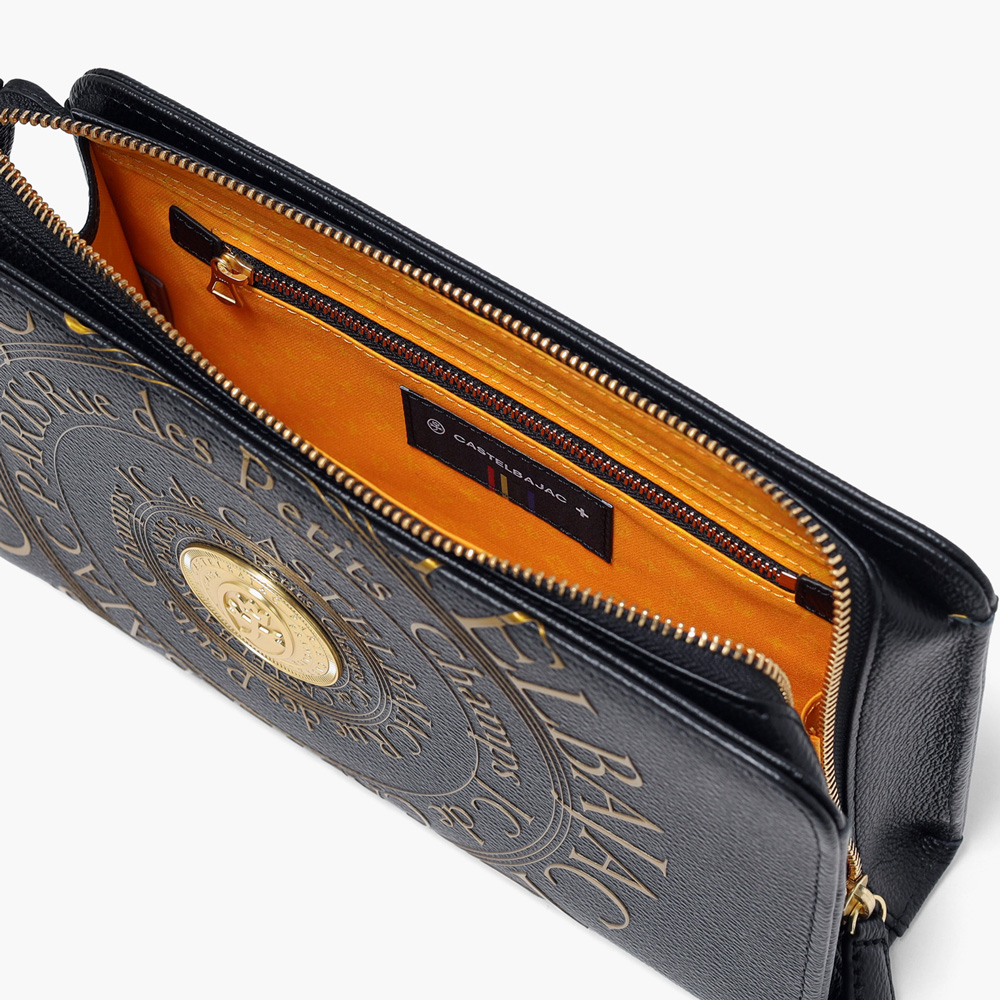 カステルバジャックのオールレザーで上質なクラッチバッグ。フランスのコインをモチーフにした立体的なゴールドプレートと、その周りに施されたゴールドプリントがハイグレードな男っぽさを演出します。ゴールドが映える、クロと白の2色展開です。持ち物のアクセントになるので派手好きの方にはぴったりなアイテムとなっております。