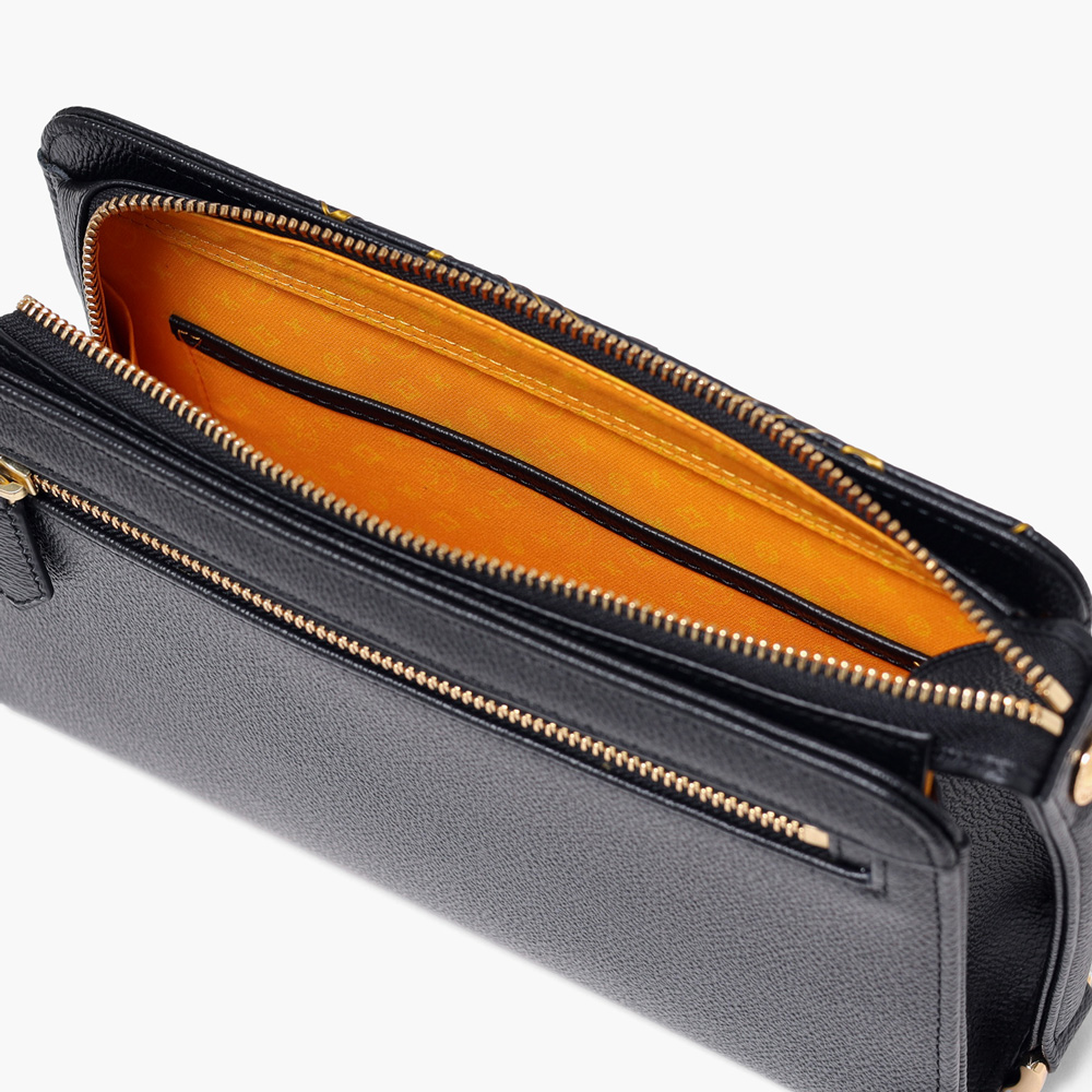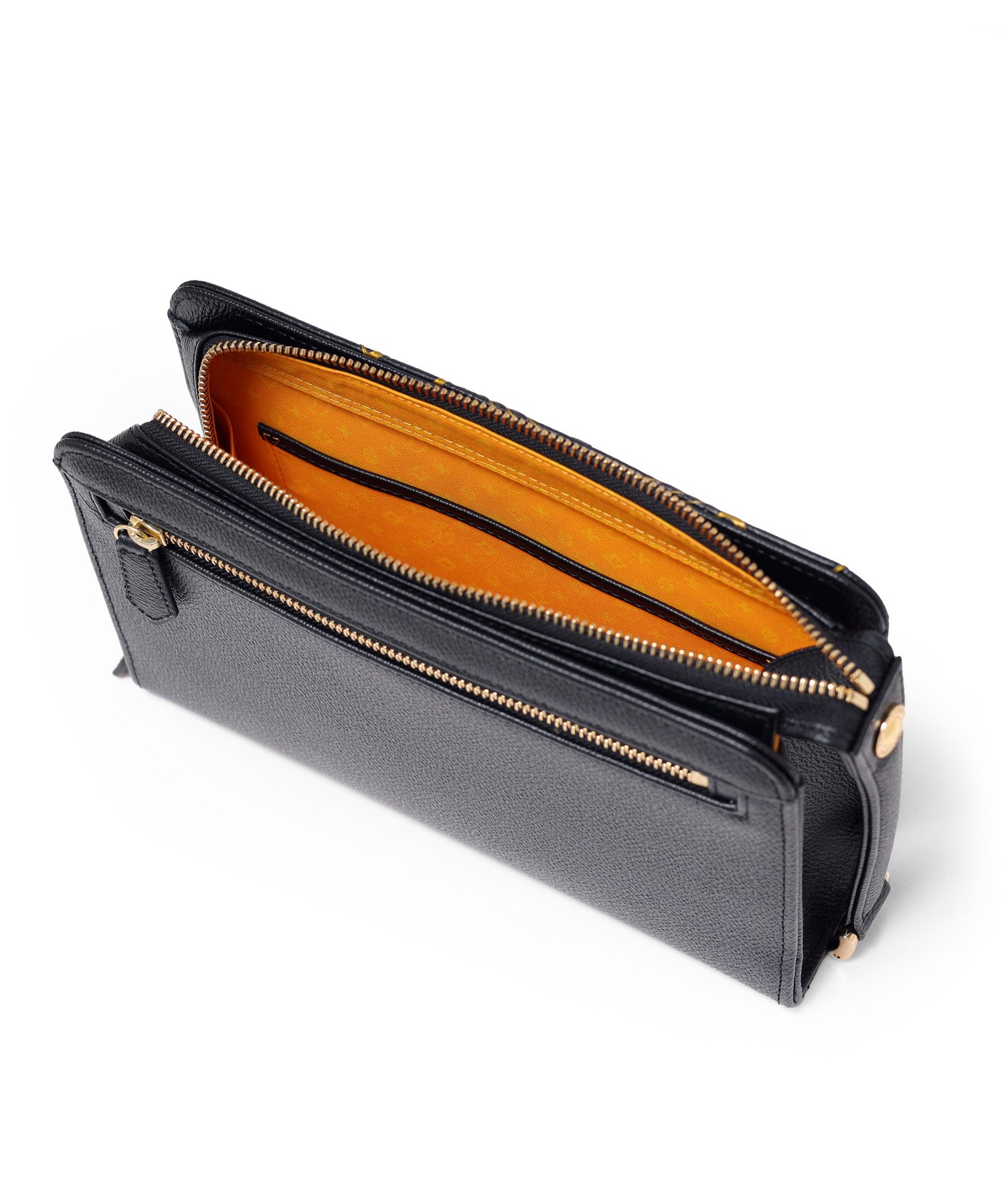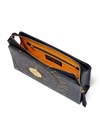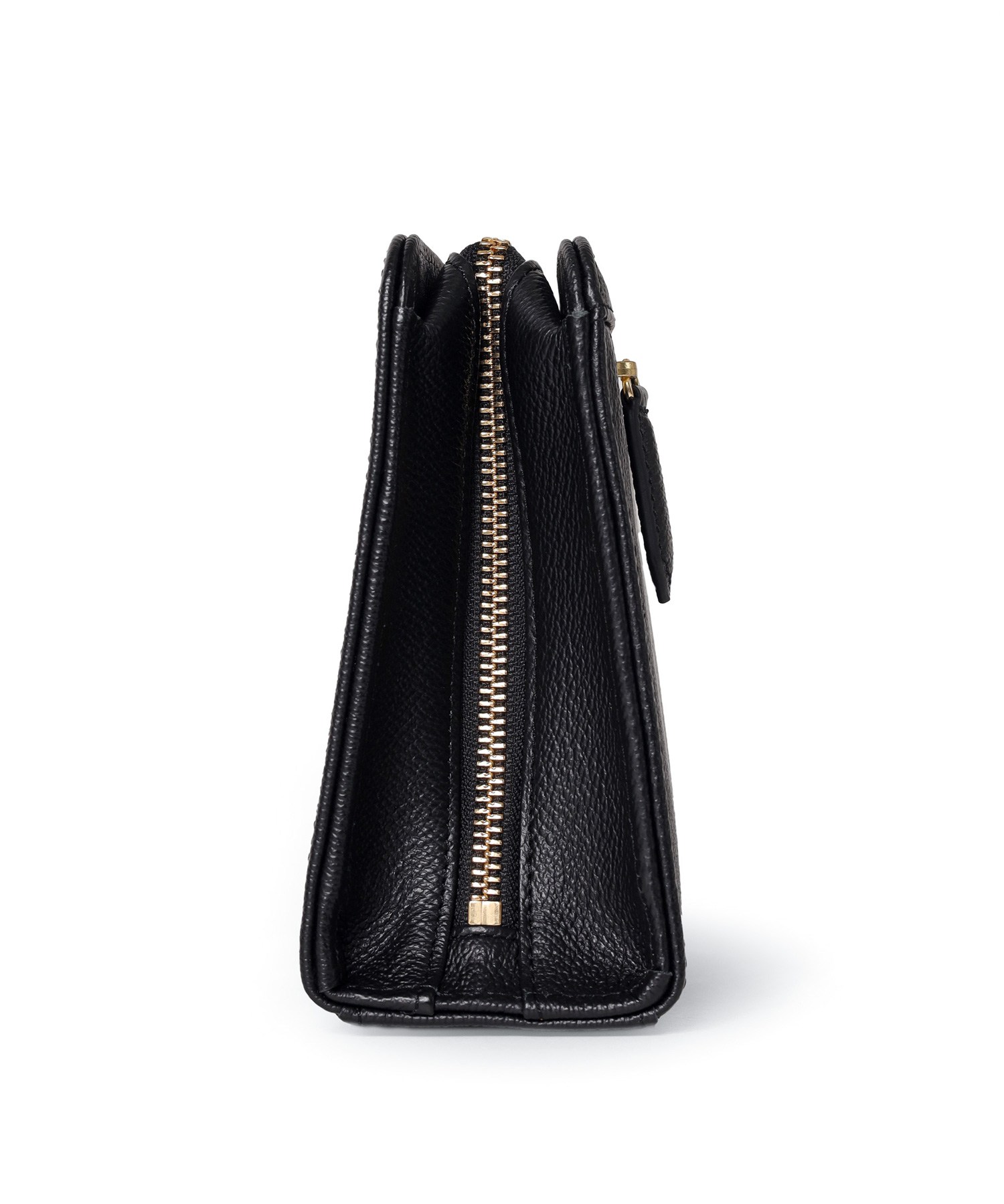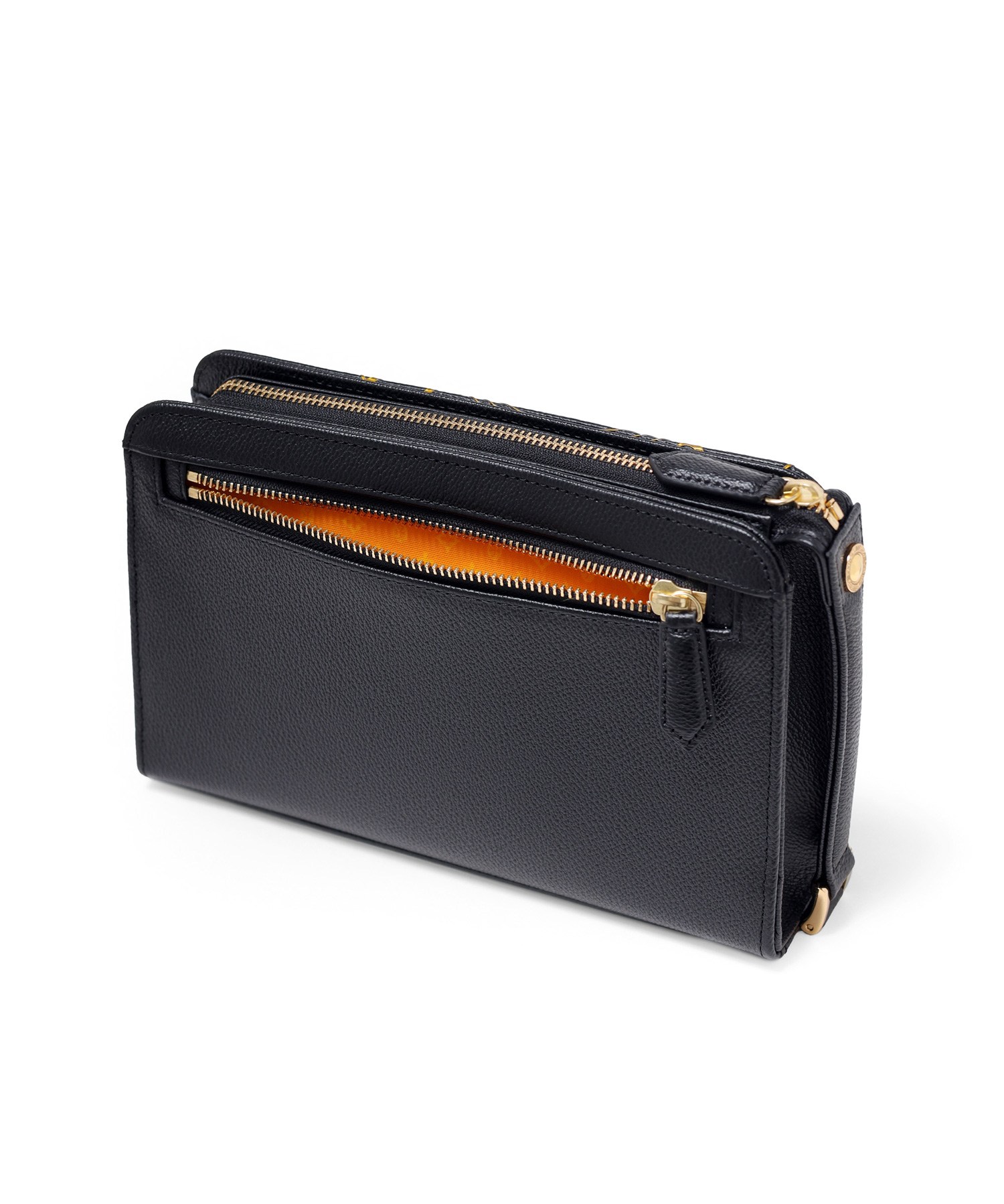 オールレザーの上質なクラッチバッグ。フランスのコインをモチーフにした立体的なゴールドプレートと、その周りに施されたゴールドプリントがハイグレードな男らしさを演出するデザインです。