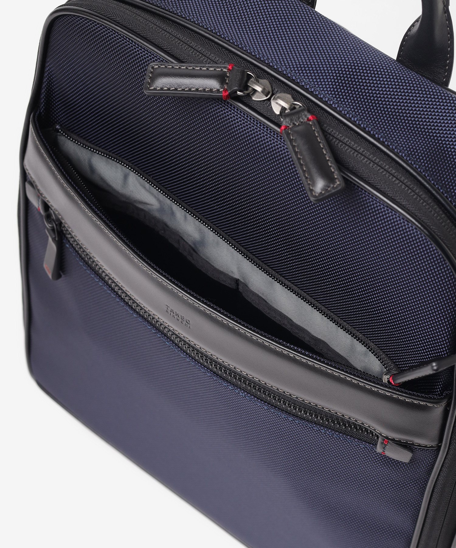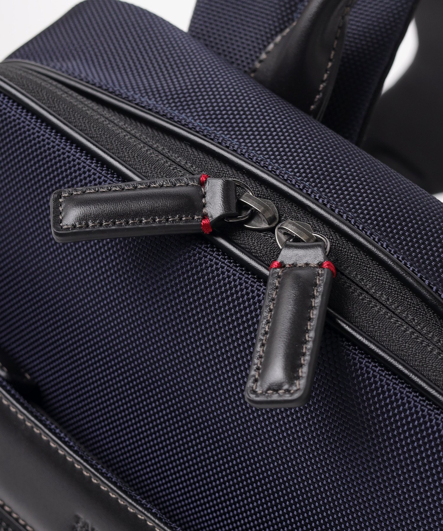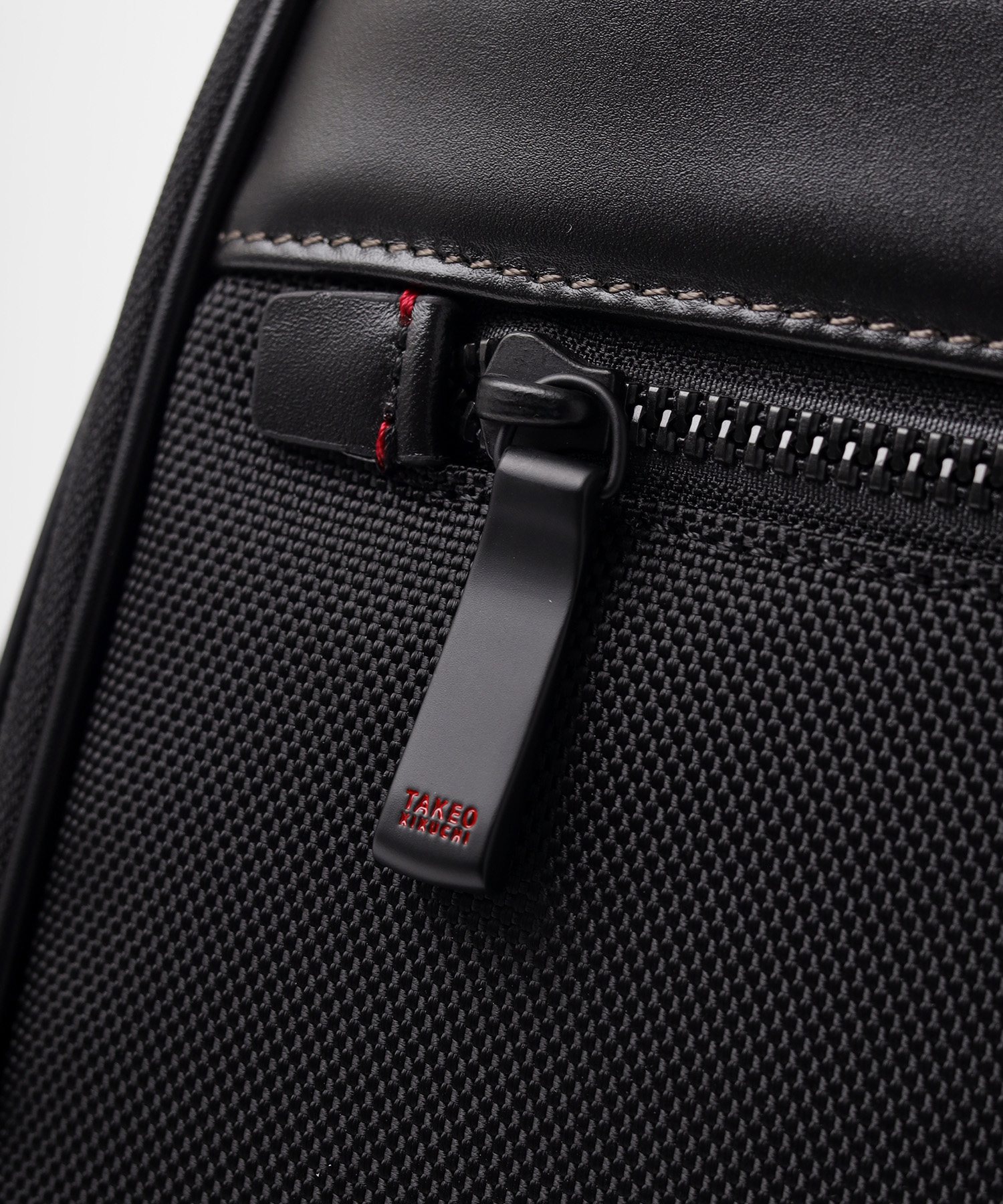 メイン素材には、耐久性に優れた太番手の1680Dナイロンを採用。摩擦や引き裂きに強く、毎日ハードに使い込んでも型崩れしにくいタフさが特徴です。この無骨な質感のナイロンに、光沢の美しい上品なスムースレザーをポイントで取り入れることで、ビジネスシーンに相応しい上品な印象に仕上げています。機能的な強さと、大人が持つに相応しい落ち着いたルックスを両立させた素材使いです。