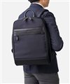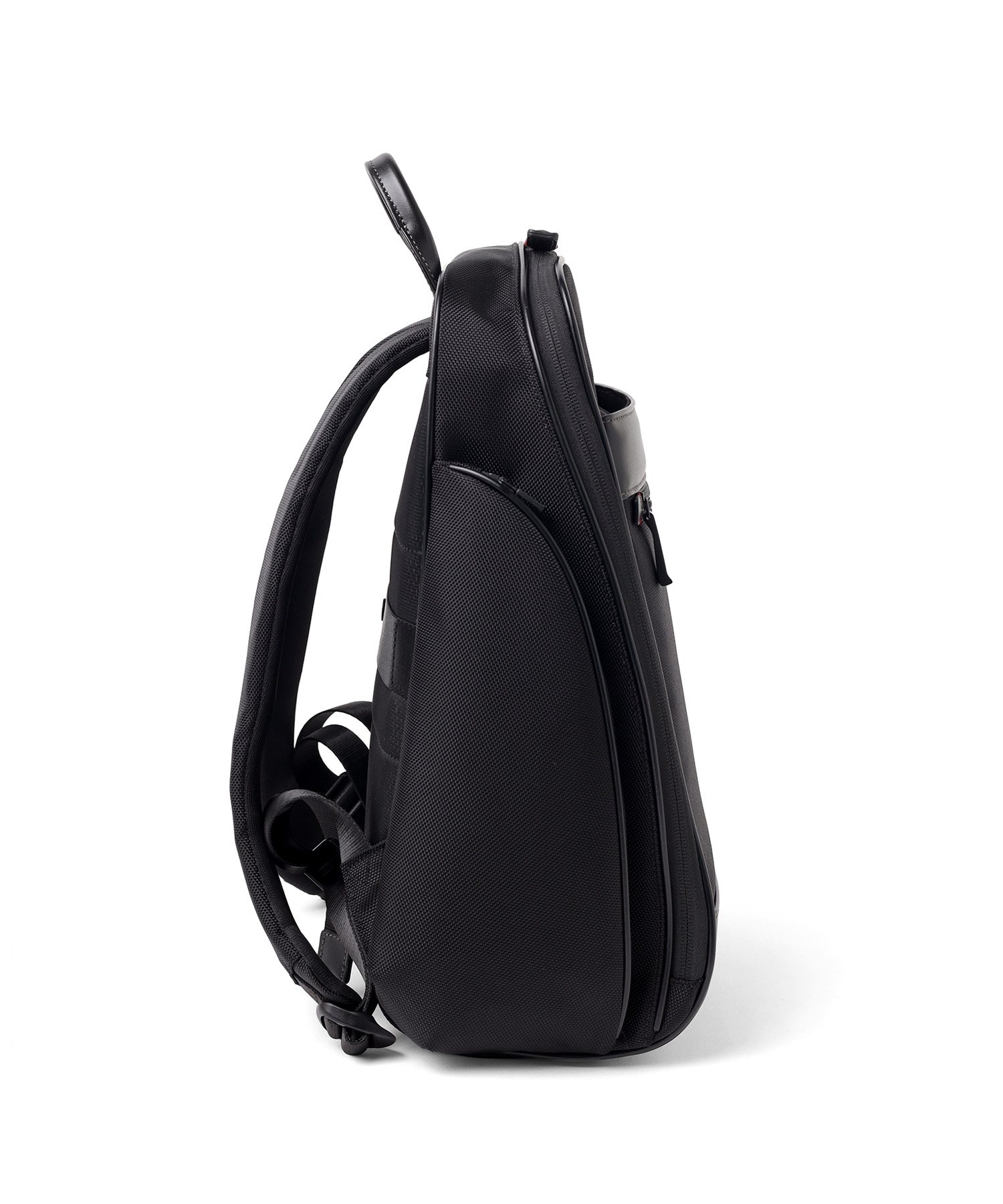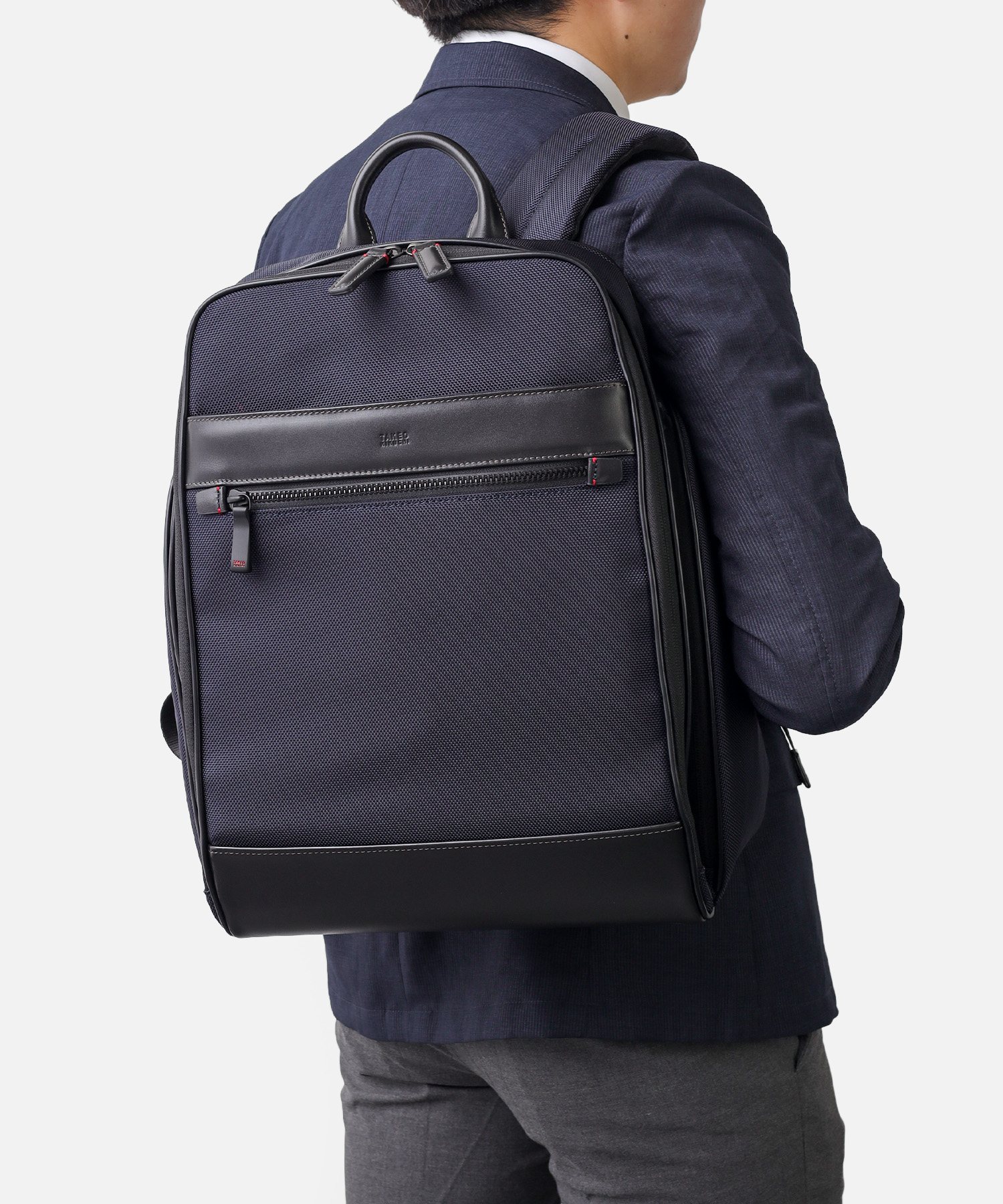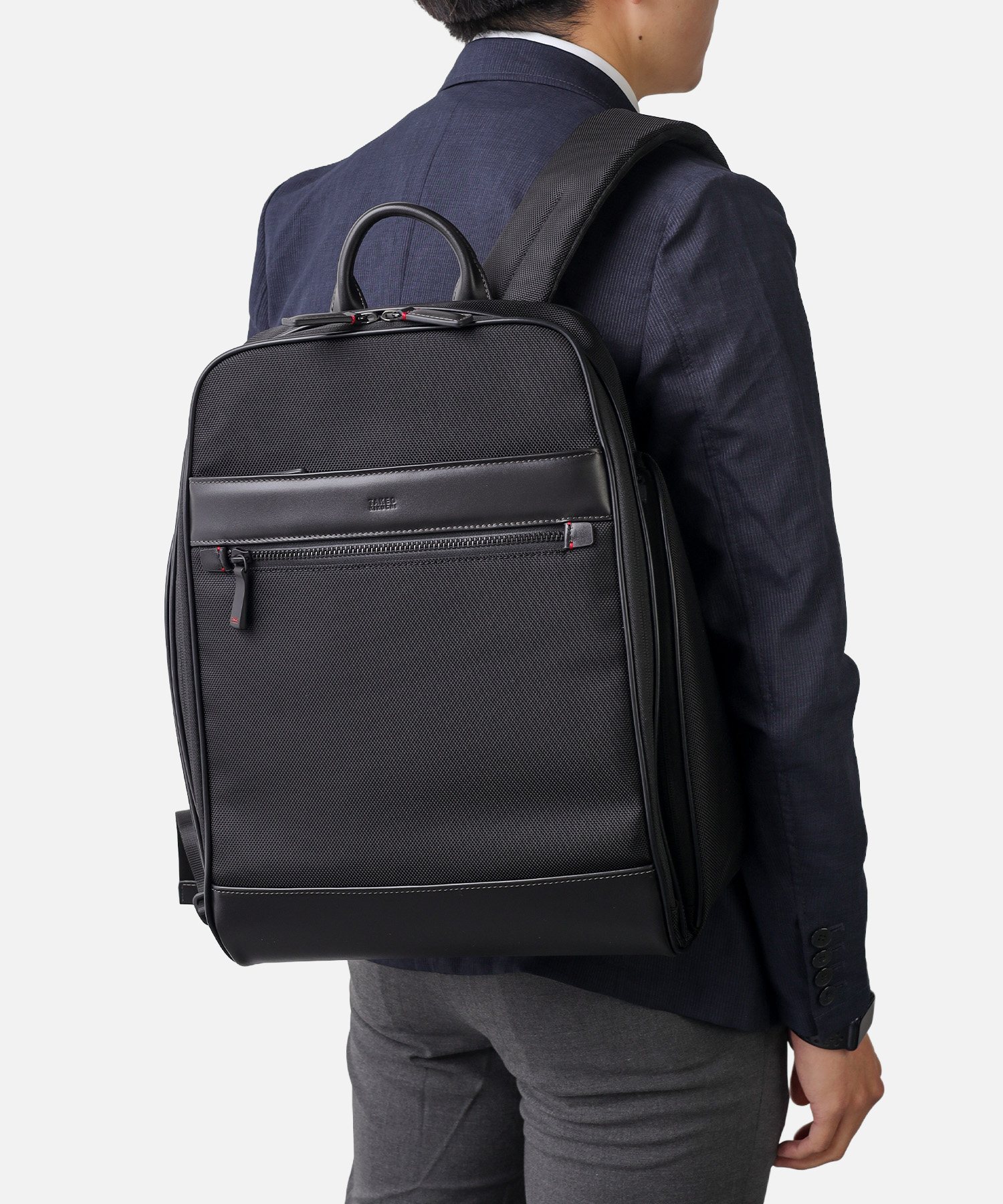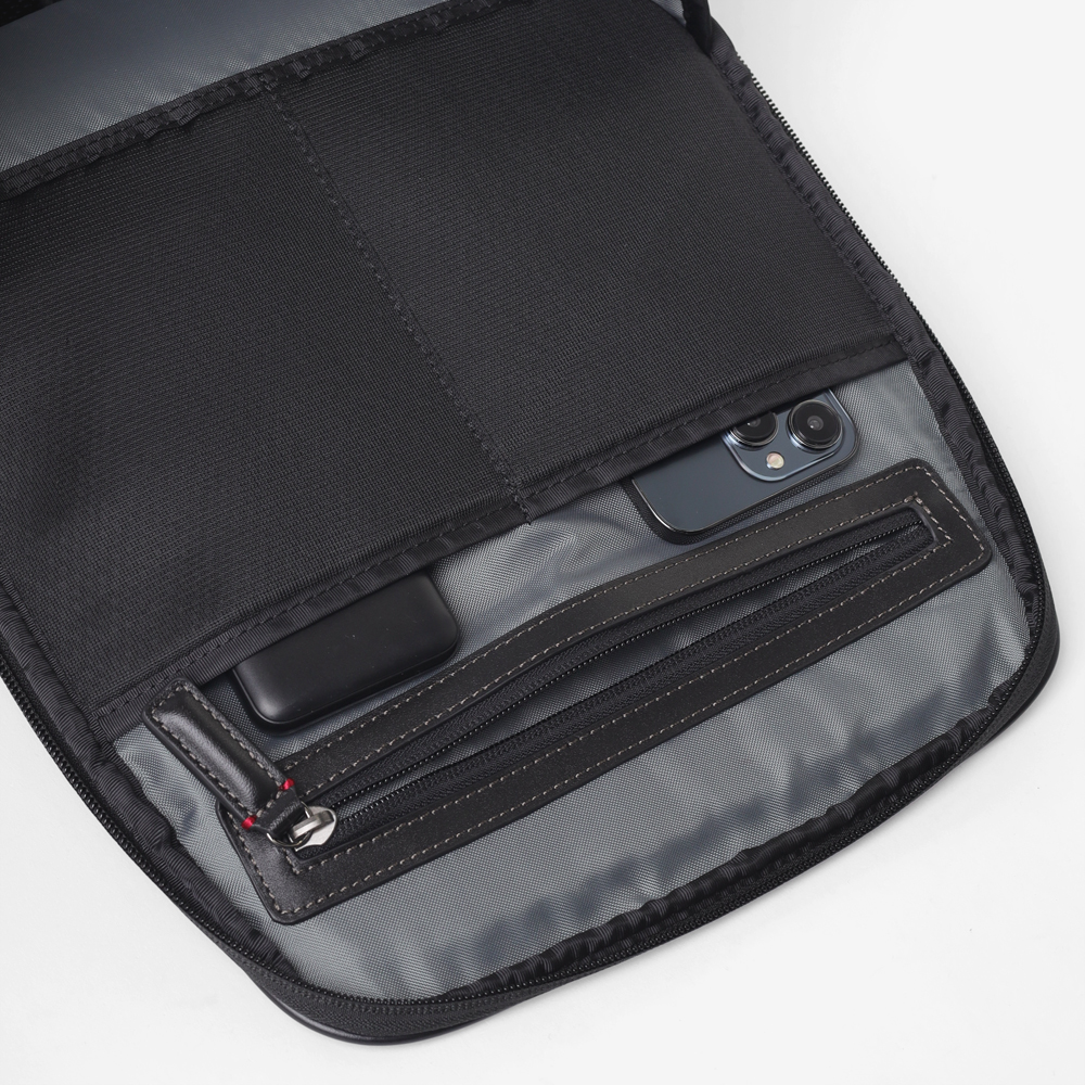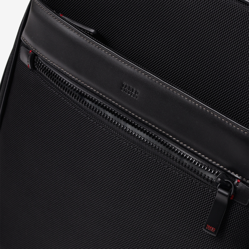1680Dの強靭なナイロンに、上品なスムースレザーを組み合わせたビジネスカジュアルリュック。スーツにもカジュアルにも馴染む落ち着いたデザインながら、19リットルの容量を備え、A4ファイルや13.3インチPCの収納に対応するなど、現代のワークスタイルに必要な実用性を凝縮しました。背面にはキャリーオン機能を搭載しており、日々の通勤はもちろん、フットワークが求められる出張シーンまで幅広くカバー。オン・オフを問わず、長く使い続けられるスタンダードなビジネスリュックです。