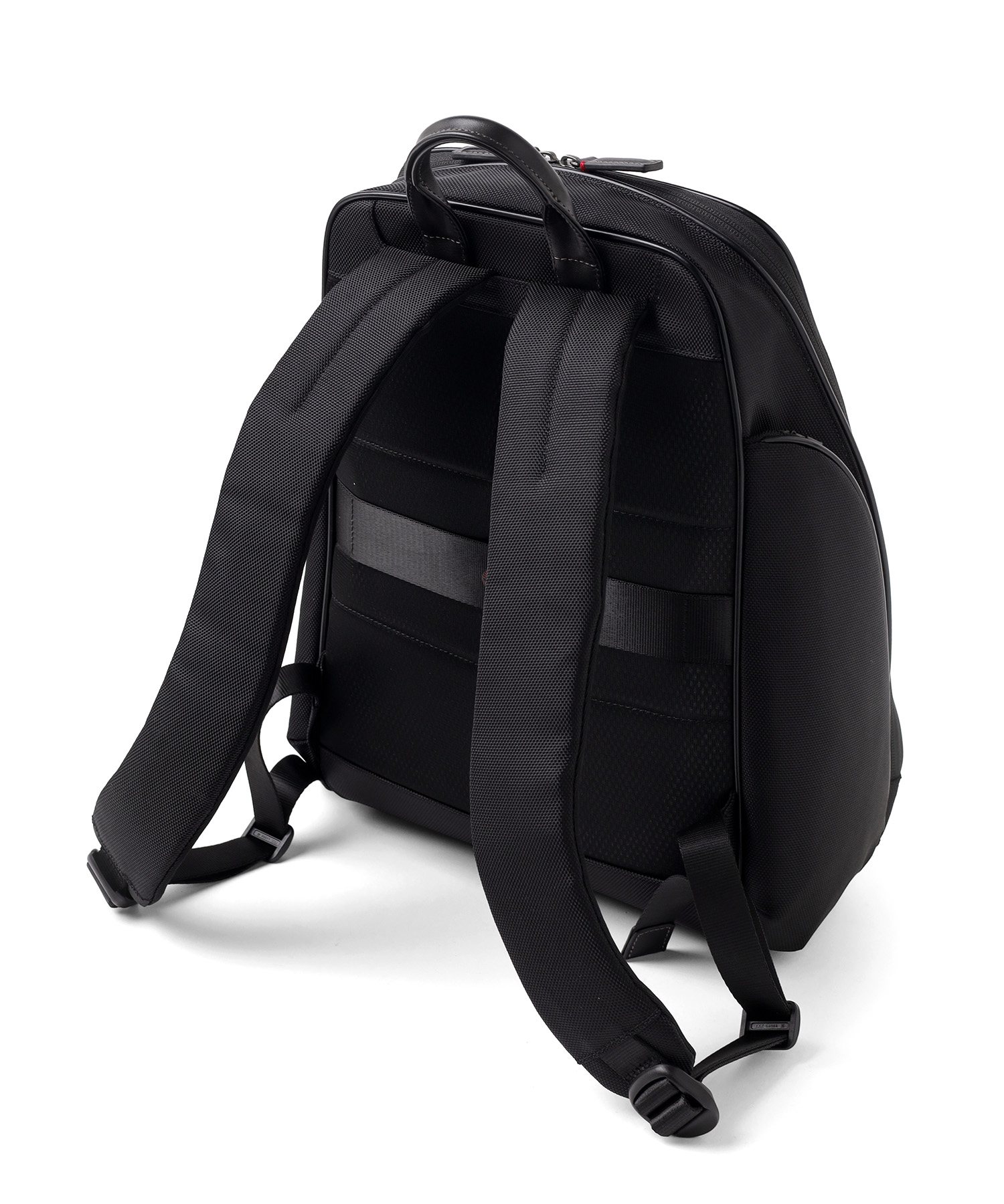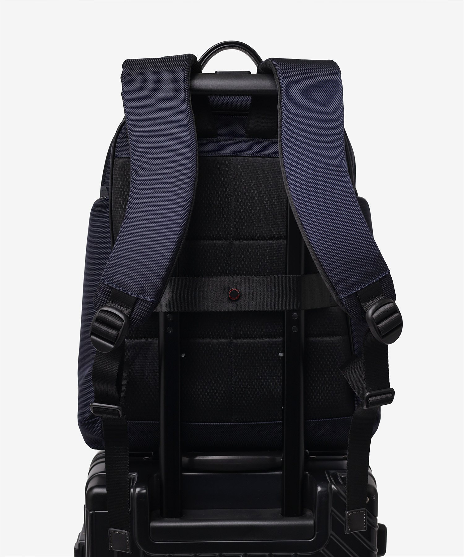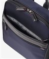 バッグ背面には、スーツケースのハンドルバーに固定できるセットアップ用のベルトを装備しました。出張や旅行など、荷物が多くなりがちな移動時でもバッグが安定し、肩への負担を大幅に軽減してくれます。キャリーケースと一体化させて持ち運べるため、駅や空港での長距離移動もスムーズ。アクティブに動くビジネスパーソンの利便性を考慮した、実用性の高い機能です。