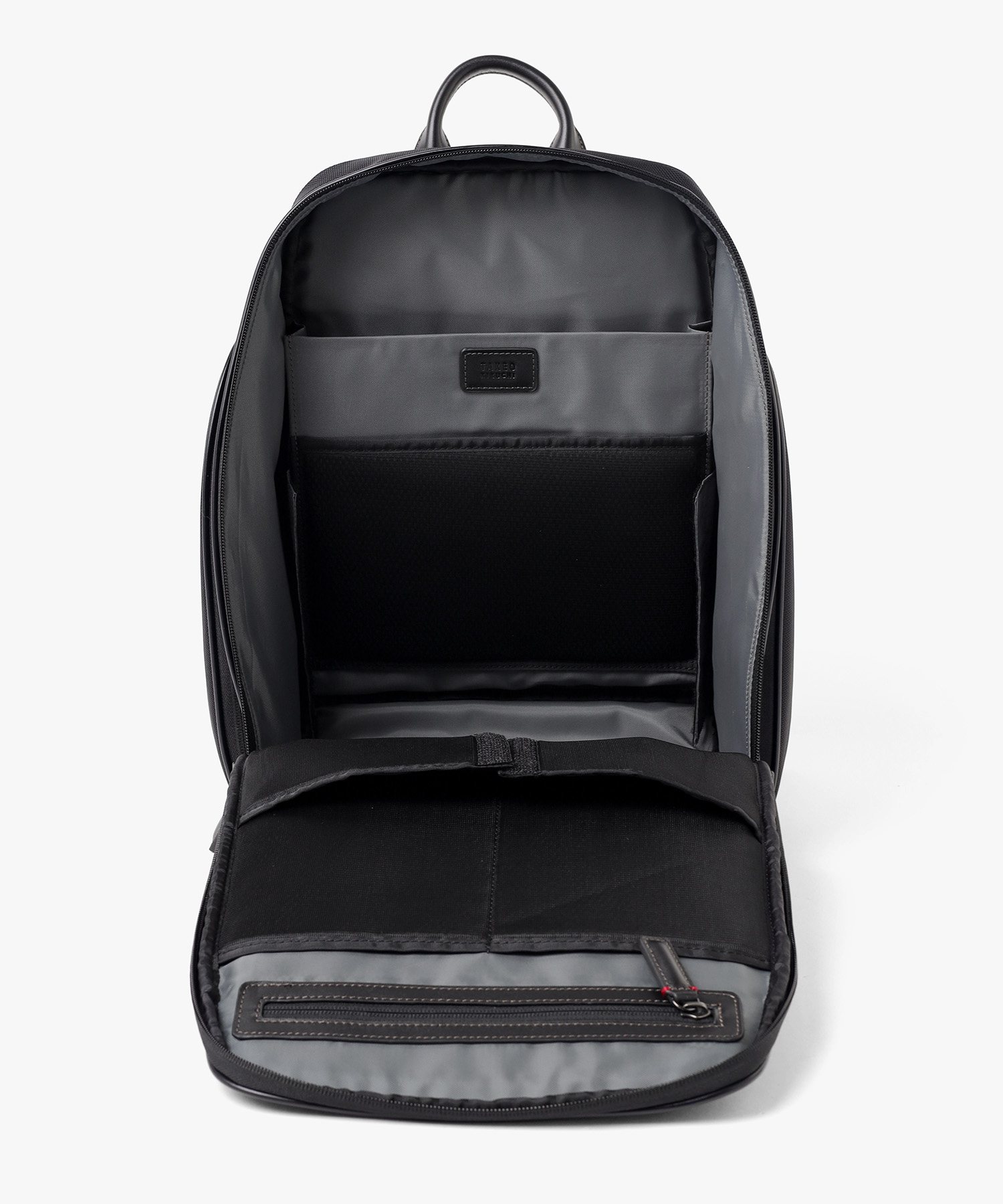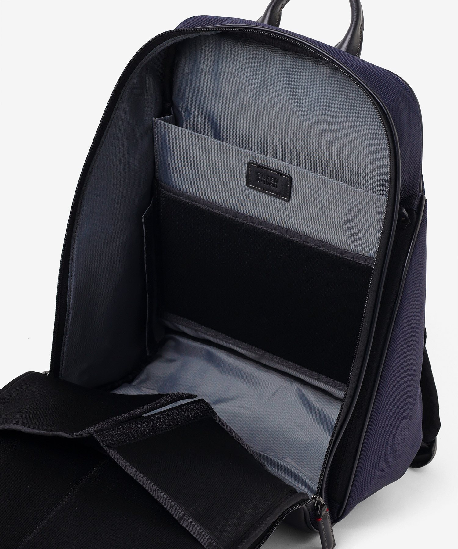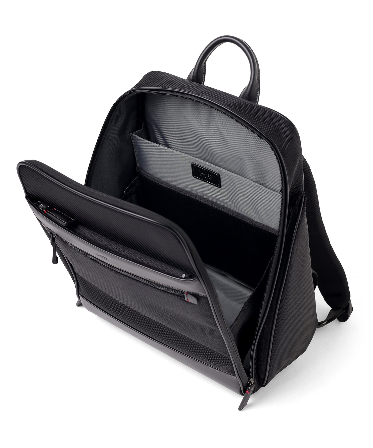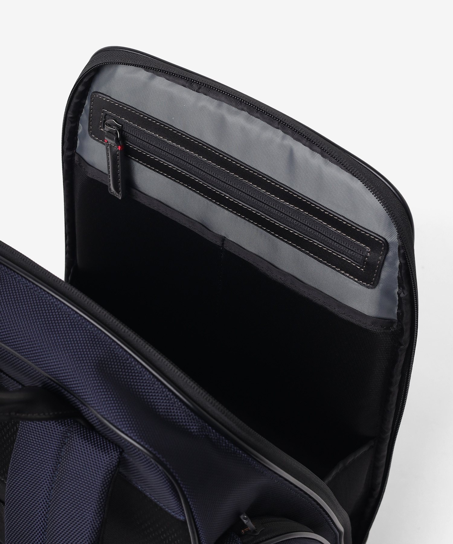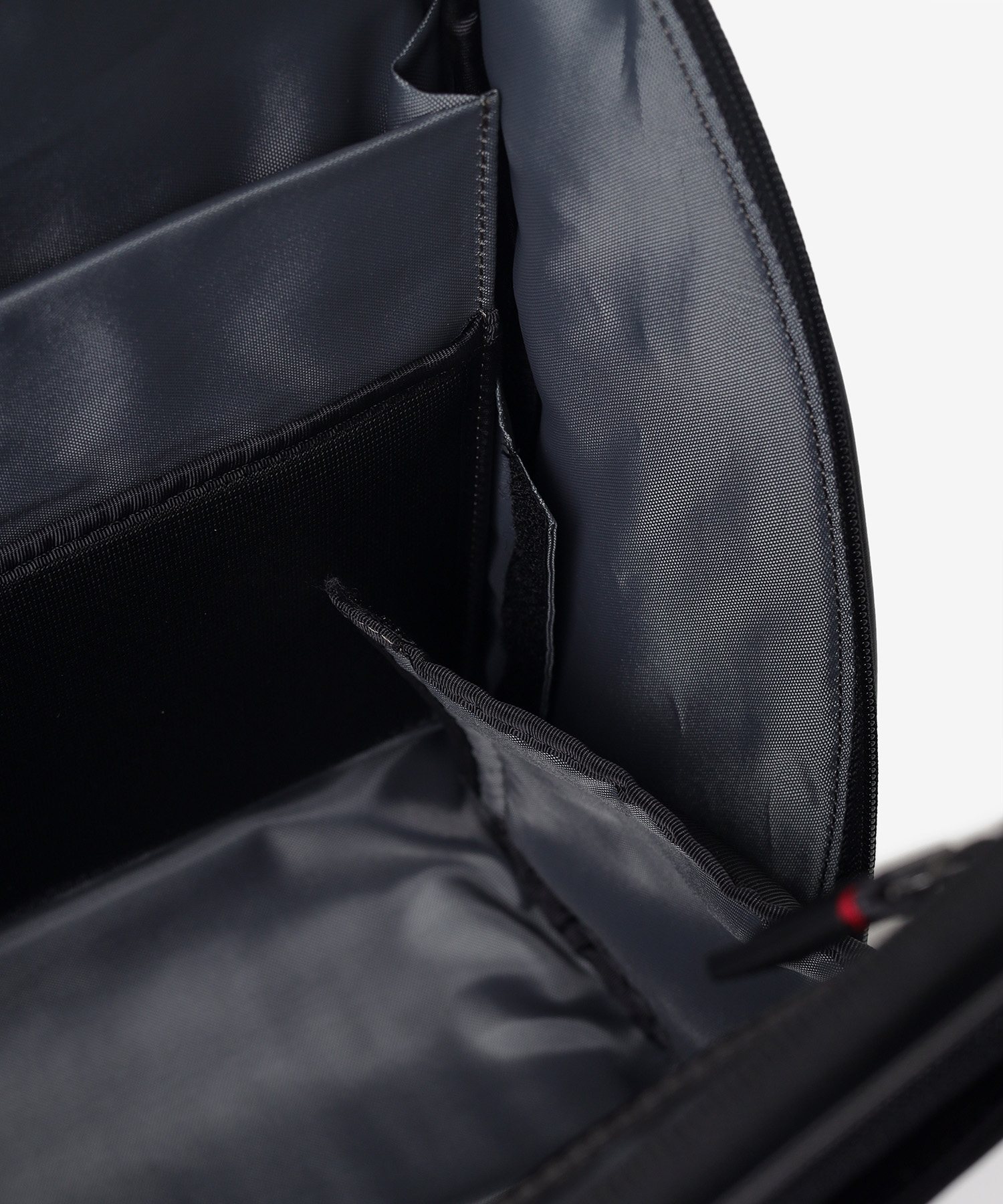 メインルームは、中身をパッと確認できる大きな開口部が特徴です。内側のベルクロを外せば、最大90度まで大きく開くことができる構造を採用しました。バッグの奥に収納した荷物もスムーズに取り出せるため、荷物整理の際のストレスを軽減します。移動中や会議前など、必要なものをサッと取り出したい場面でも、迷うことなくスマートにアクセス可能です。