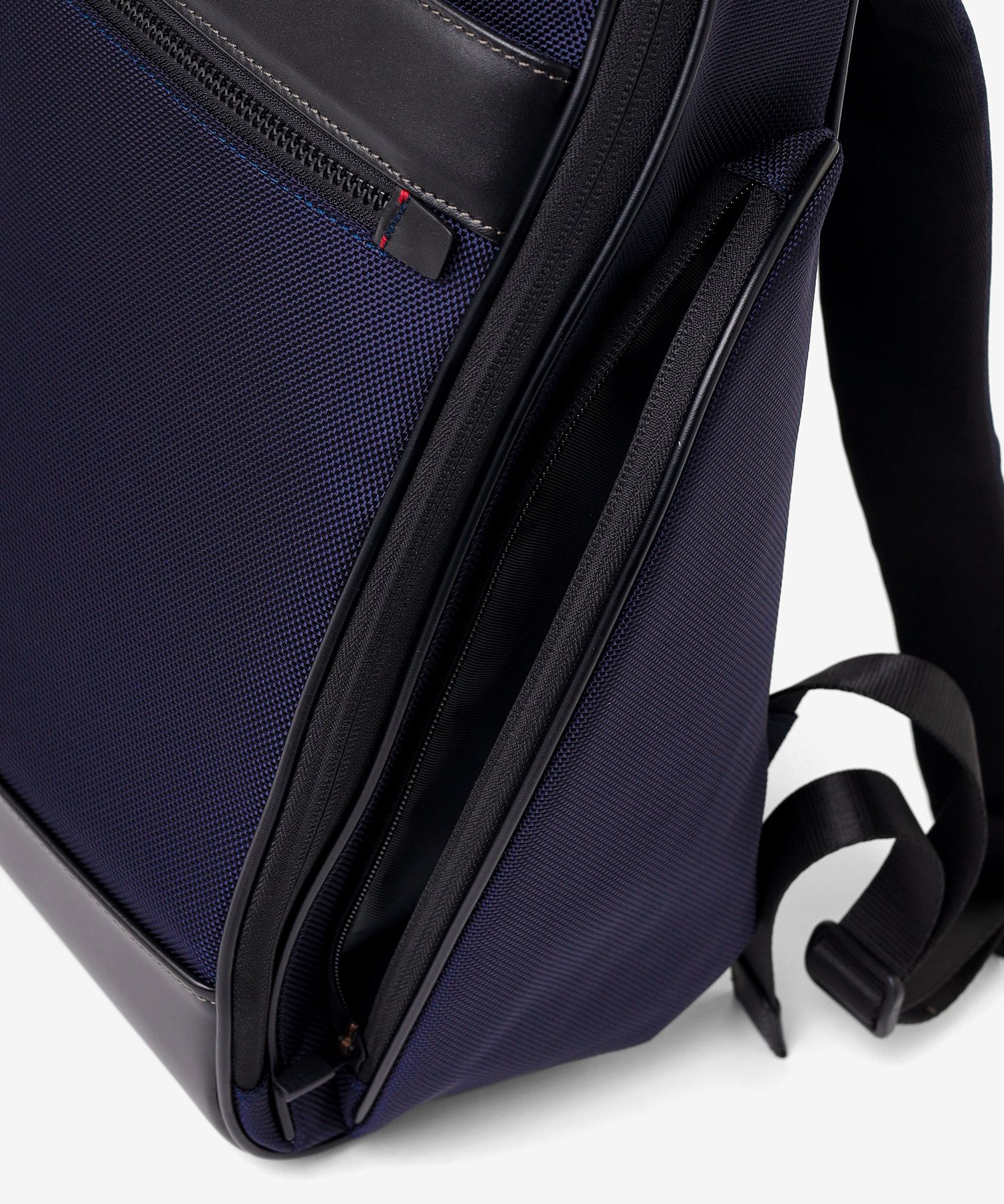 1680Dナイロンと艶感のあるレザーを組み合わせた、洗練されたビジネスカジュアルリュック。A4サイズ対応で13.3インチPCも収納可能な実用的なサイズ感に加え、背面にはキャリーオン機能を搭載しており、通勤はもちろん出張シーンにも最適です。本体素材には、太番手で耐久性に優れた1680Dナイロンを採用。しっかりとした無骨な質感に、光沢の美しいスムースレザーを組み合わせることで、機能性と上品さを兼ね備えた仕上がりになっています。