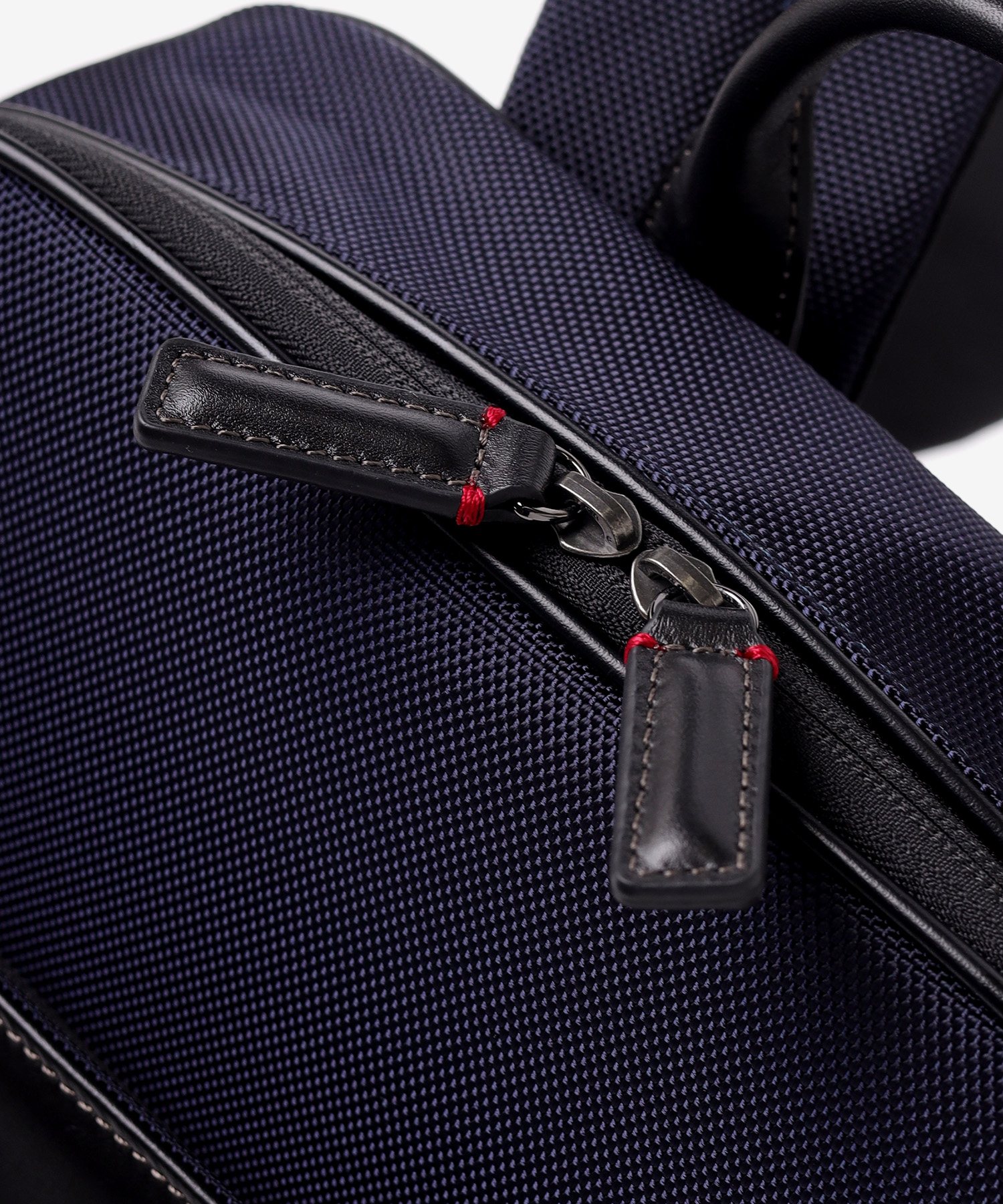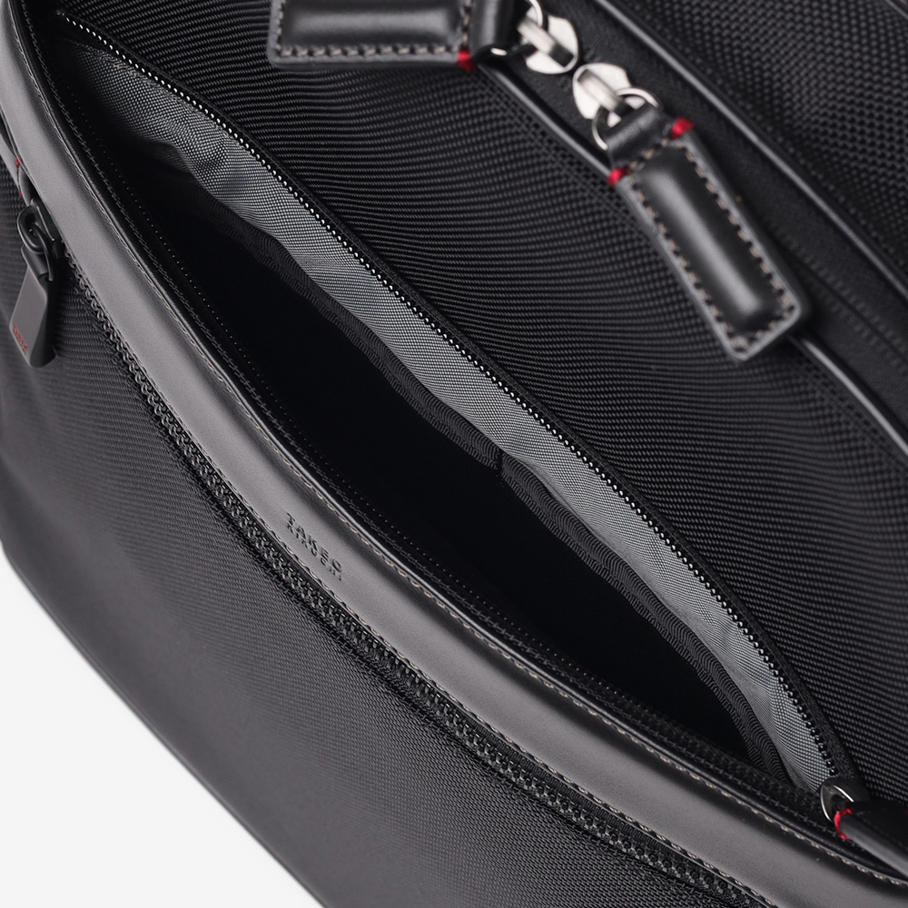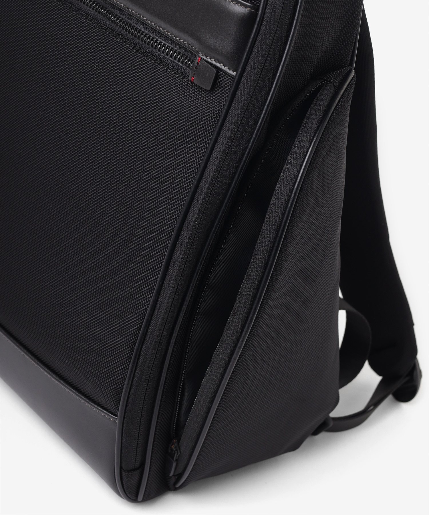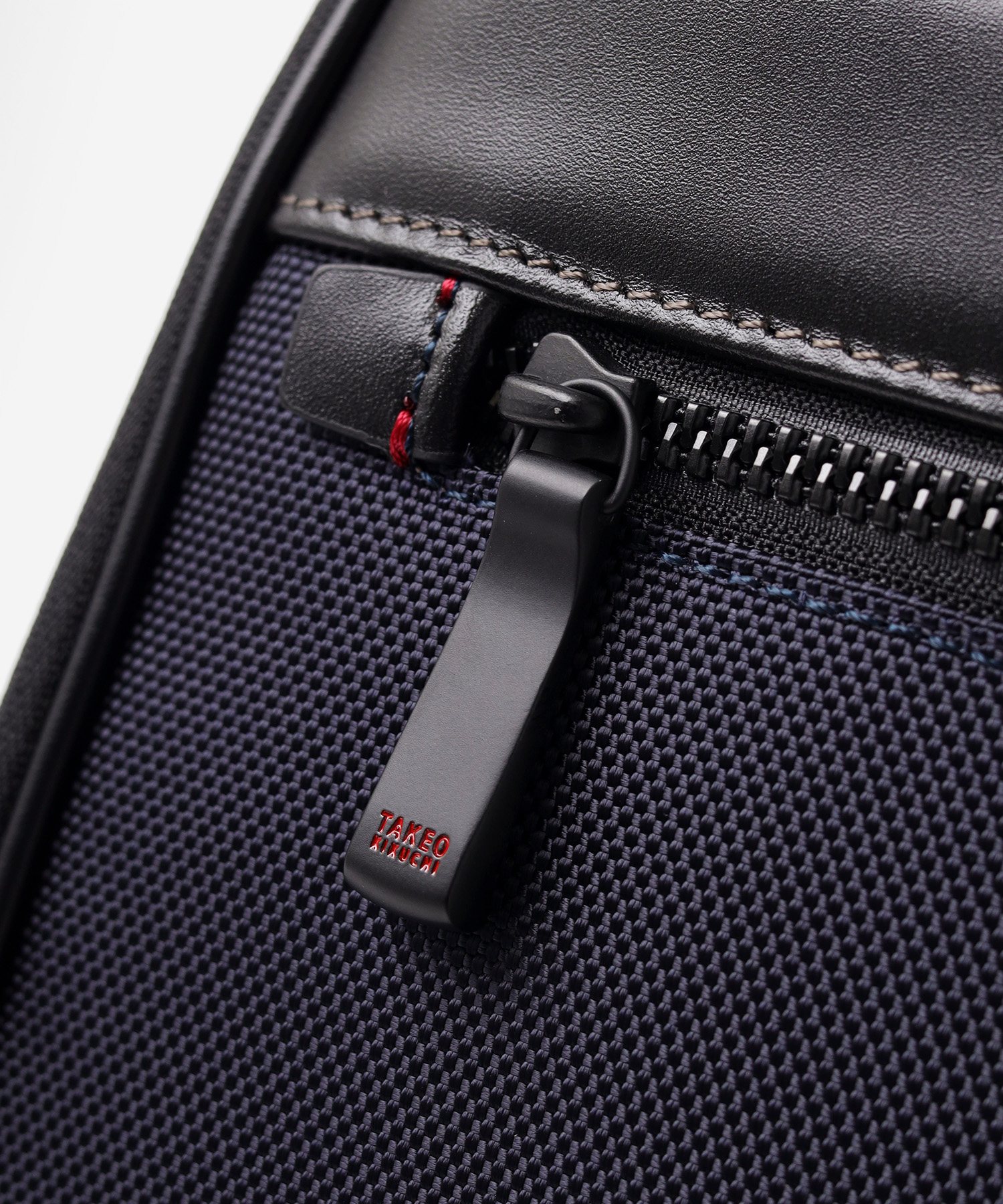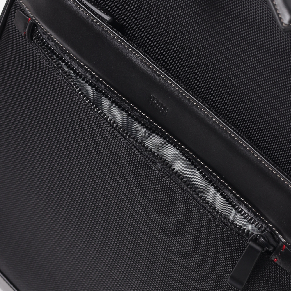 メイン素材には、耐久性に優れた太番手の1680Dナイロンを採用。摩擦や引き裂きに強く、毎日ハードに使い込んでも型崩れしにくいタフさが特徴です。この無骨な質感のナイロンに、光沢の美しい上品なスムースレザーをポイントで取り入れることで、ビジネスシーンに相応しい上品な印象に仕上げています。機能的な強さと、大人が持つに相応しい落ち着いたルックスを両立させた素材使いです。
