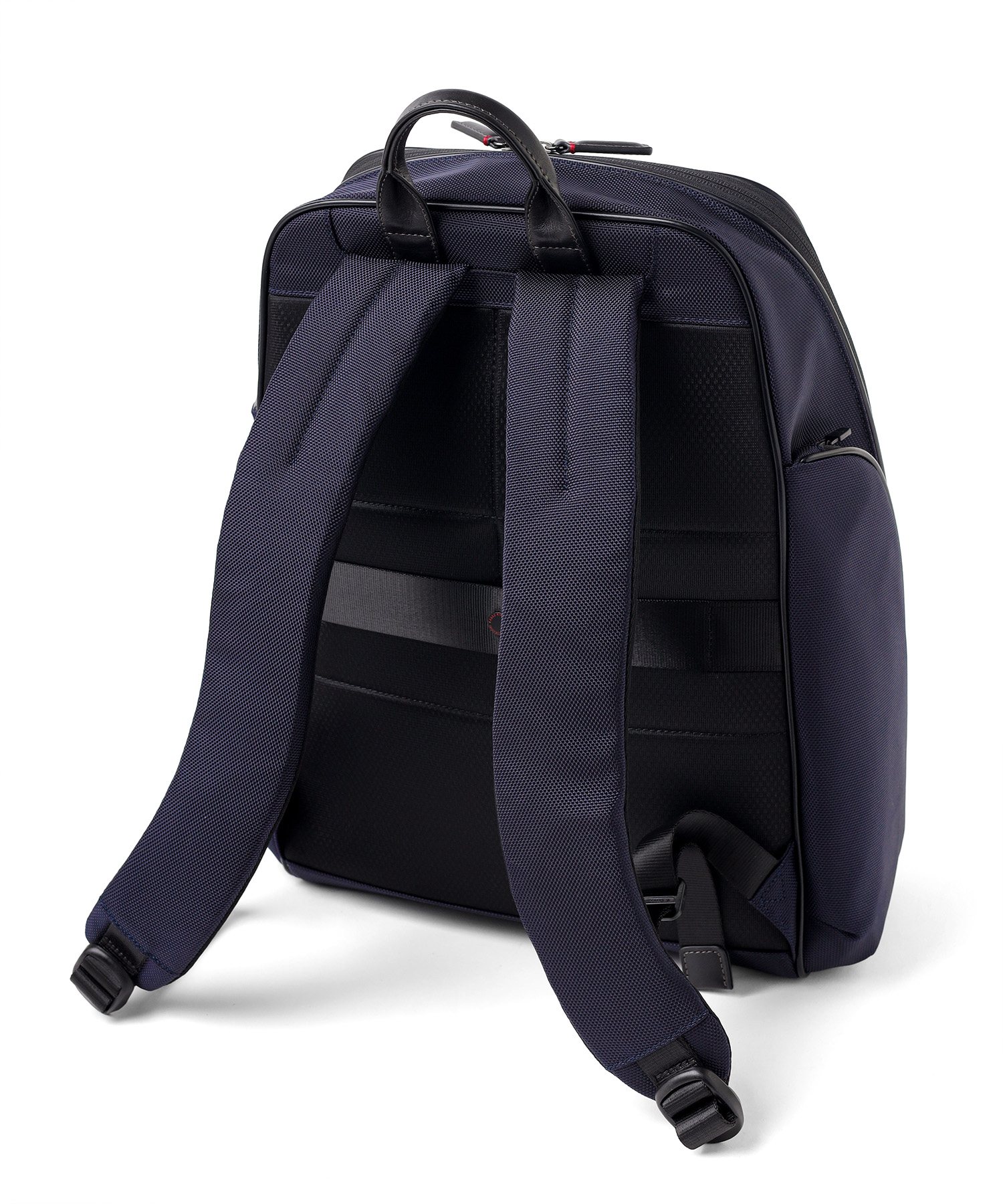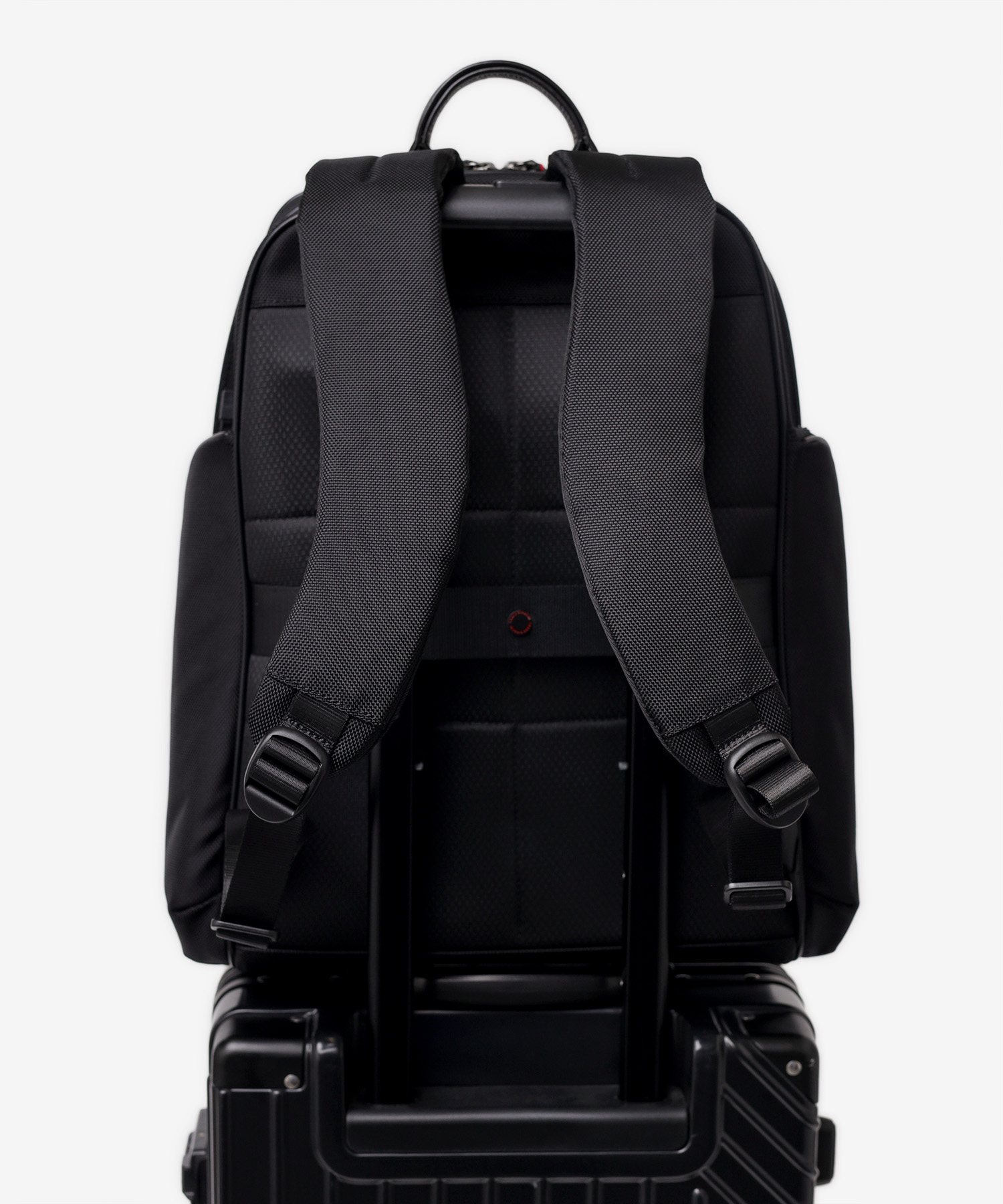 バッグ背面には、スーツケースのハンドルバーに固定できるセットアップ用のベルトを装備しました。出張や旅行など、荷物が多くなりがちな移動時でもバッグが安定し、肩への負担を大幅に軽減してくれます。キャリーケースと一体化させて持ち運べるため、駅や空港での長距離移動もスムーズ。アクティブに動くビジネスパーソンの利便性を考慮した、実用性の高い機能です。