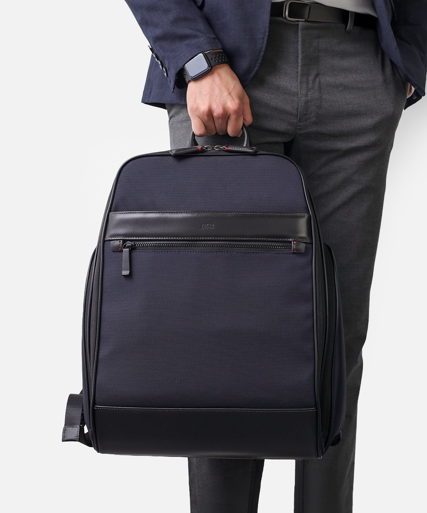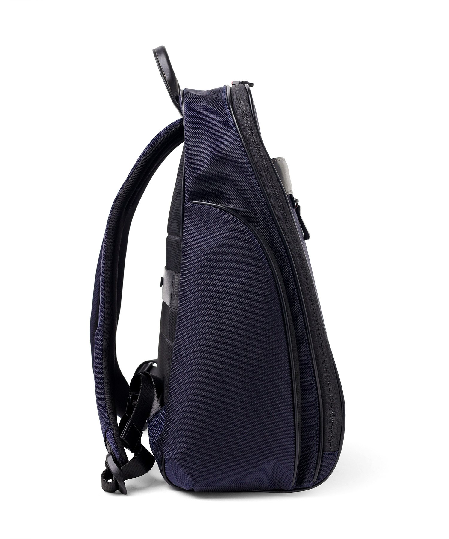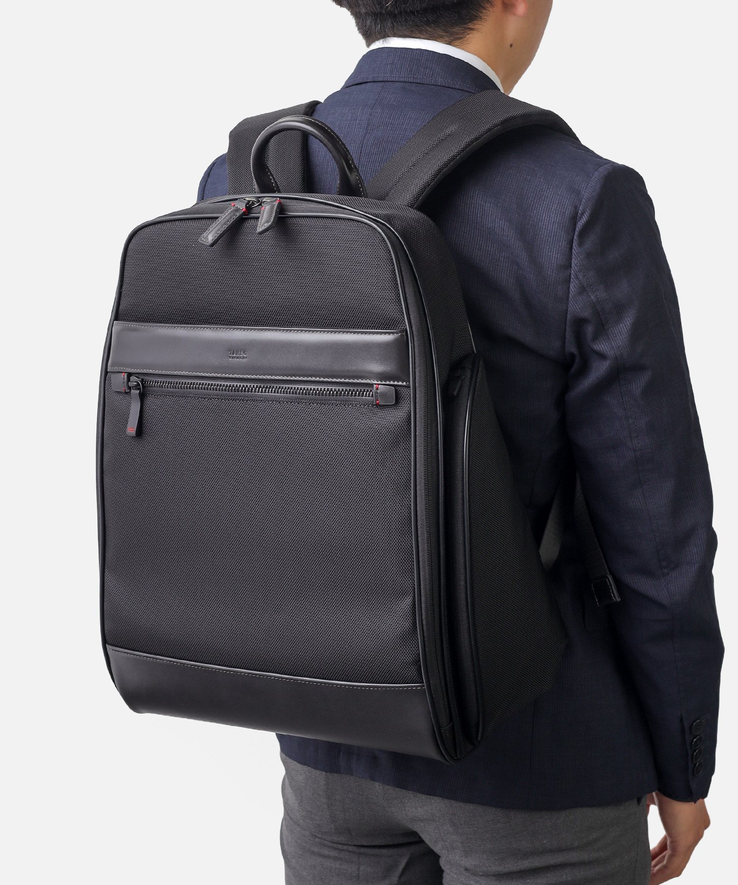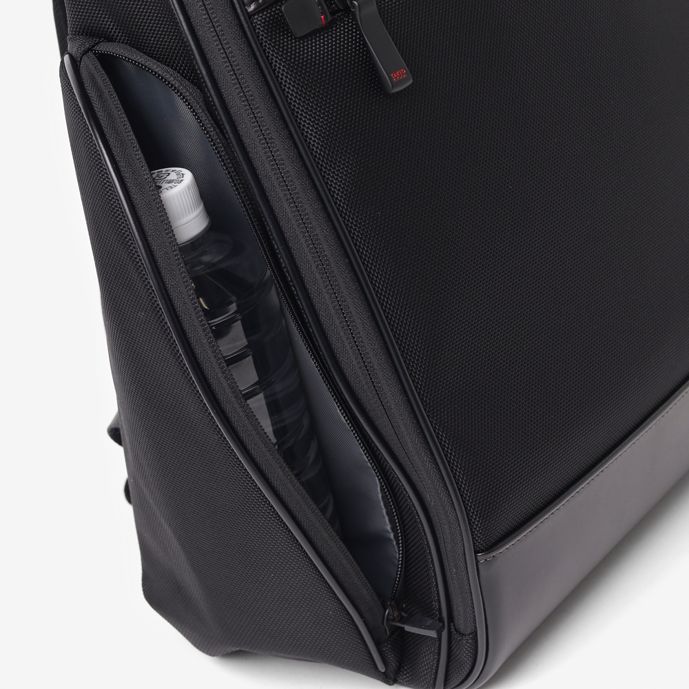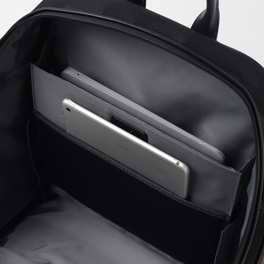 1680Dの強靭なナイロンに、上品なスムースレザーを組み合わせたビジネスカジュアルリュック。スーツにもカジュアルにも馴染む落ち着いたデザインながら、25リットルの容量を備え、B4ファイルや15.6インチPCの収納に対応するなど、現代のワークスタイルに必要な実用性を凝縮しました。背面にはキャリーオン機能を搭載しており、日々の通勤はもちろん、フットワークが求められる出張シーンまで幅広くカバー。オン・オフを問わず、長く使い続けられるスタンダードなビジネスリュックです。