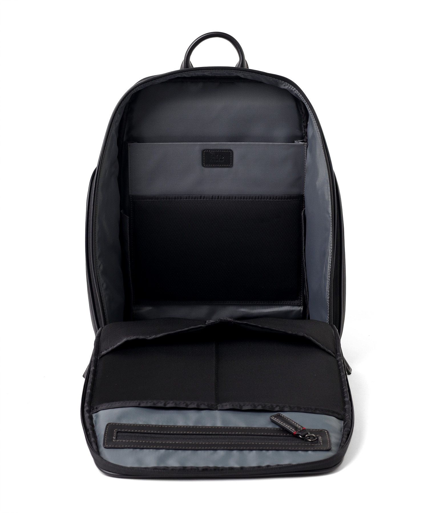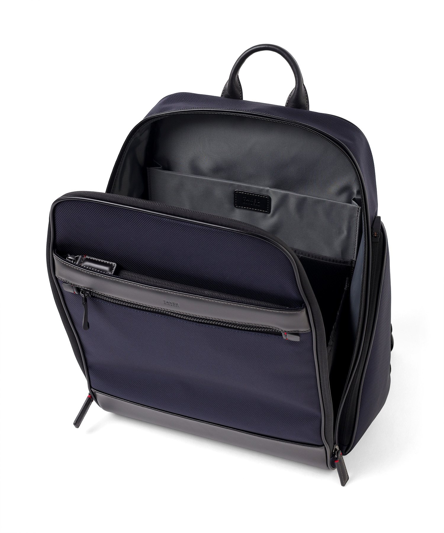 バッグのフォルムを維持しながらも、収納スペースの充実にもこだわりました。PC周辺機器や手帳などのビジネスツールを整理できる多彩なポケットを各所に配置。マチ幅をしっかり確保しているため、日常の荷物だけでなく、1泊程度の出張に必要な着替えなども十分に収まるキャパシティを備えています。「どこに何があるか」を把握しやすいレイアウトです。