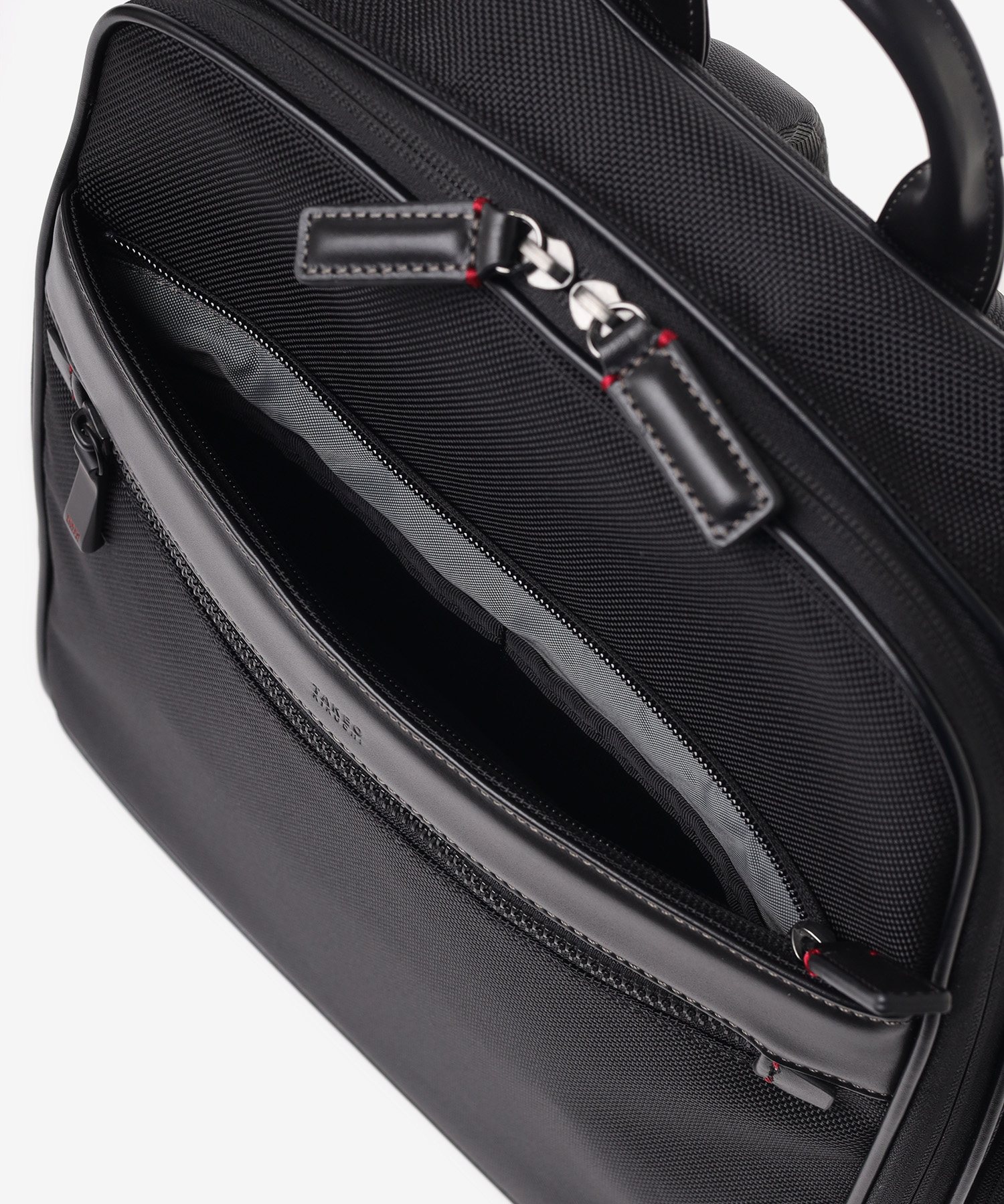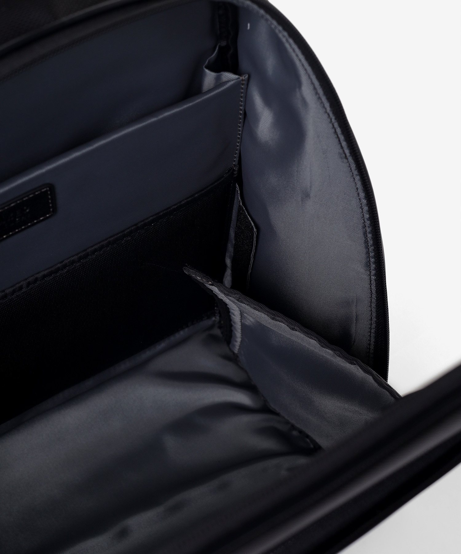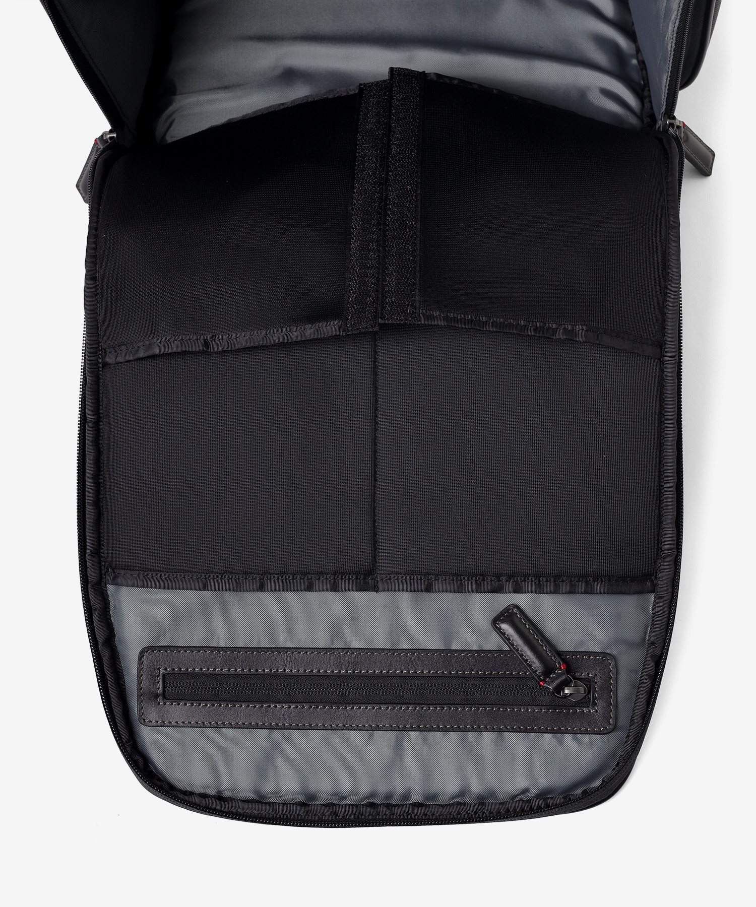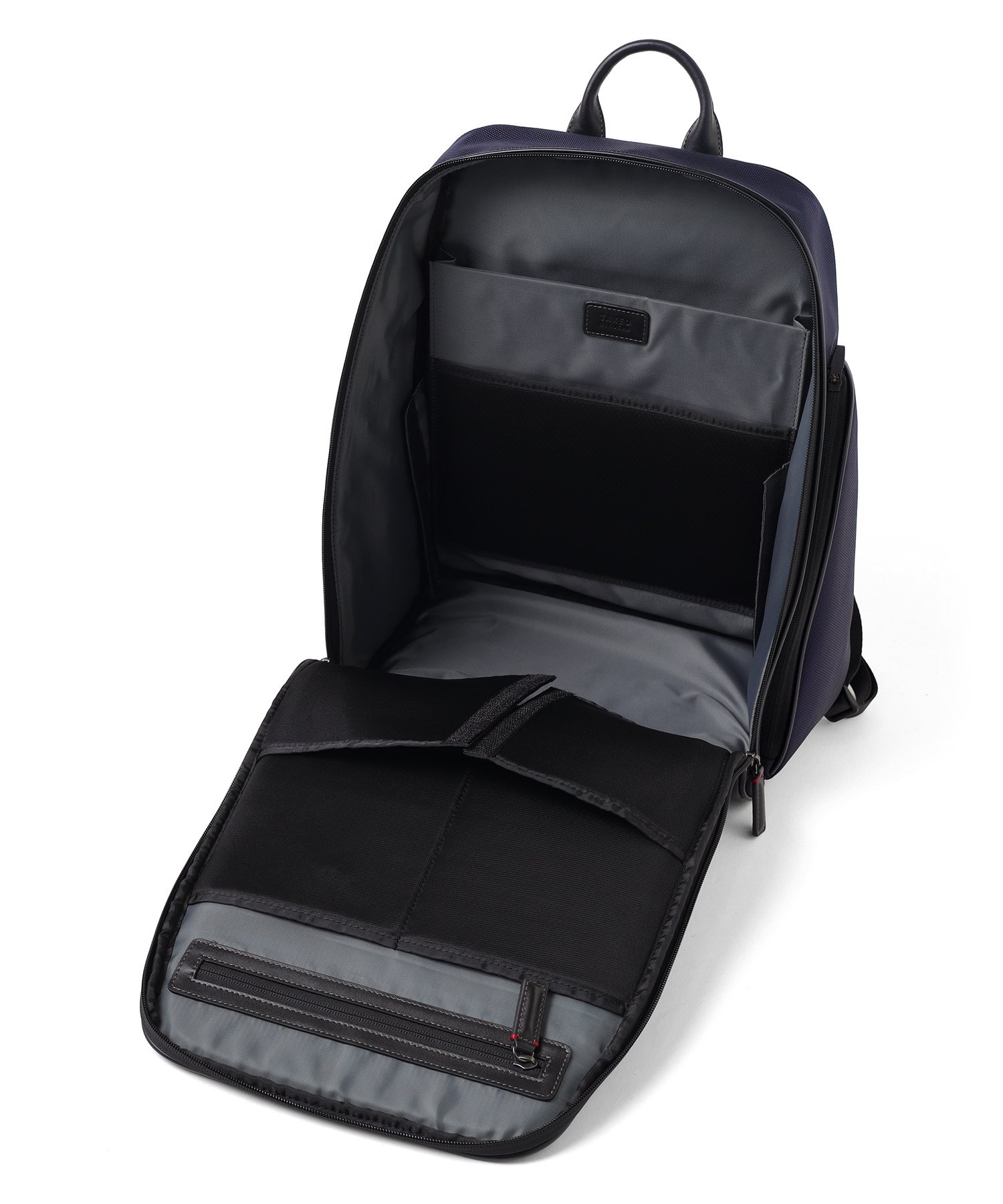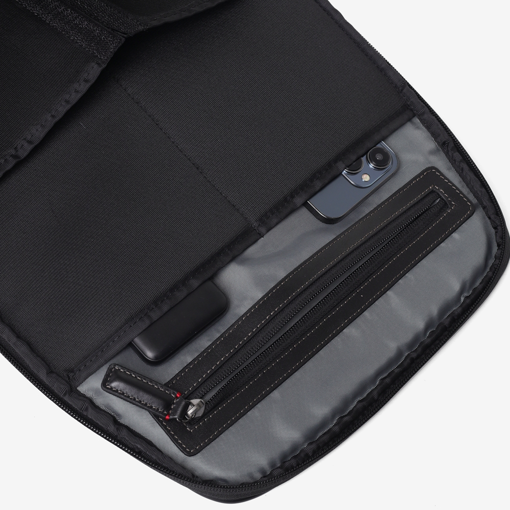 メインルームは、中身をパッと確認できる大きな開口部が特徴です。内側のベルクロを外せば、最大90度まで大きく開くことができる構造を採用しました。バッグの奥に収納した荷物もスムーズに取り出せるため、荷物整理の際のストレスを軽減します。移動中や会議前など、必要なものをサッと取り出したい場面でも、迷うことなくスマートにアクセス可能です。