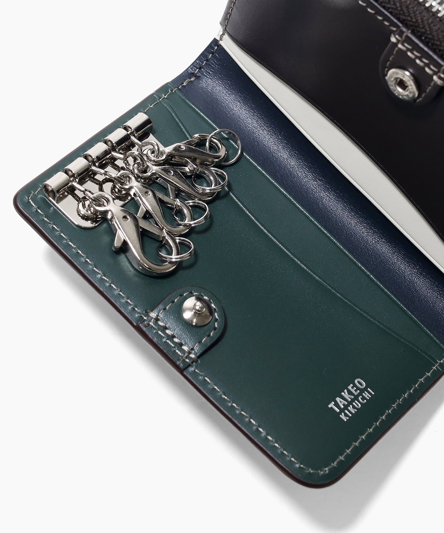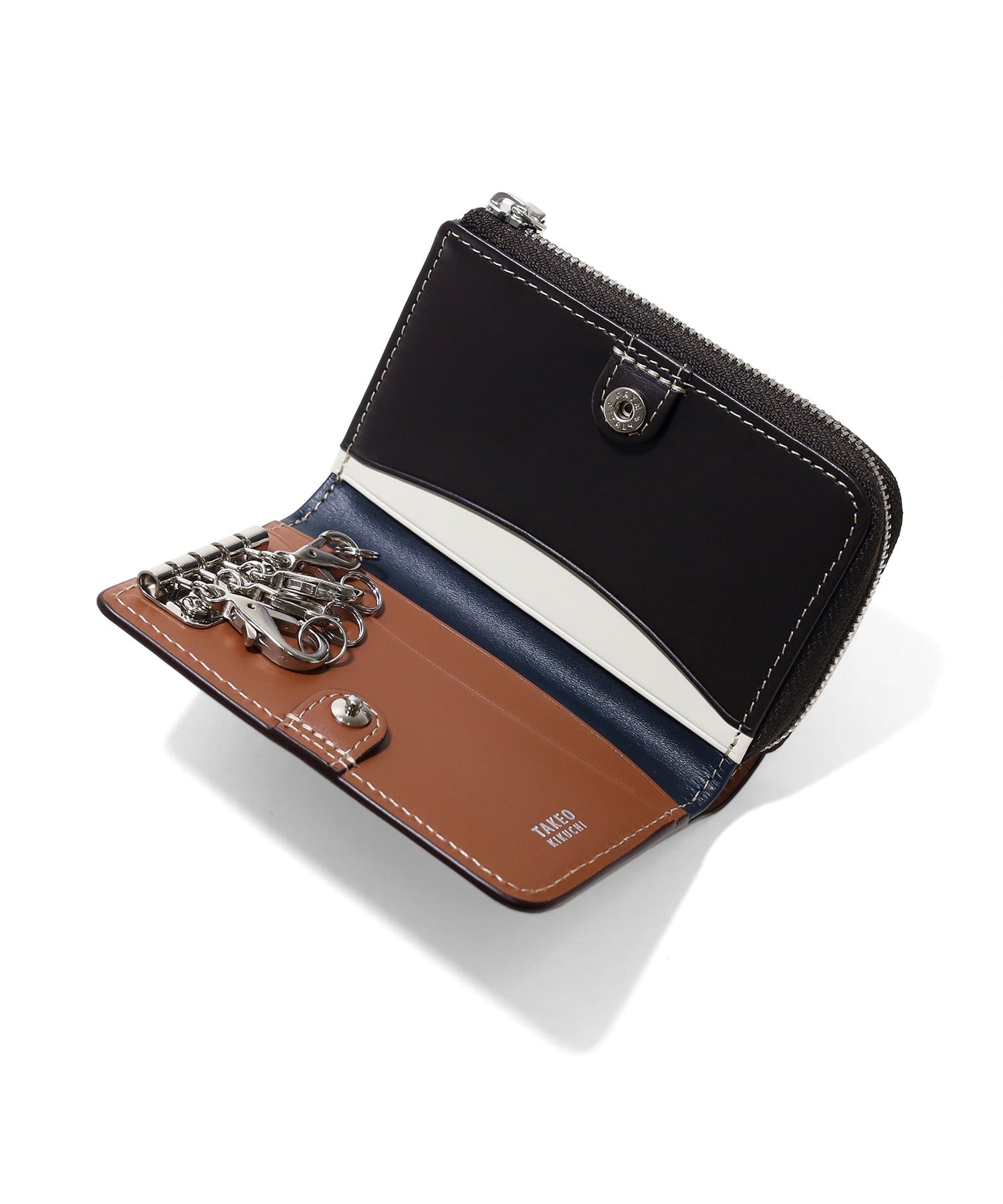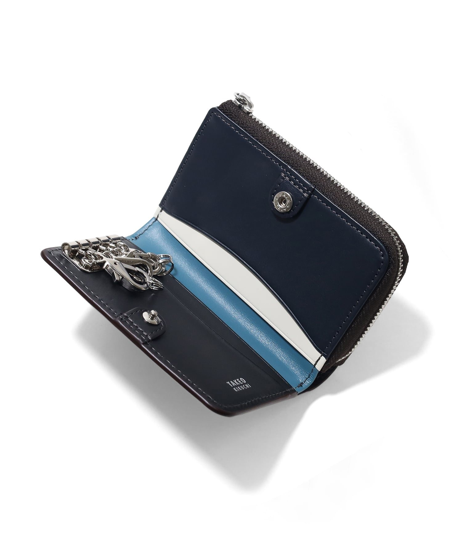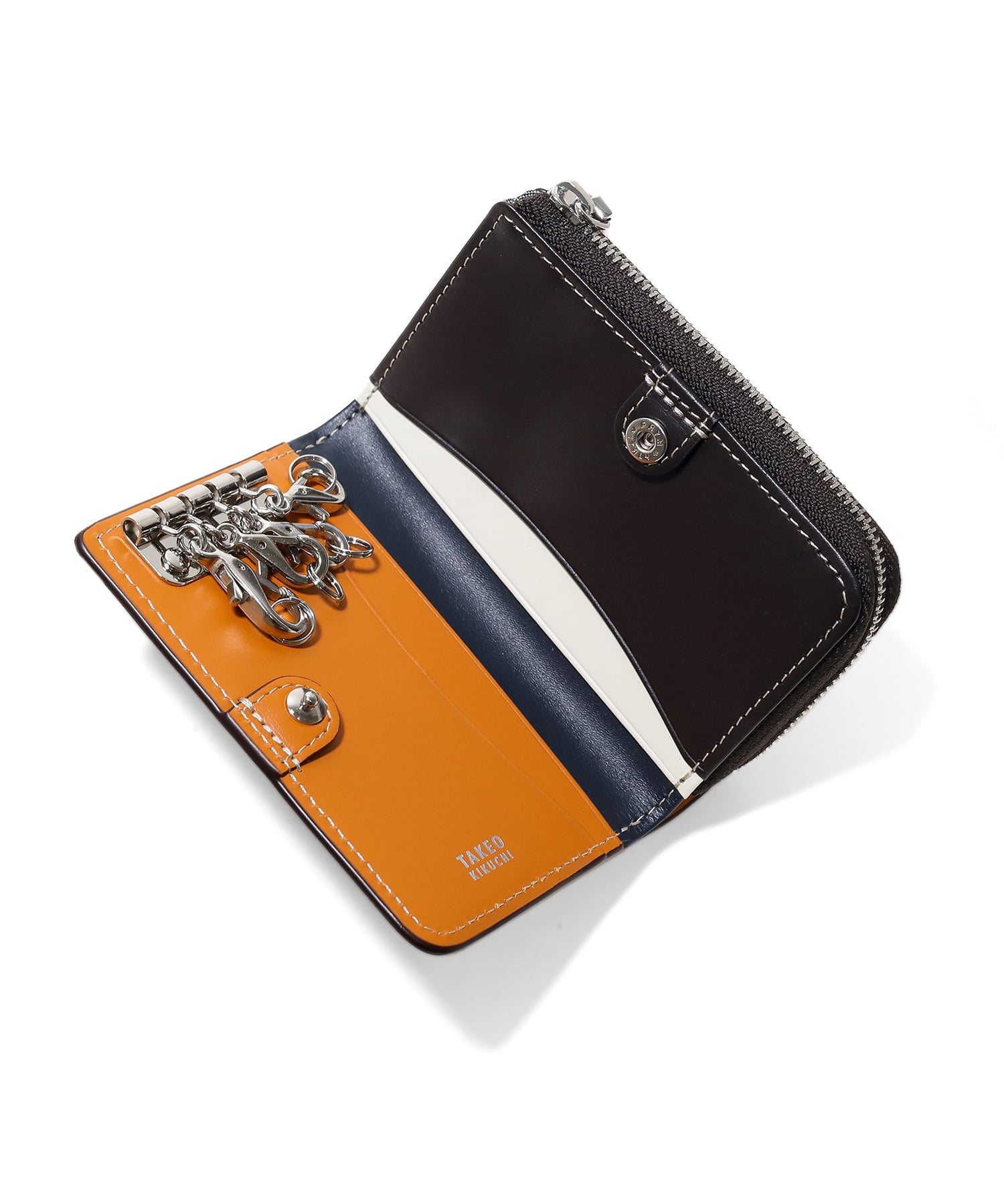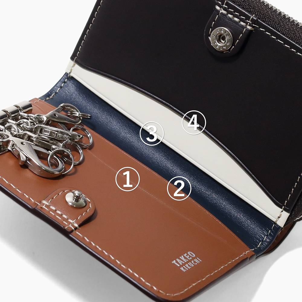 エイジングを存分に堪能できるインポートレザーを使用した、TAKEO KIKUCHIのキーケースです。内装にはカラーコンビネーションの施したカラフルな色合いに、裏地に素材感あるダンガリー生地を使用するなどカジュアルなデザインに仕上げています。<br />またキーリングを着脱のしやすいナスカン仕様にし、充実したポケット類や小銭入れなど機能面もにもこだわりました。