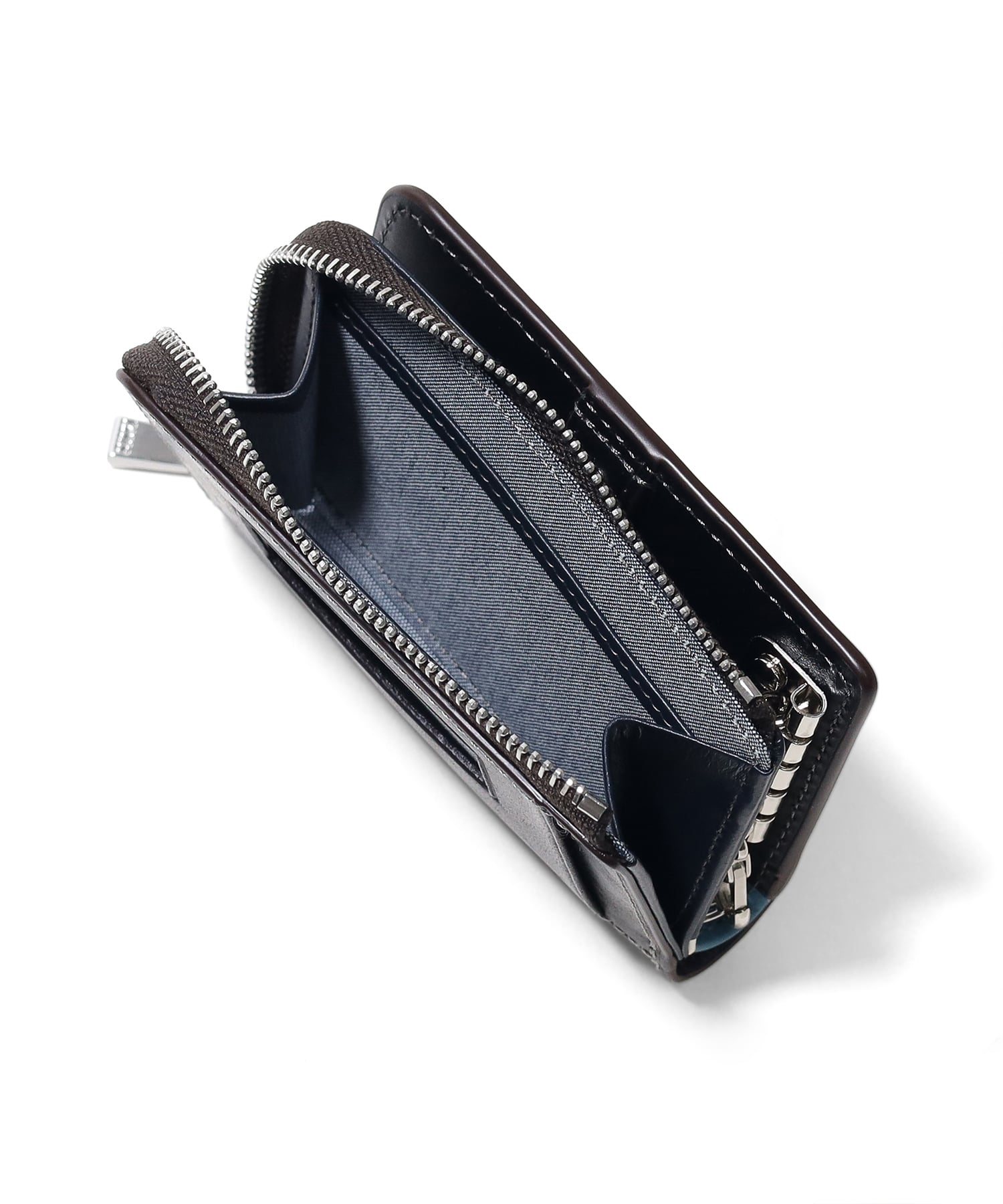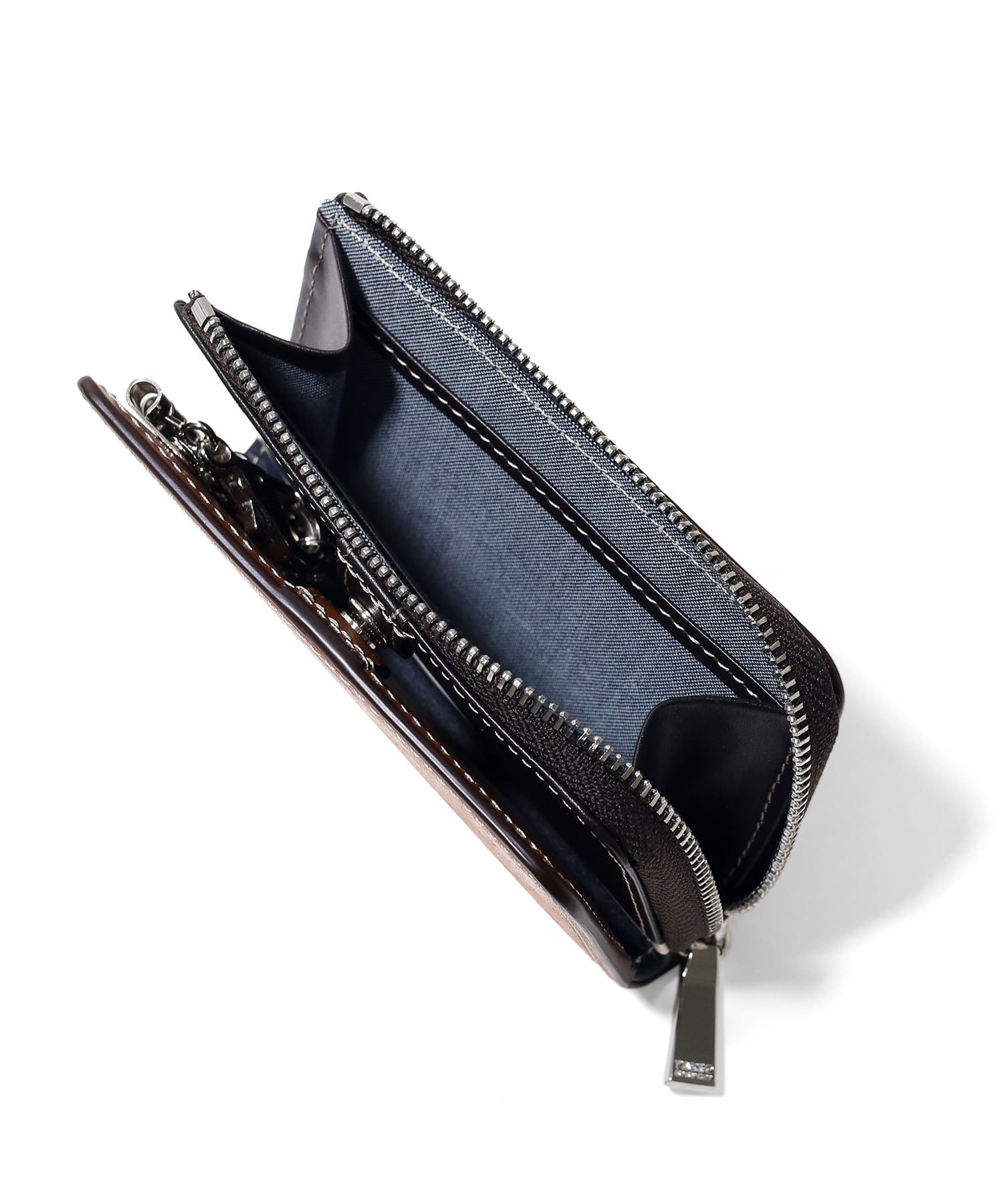 そのレザーに表面を毛羽立たせる加工をし、真鍮ブラシでその毛羽立ちを寝かしつけるように磨き上げ、独特なマットな質感に仕上げています。初めは少しザラザラとした質感ですが、時間が経つと革が寝ていき、磨いたような艶感に変わります。内装にはカラーコンビネーションを施すことで、外装とのギャップ感を出しています。外装カラーによって、内装のカラーの組み合わせが違うのもポイントです。