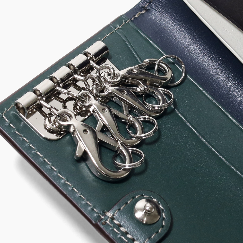 エイジングを存分に堪能できるインポートレザーを使用した、TAKEO KIKUCHIのキーケースです。内装にはカラーコンビネーションの施したカラフルな色合いや、裏地に素材感あるダンガリー生地を使用するなどカジュアルなデザインに仕上げています。 またキーリングを着脱のしやすいナスカン仕様にし、充実したポケット類や小銭入れなど機能面にもこだわりました。