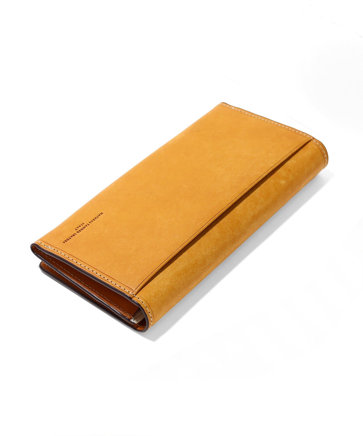 本体素材には、植物性タンニンを用いて時間をかけてなめされた製法の中でも、牛脂を使用した「バケッタ製法」で作られたレザーを使用しています。通常の革よりも時間をかけてゆっくりとオイルを染み込ませていくので、オイルが抜けにくく、色や艶が非常に良い味を出してくれます。