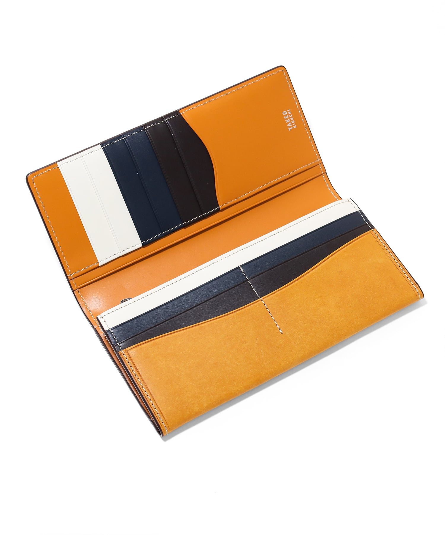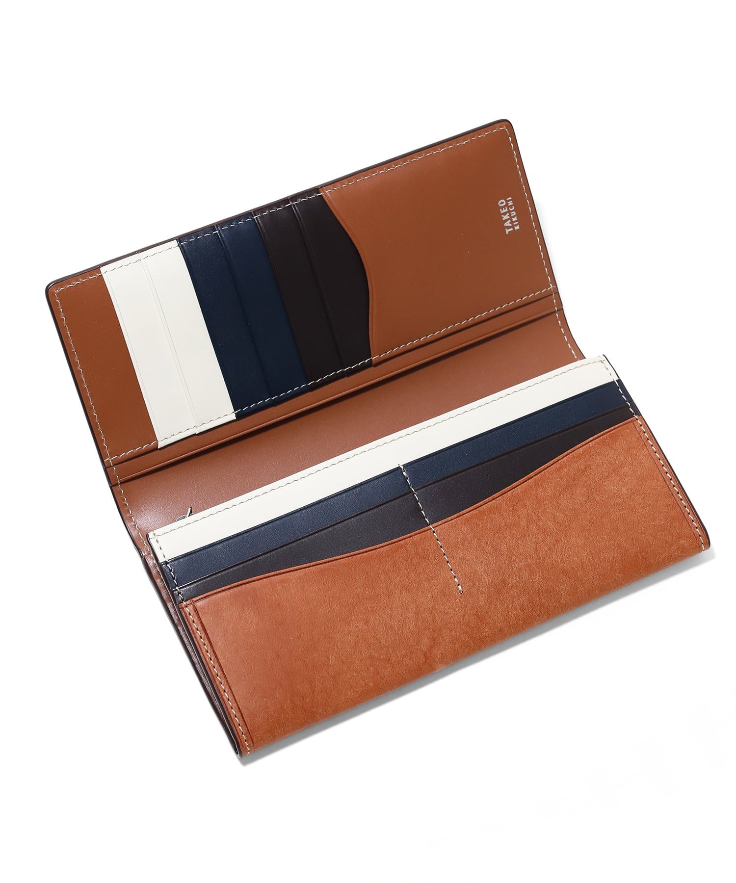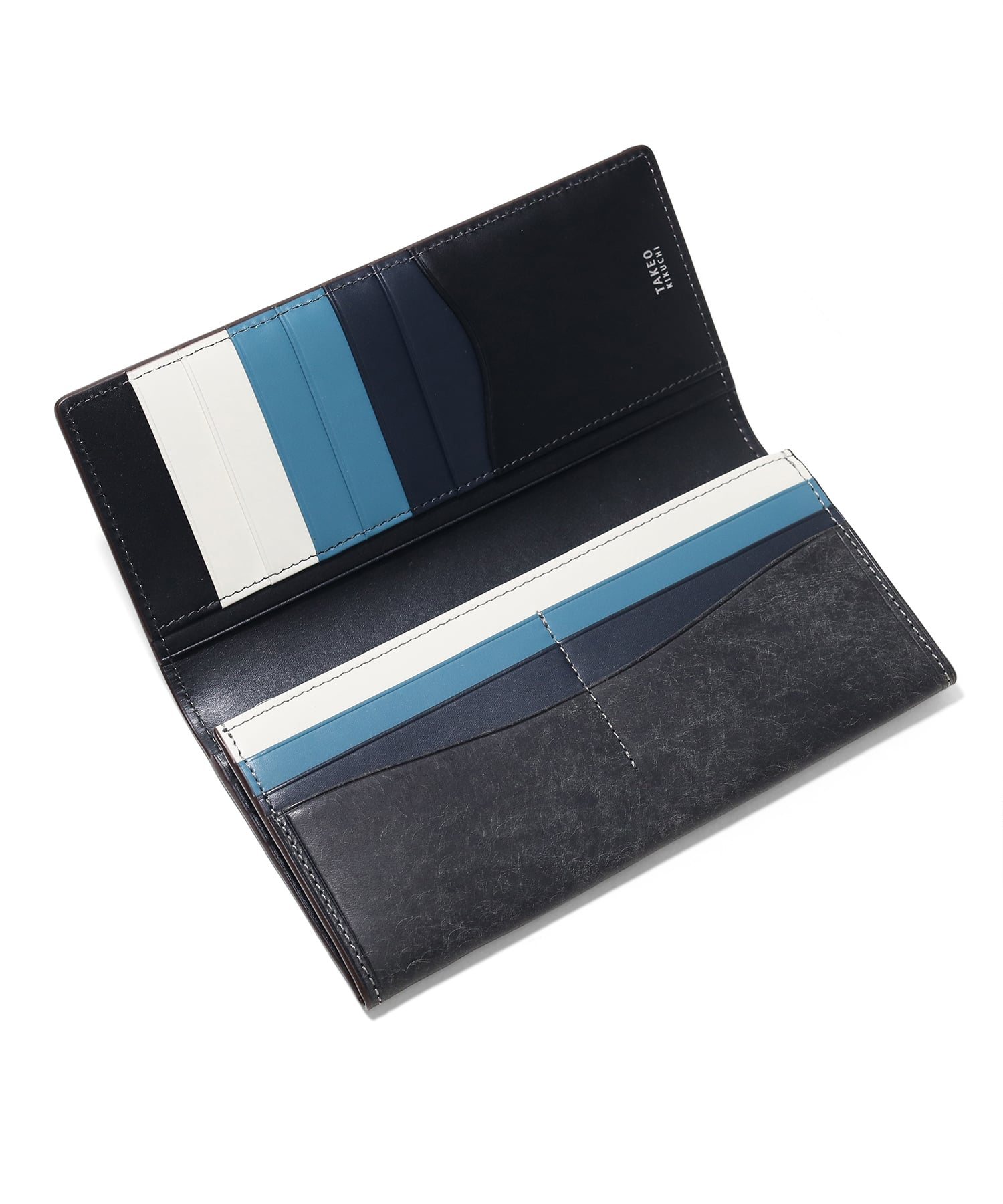 エイジングを存分に端のできるインポートレザーを使用した、TAKEO KIKUCHIのかぶせタイプの長財布です。内装にはカラーコンビネーションの施したカラフルな色合いに、裏地に素材感あるダンガリー生地を使用するなどカジュアルなデザインに仕上げています。また札入れ内にカードポケットを設けることでカードを計19枚とより多くカードが収納できるようにしました。