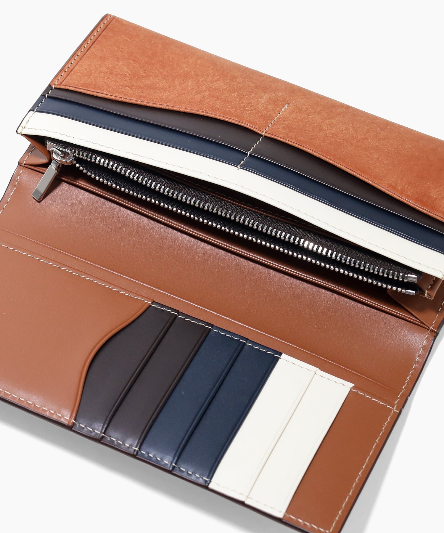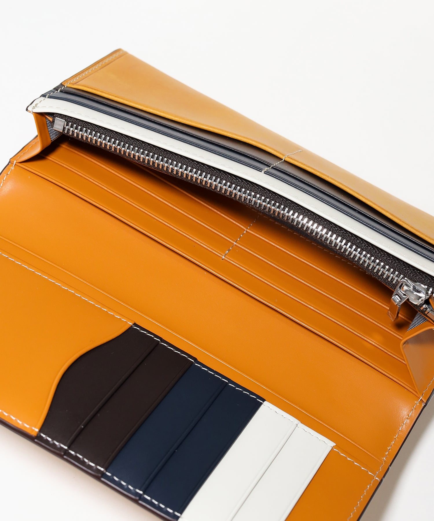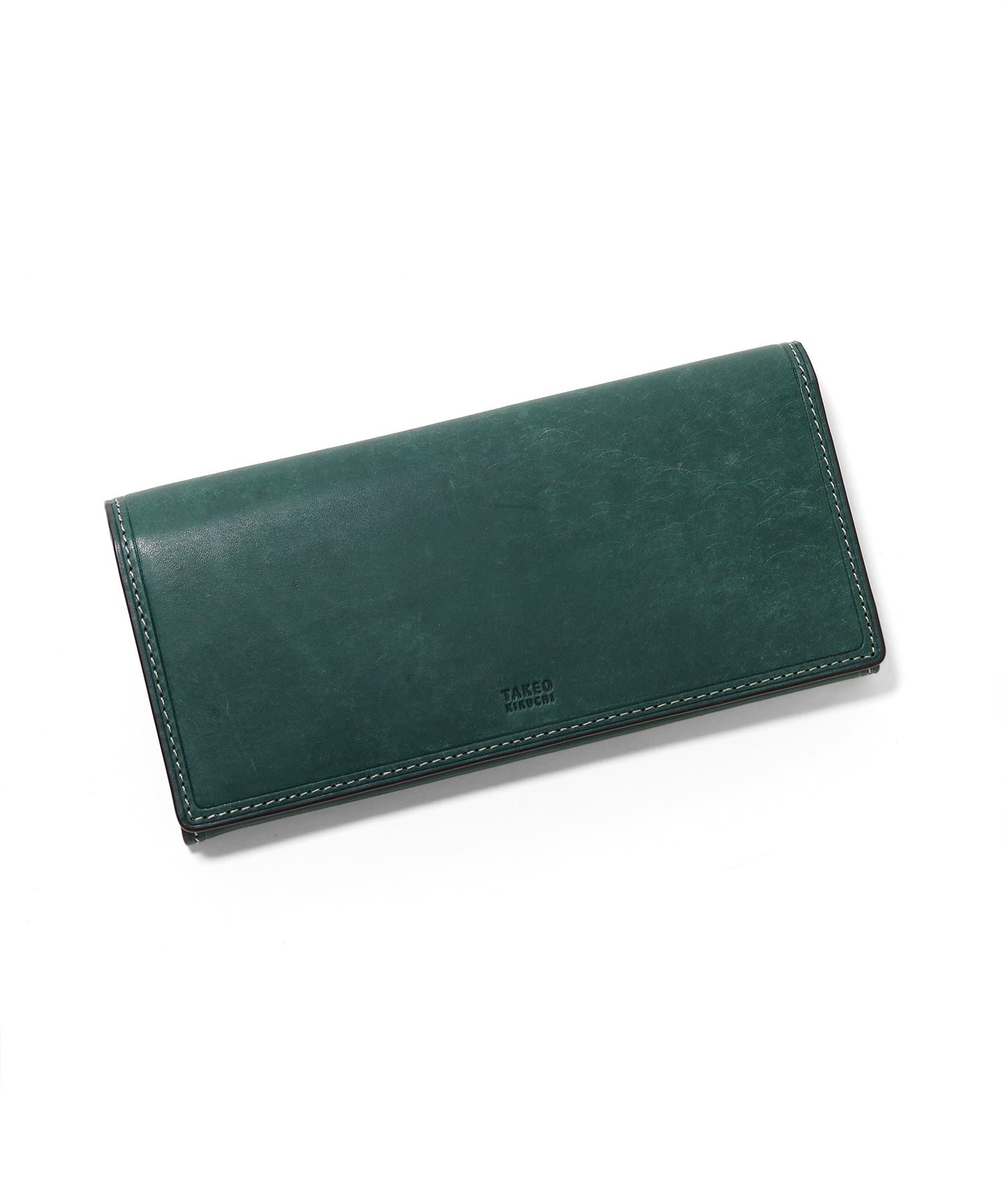 エイジングを存分に端のできるインポートレザーを使用した、TAKEO KIKUCHIのかぶせタイプの長財布です。内装にはカラーコンビネーションの施したカラフルな色合いに、裏地に素材感あるダンガリー生地を使用するなどカジュアルなデザインに仕上げています。また札入れ内にカードポケットを設けることでカードを計19枚とより多くカードが収納できるようにしました。