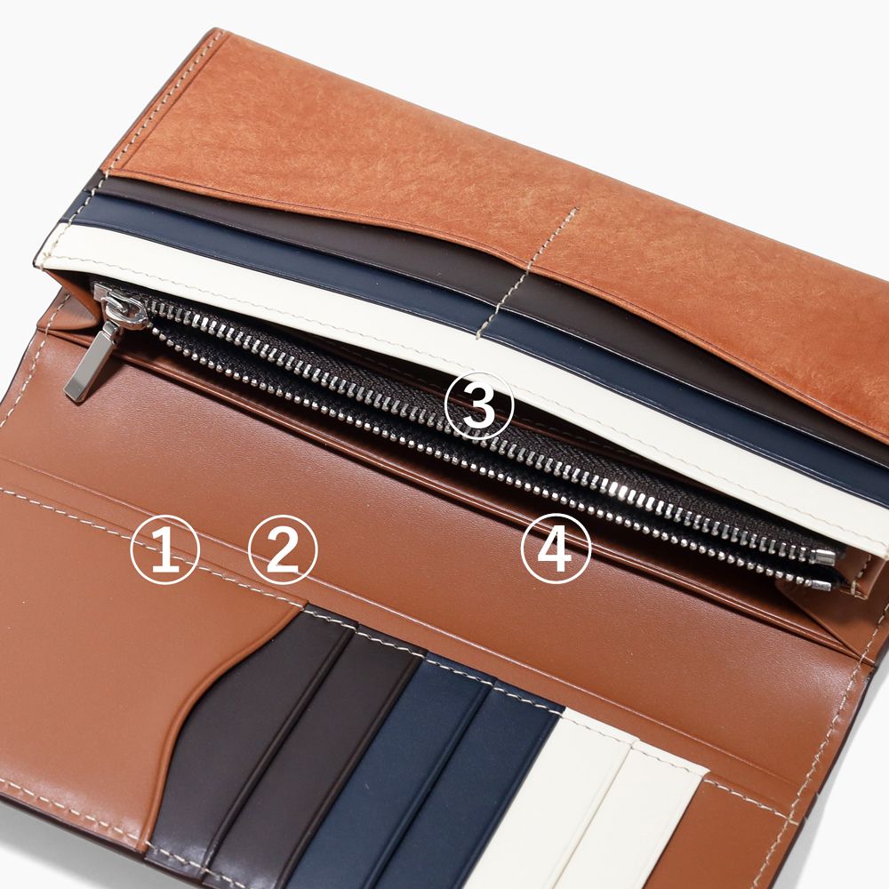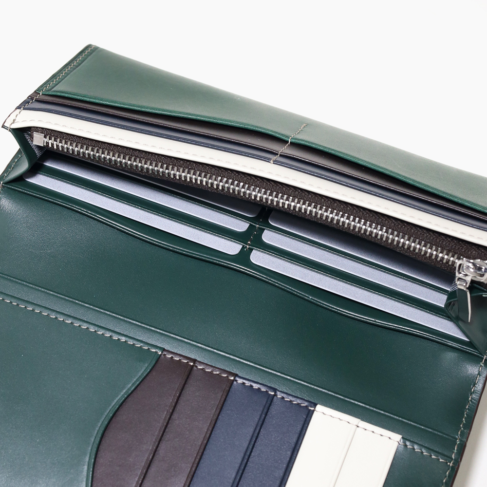 そのレザーに表面を毛羽立たせる加工をし、真鍮ブラシでその毛羽立ちを寝かしつけるように磨き上げ、独特なマットな質感に仕上げています。初めは少しザラザラとした質感ですが、時間が経つと革が寝ていき、磨いたような艶感に変わります。内装にはカラーコンビネーションを施すことで、外装とのギャップ感を出しています。外装カラーによって、内装のカラーの組み合わせが違うのもポイントです。