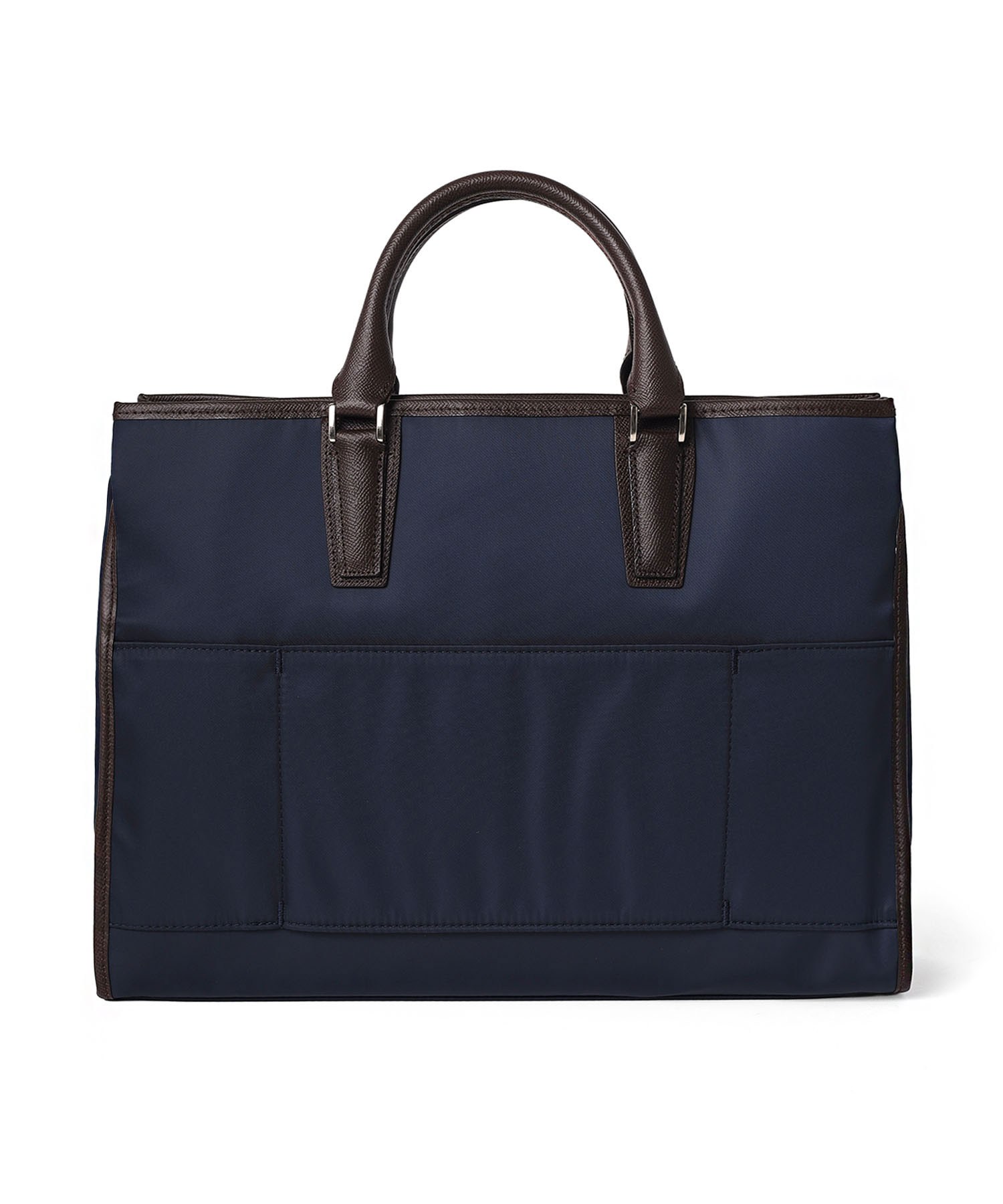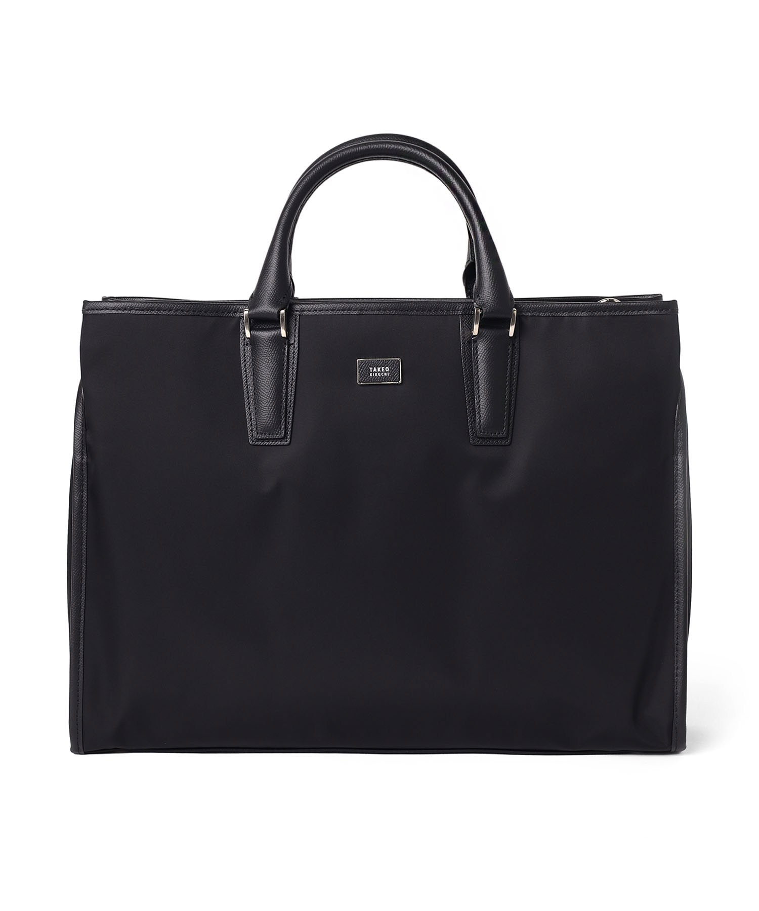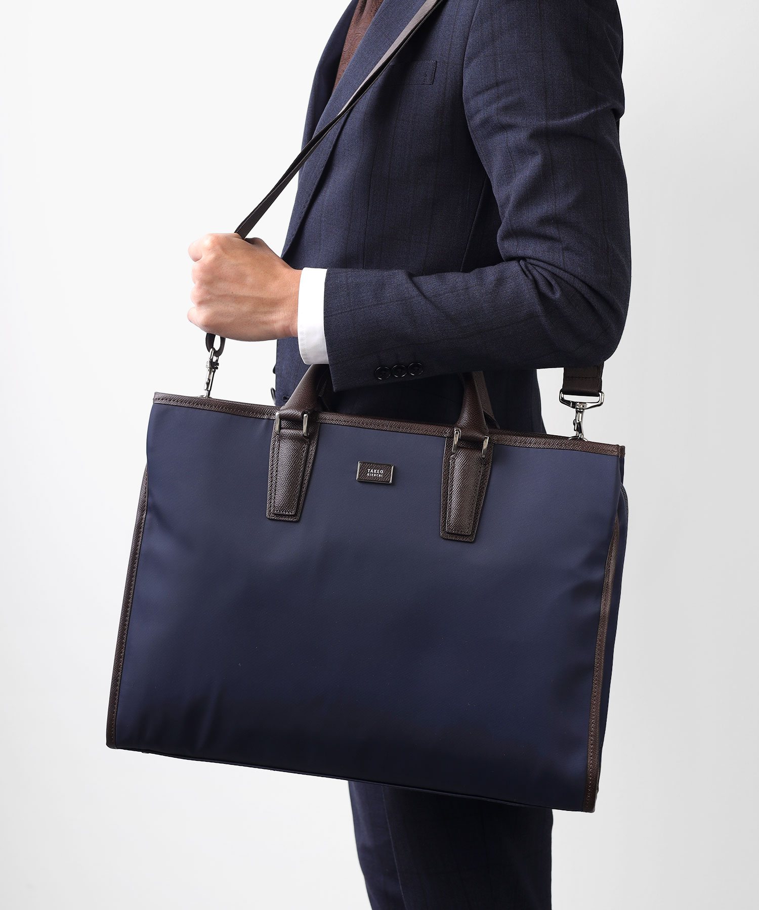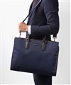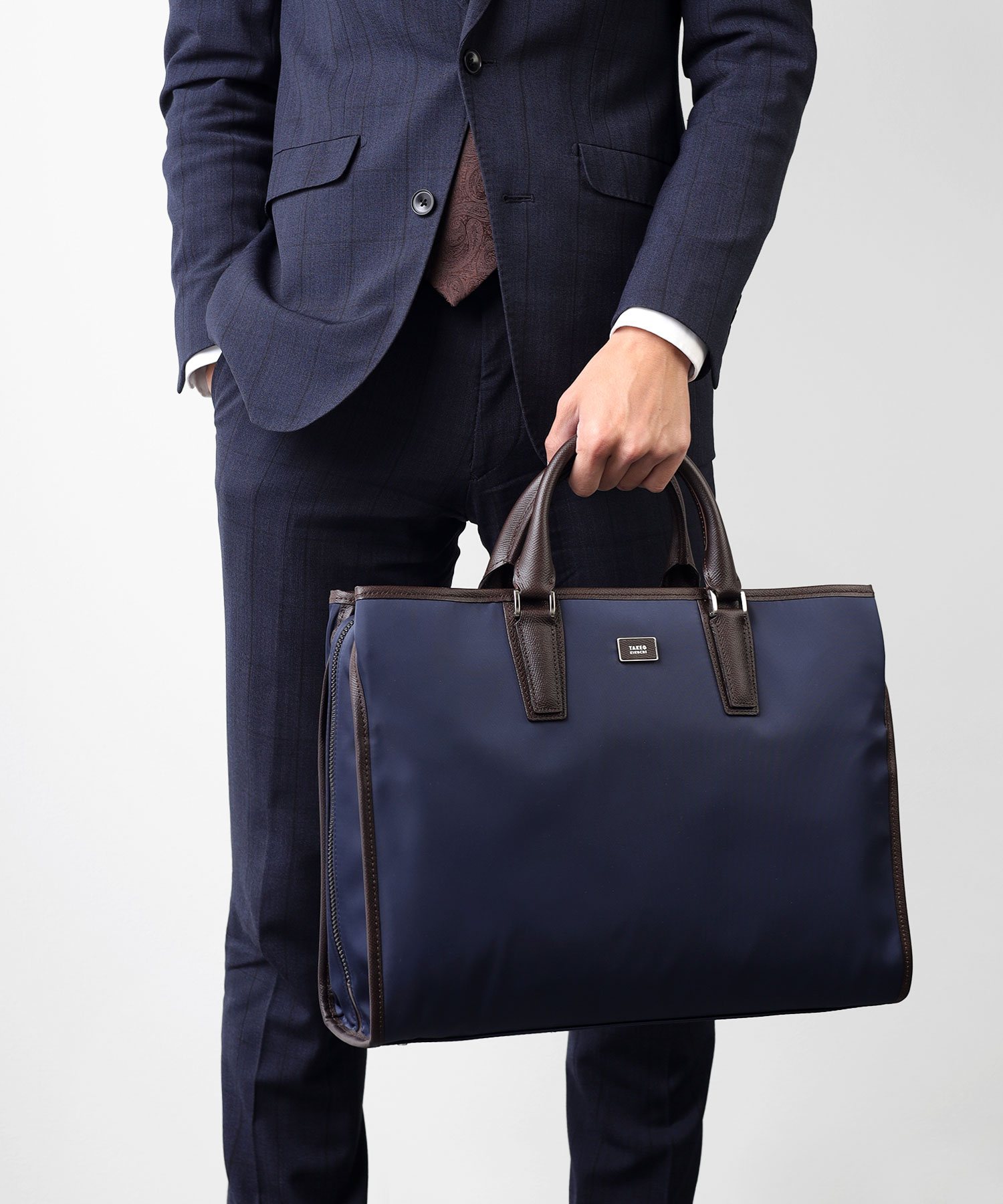 特徴的な両面アオリポケットによる使いやすさがポイントのTAKEO KIKUCHIのB4サイズビジネスバッグ。 本体素材には上品な光沢感のあるリサイクルナイロンを使用しています。表面には撥水加工も施されている為、水に強くお手入れも簡単です。 内装には13.3インチPCを収納できるポケットがあり、ノートパソコンの持ち運びにも対応しています。ショルダーベルト付きで斜め掛けも可能です。