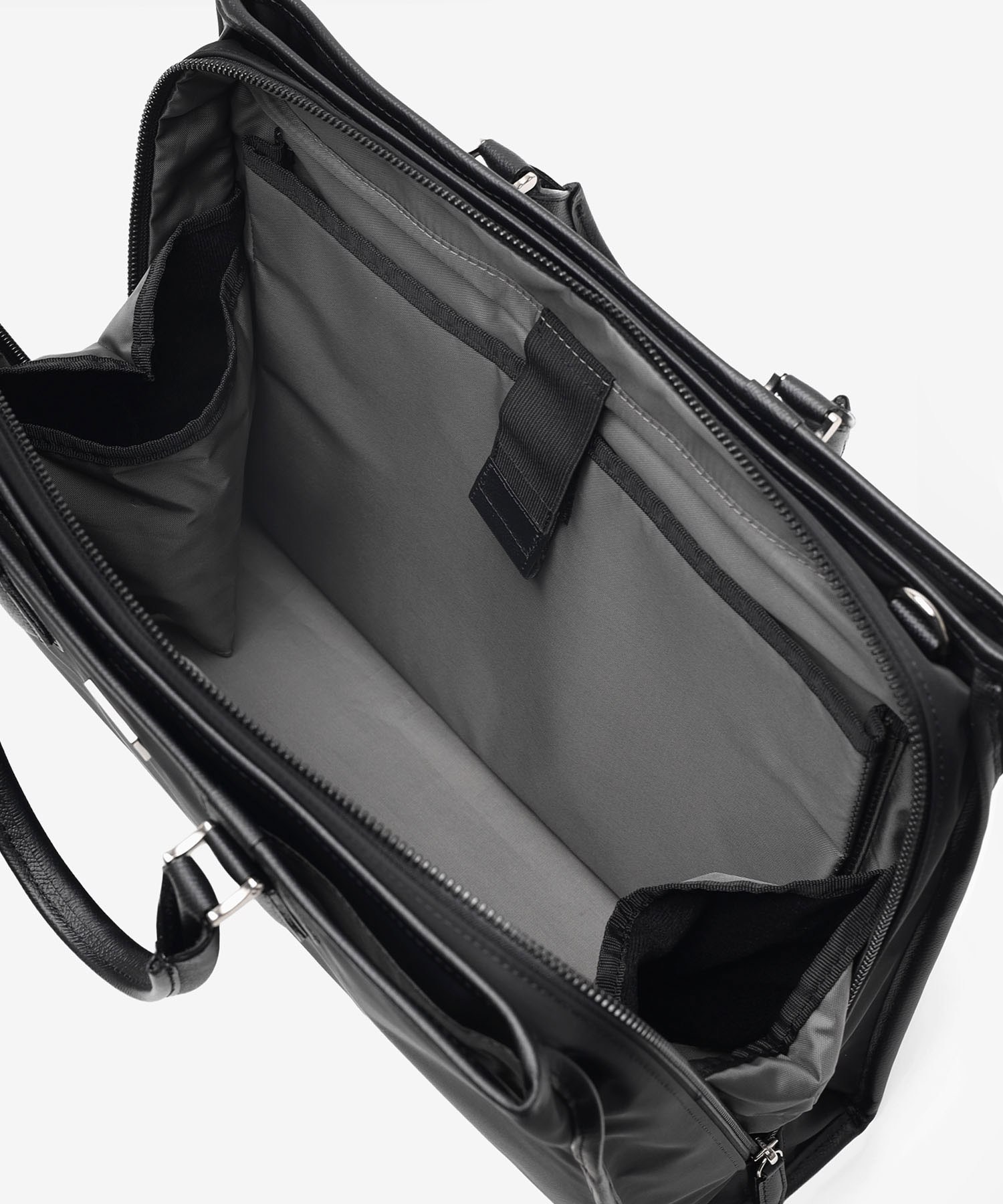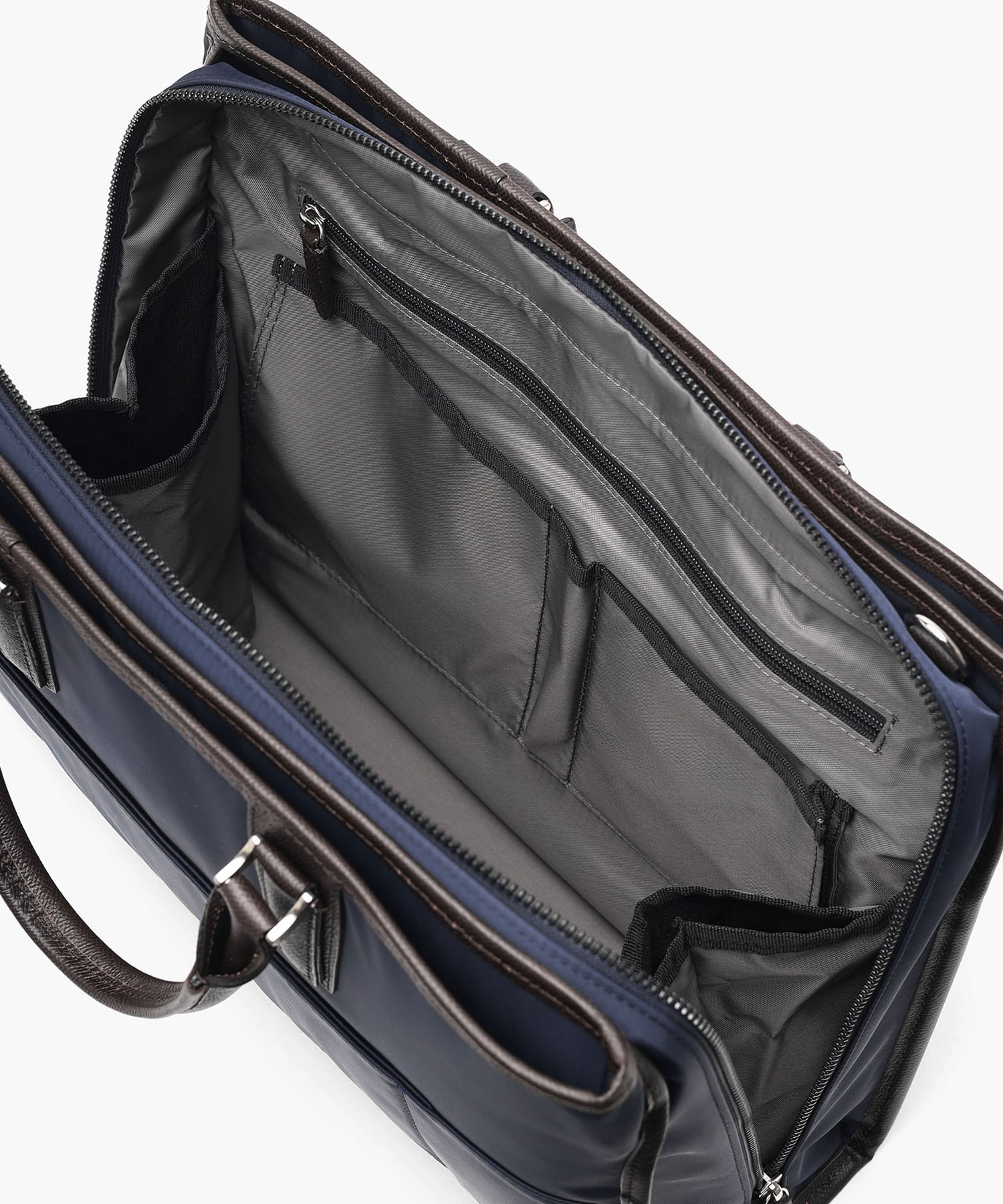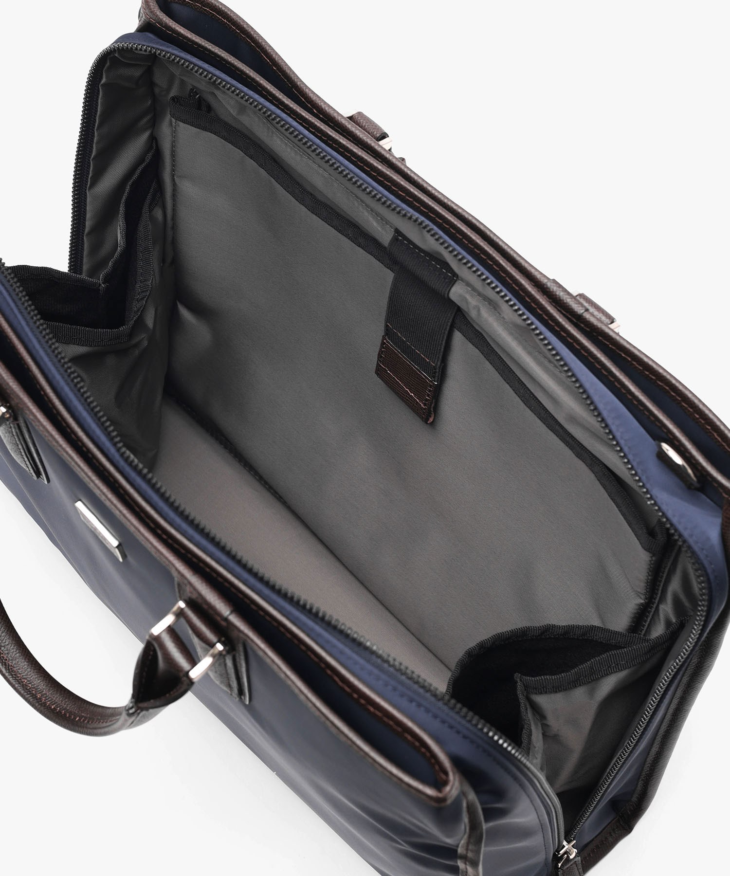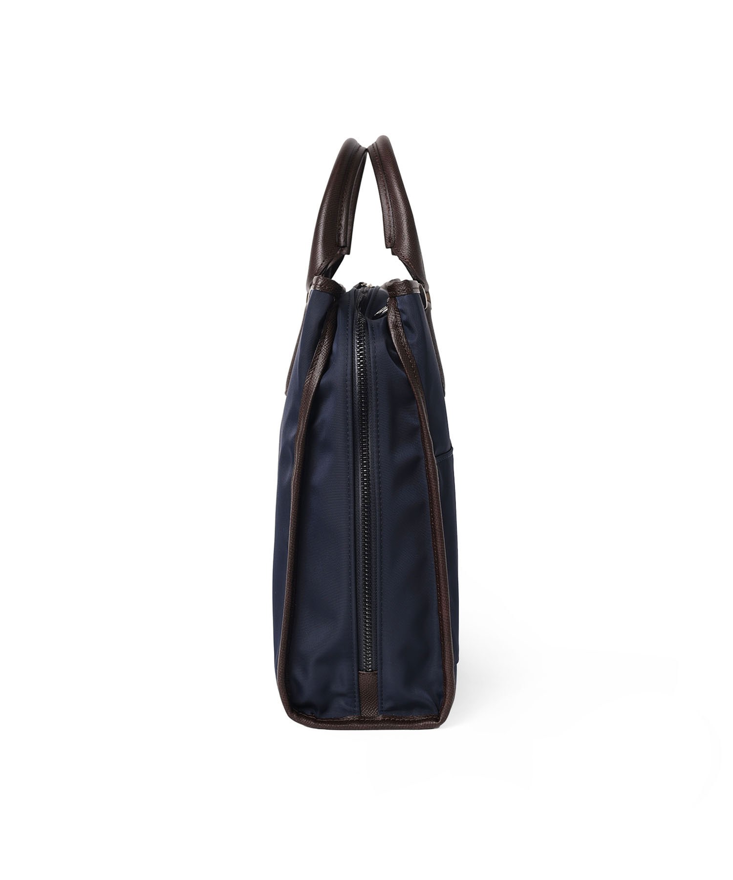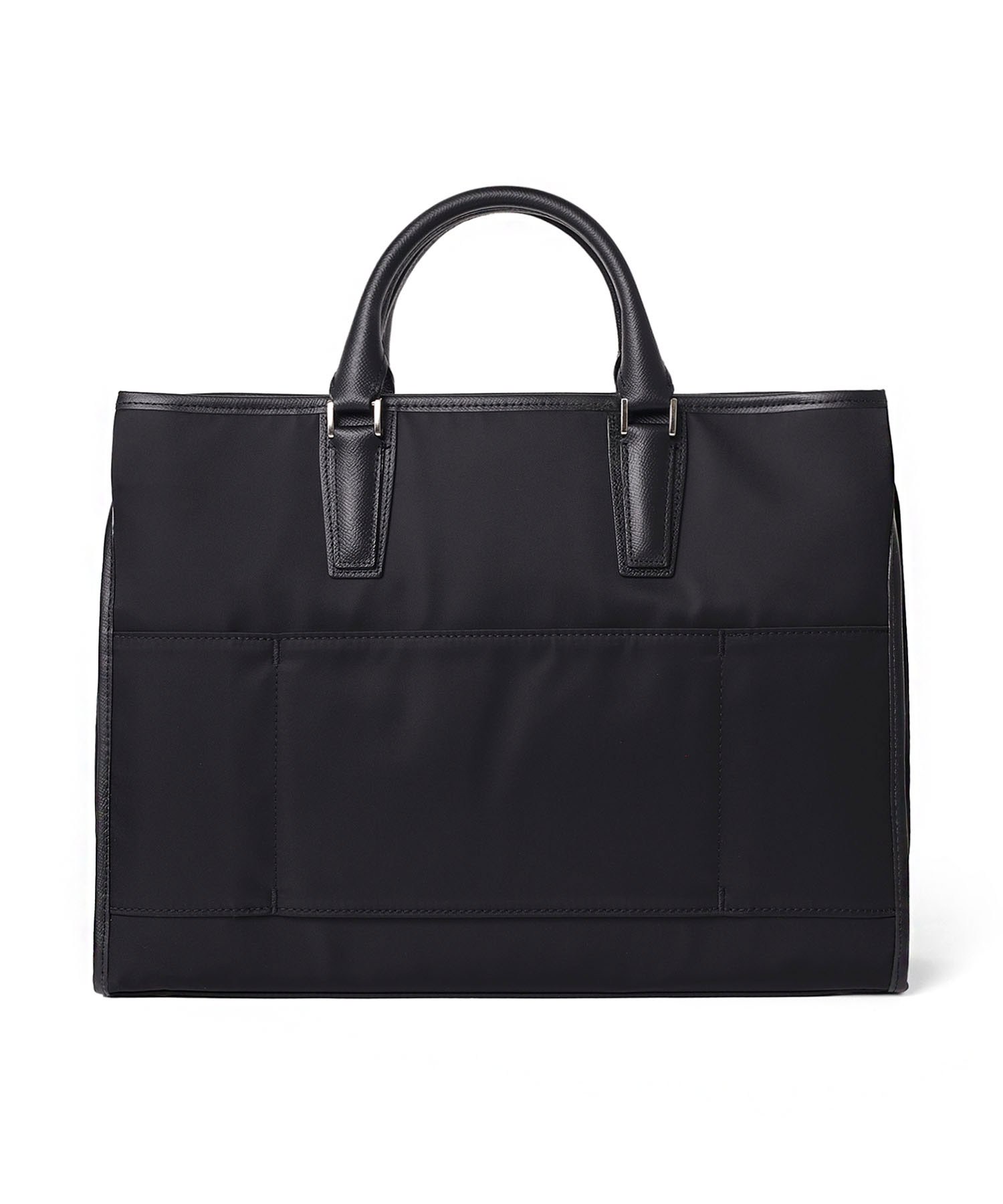 特徴的な両面アオリポケットによる使いやすさがポイントのTAKEO KIKUCHIのB4サイズビジネスバッグ。 本体素材には上品な光沢感のあるリサイクルナイロンを使用しています。表面には撥水加工も施されている為、水に強くお手入れも簡単です。 内装には13.3インチPCを収納できるポケットがあり、ノートパソコンの持ち運びにも対応しています。ショルダーベルト付きで斜め掛けも可能です。