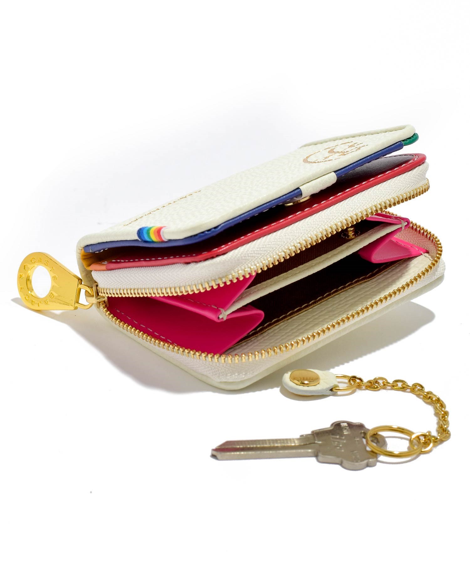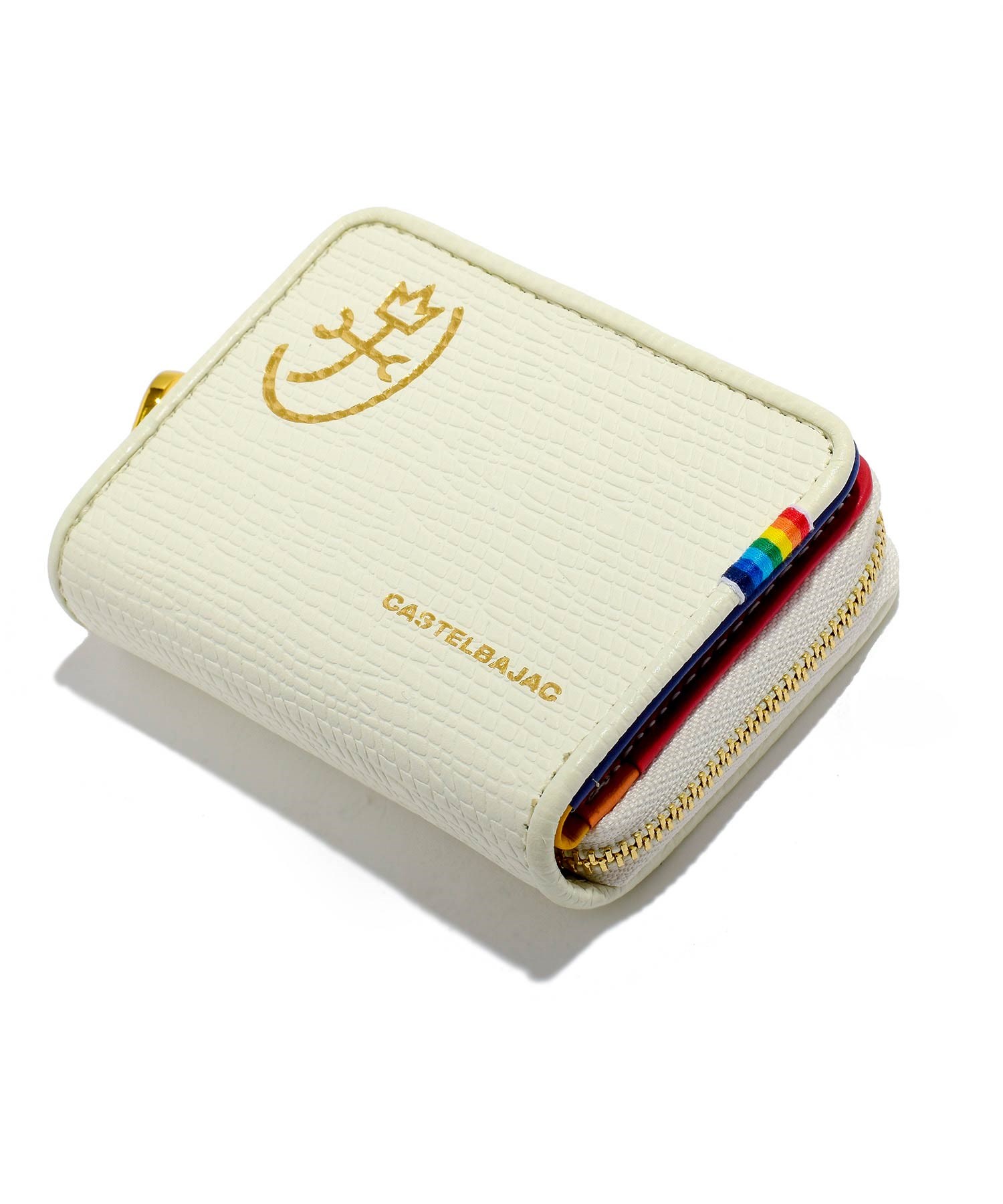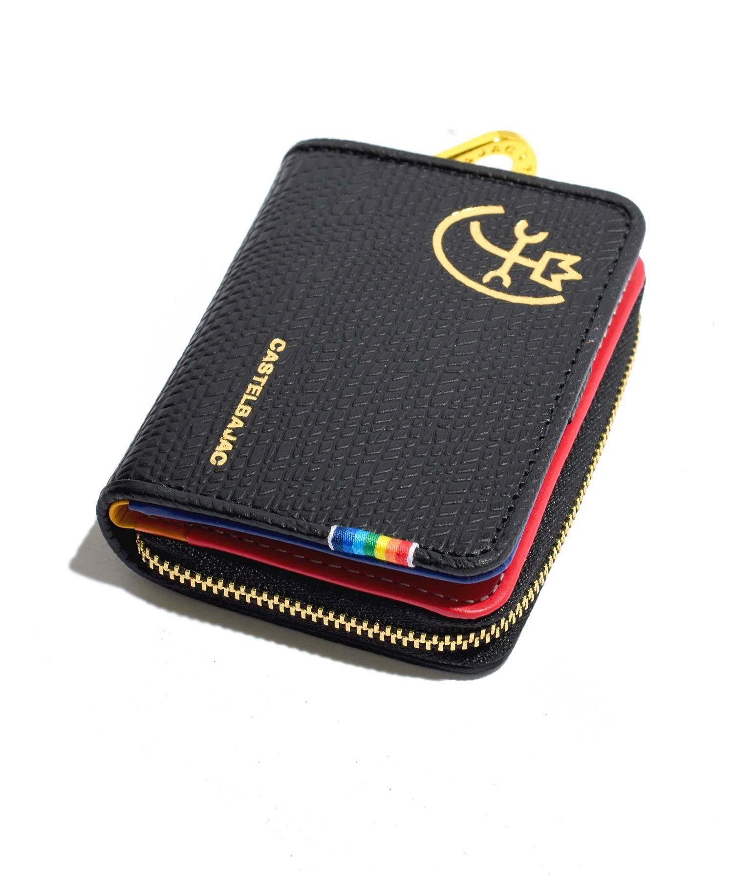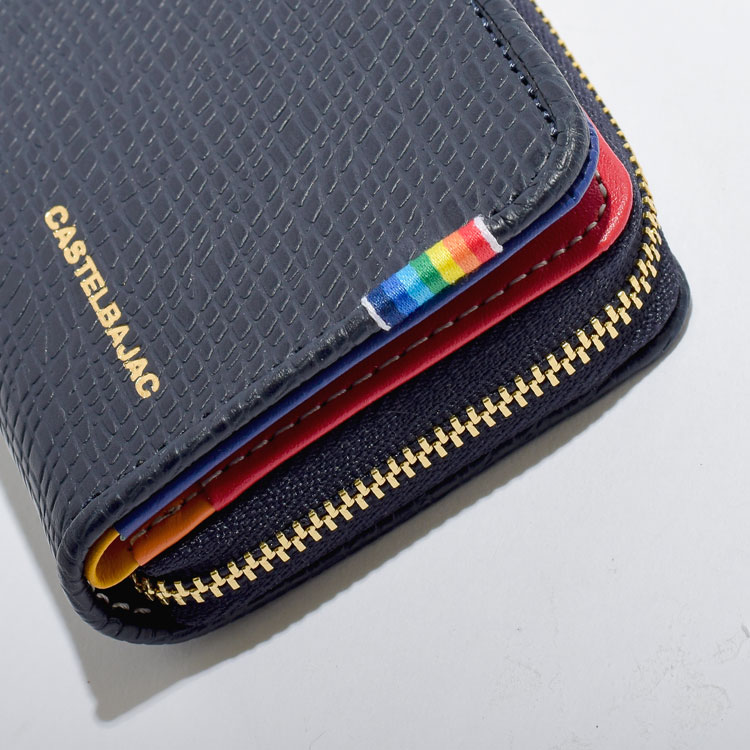 カステルバジャックを象徴するレインボー柄を内装のカラーで大胆に表現したポップなレインボーシリーズの小銭入れです。小銭入れの本体素材にはキッチュなイメージの角シボエンボス加工を施した上質で上品な牛革を使用。カラフルな内装とのギャップも魅力です。