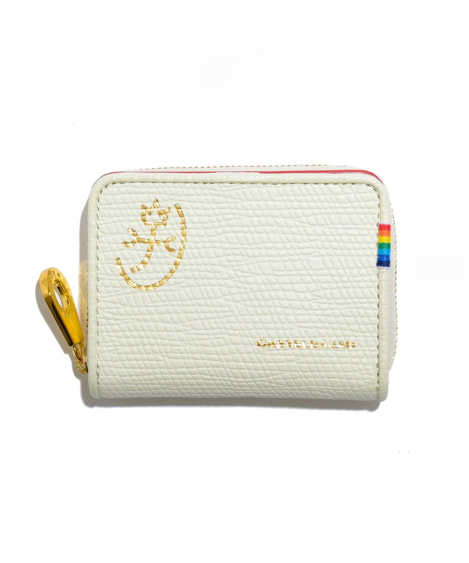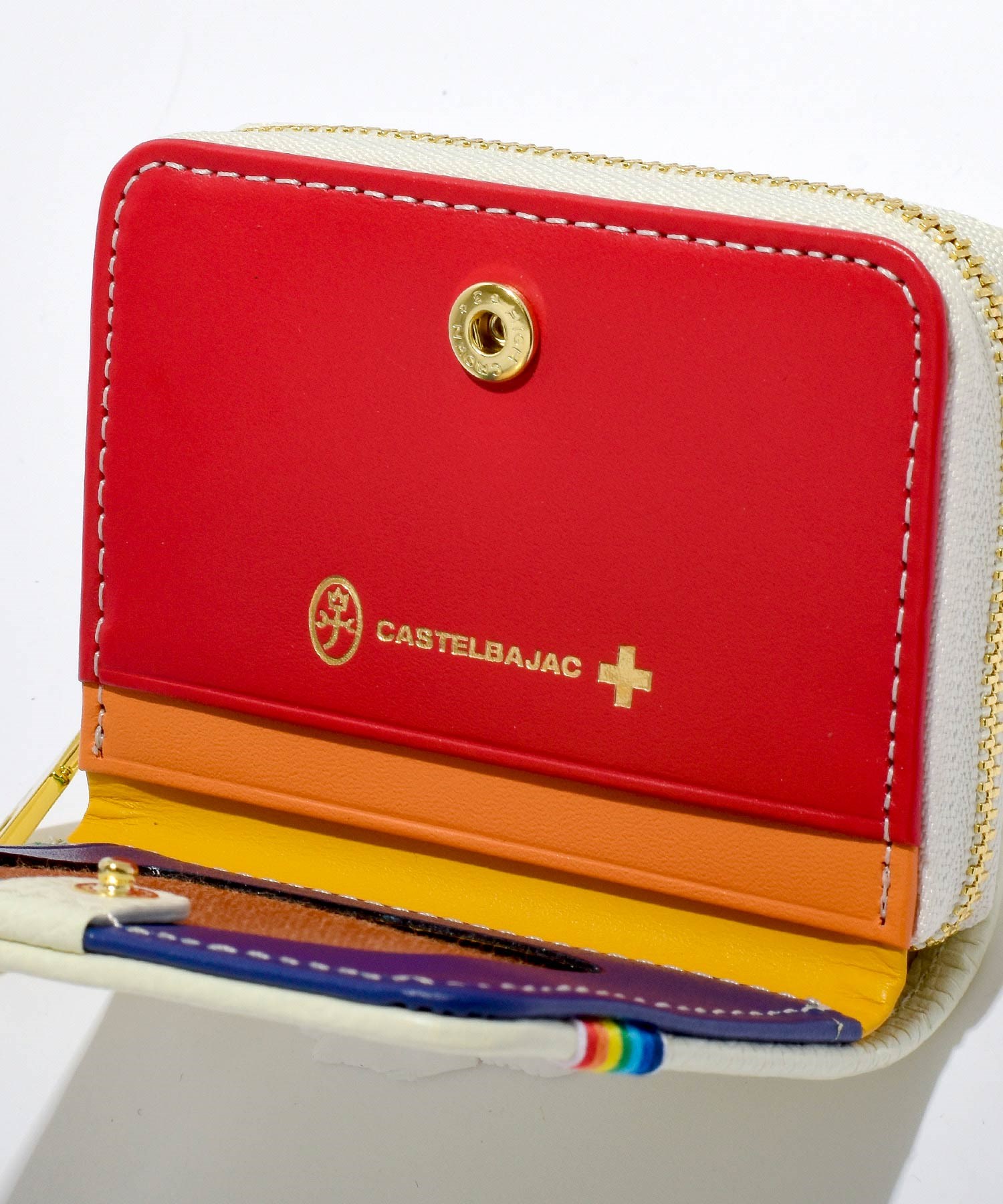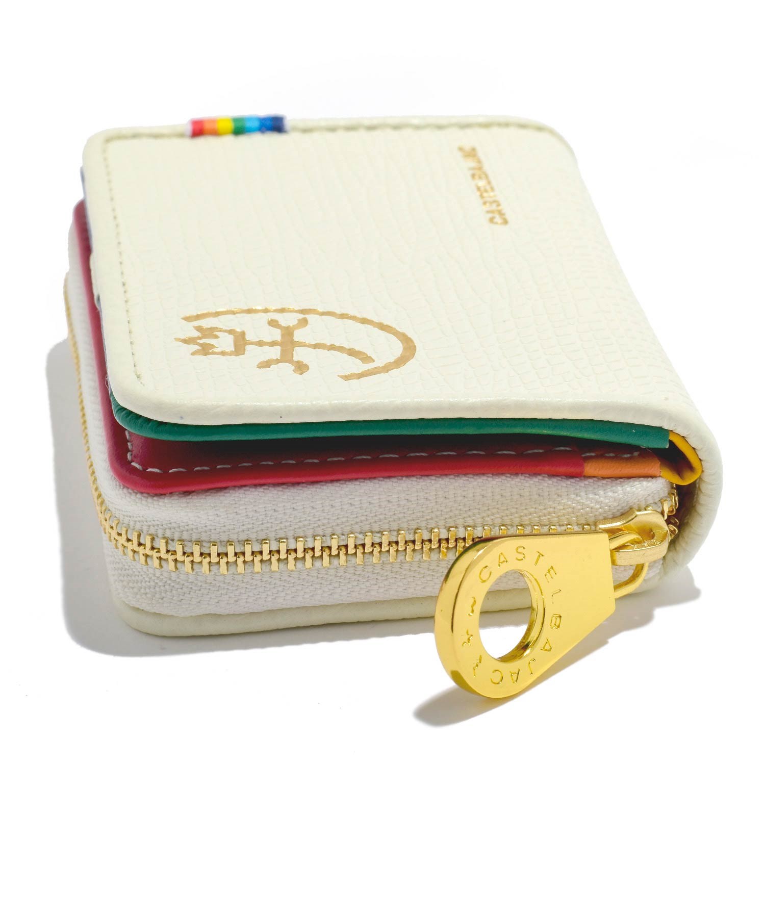 カステルバジャックを象徴するレインボー柄を内装のカラーで大胆に表現したポップなレインボーシリーズの小銭入れです。小銭入れの本体素材にはキッチュなイメージの角シボエンボス加工を施した上質で上品な牛革を使用。カラフルな内装とのギャップも魅力です。