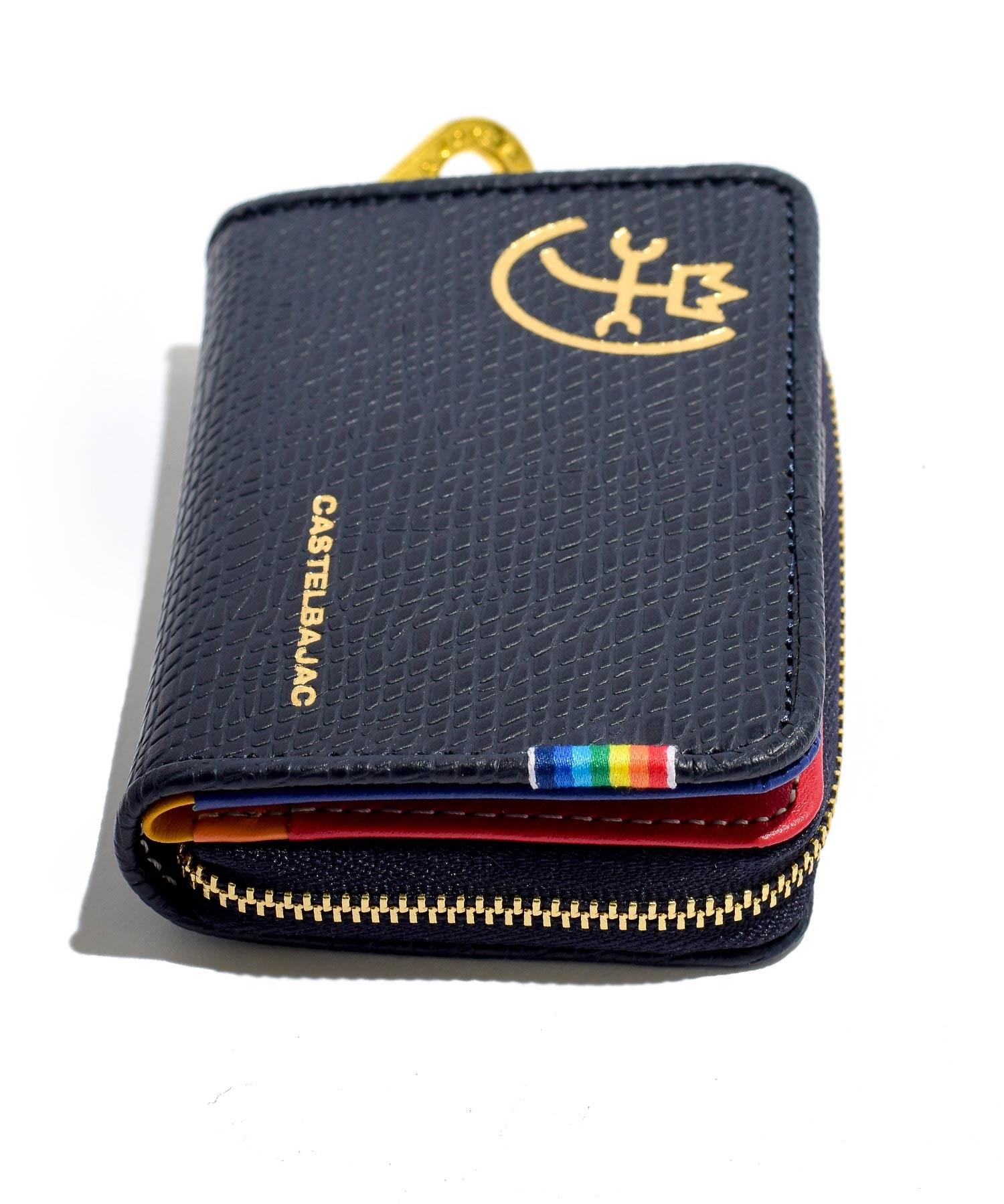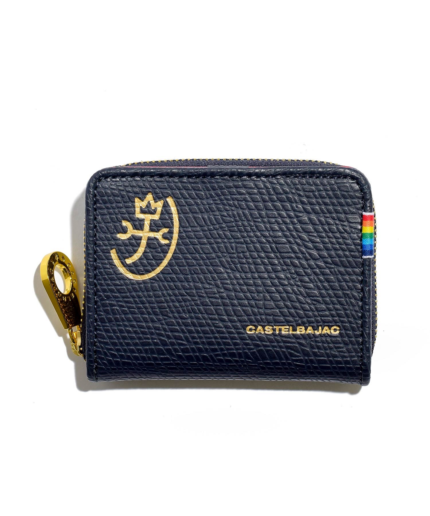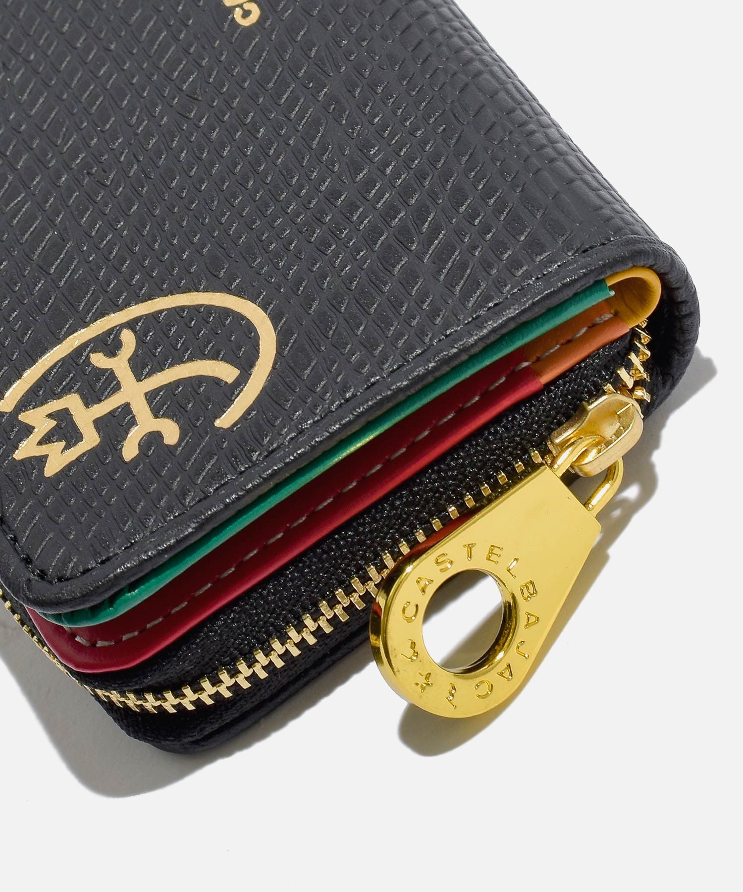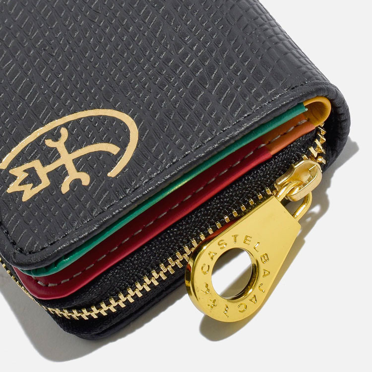 ファスナーには艶感が特徴的なゴールド色のエバーブライトファスナーを使用しカステルバジャックの家紋マークもゴールドで箔押しすることでゴージャスな印象に仕上げています。
