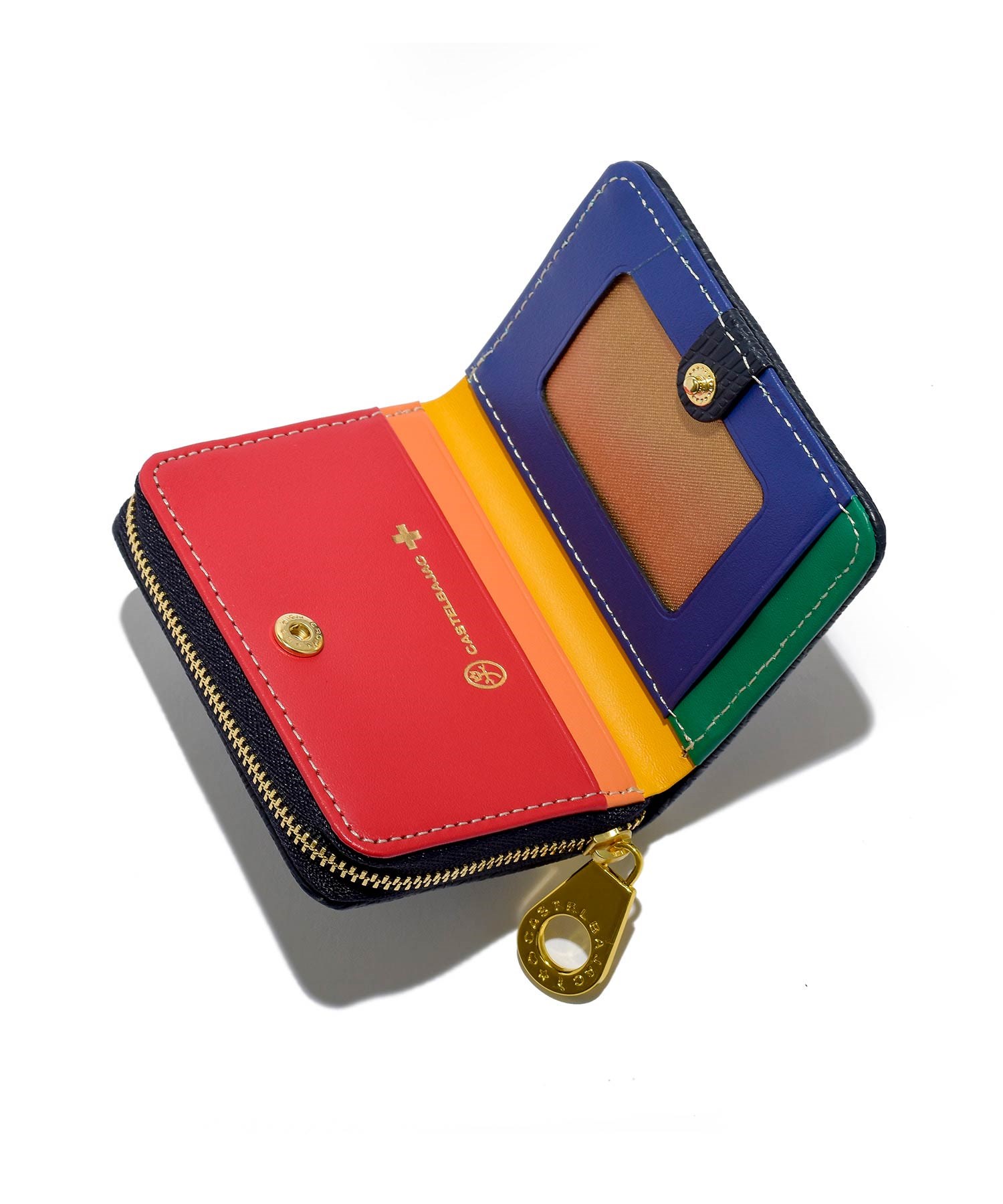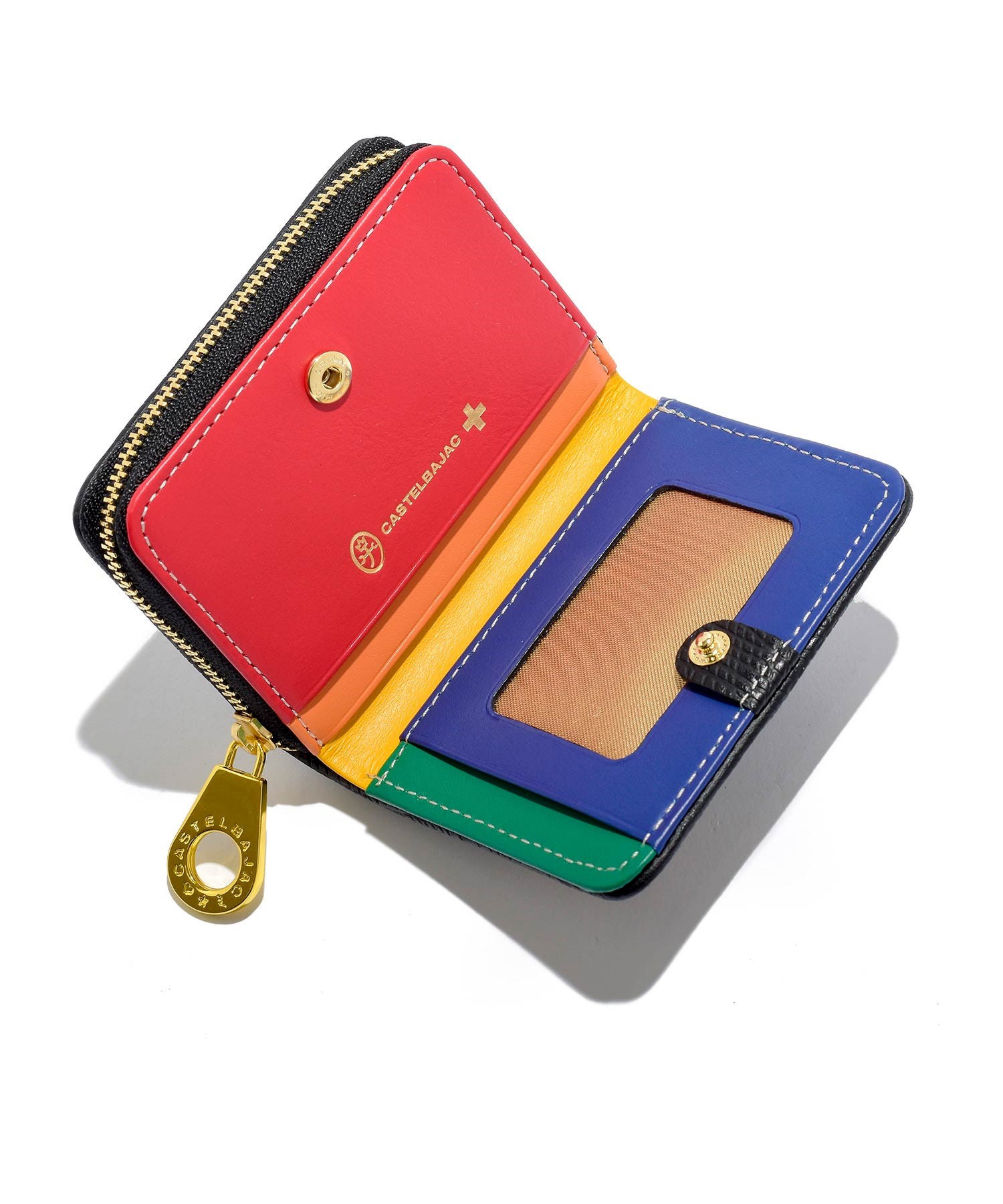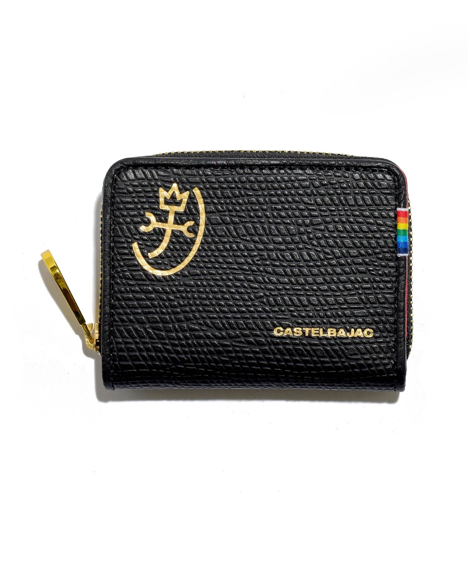 ファスナーには艶感が特徴的なゴールド色のエバーブライトファスナーを使用しカステルバジャックの家紋マークもゴールドで箔押しすることでゴージャスな印象に仕上げています。