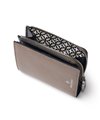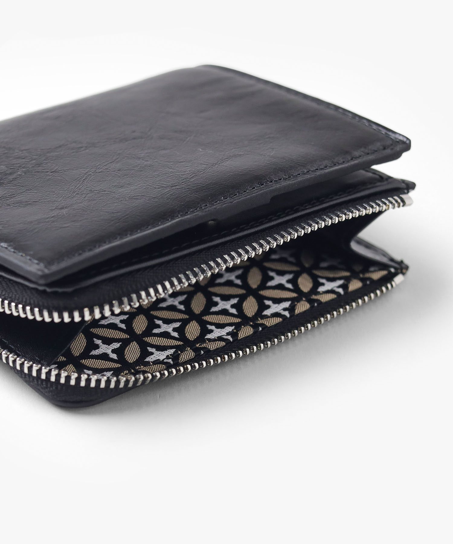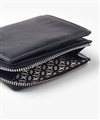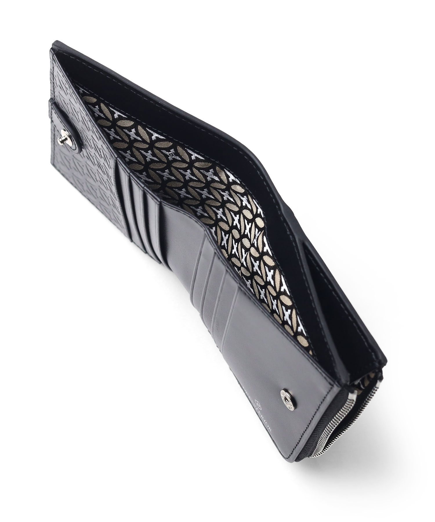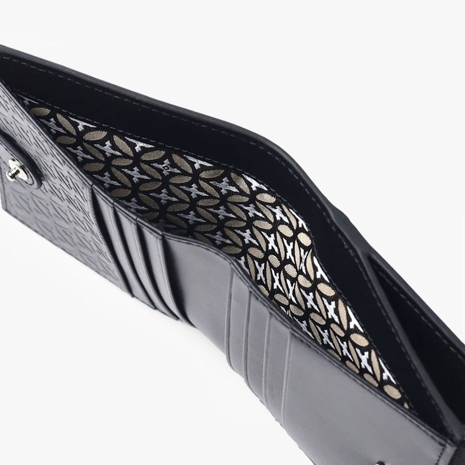内装には札入れが1つ、カード段が両側にそれぞれ4段ずつの計8段設けられています。L字ファスナーでアクセスできる小銭入れは、大きく開いて中が見やすくスムーズに硬貨を出し入れすることができます。また、小銭入れ等の裏地やエンボス加工の施されたオーバーラップサークル柄が目を引くデザインとなっています。