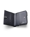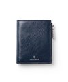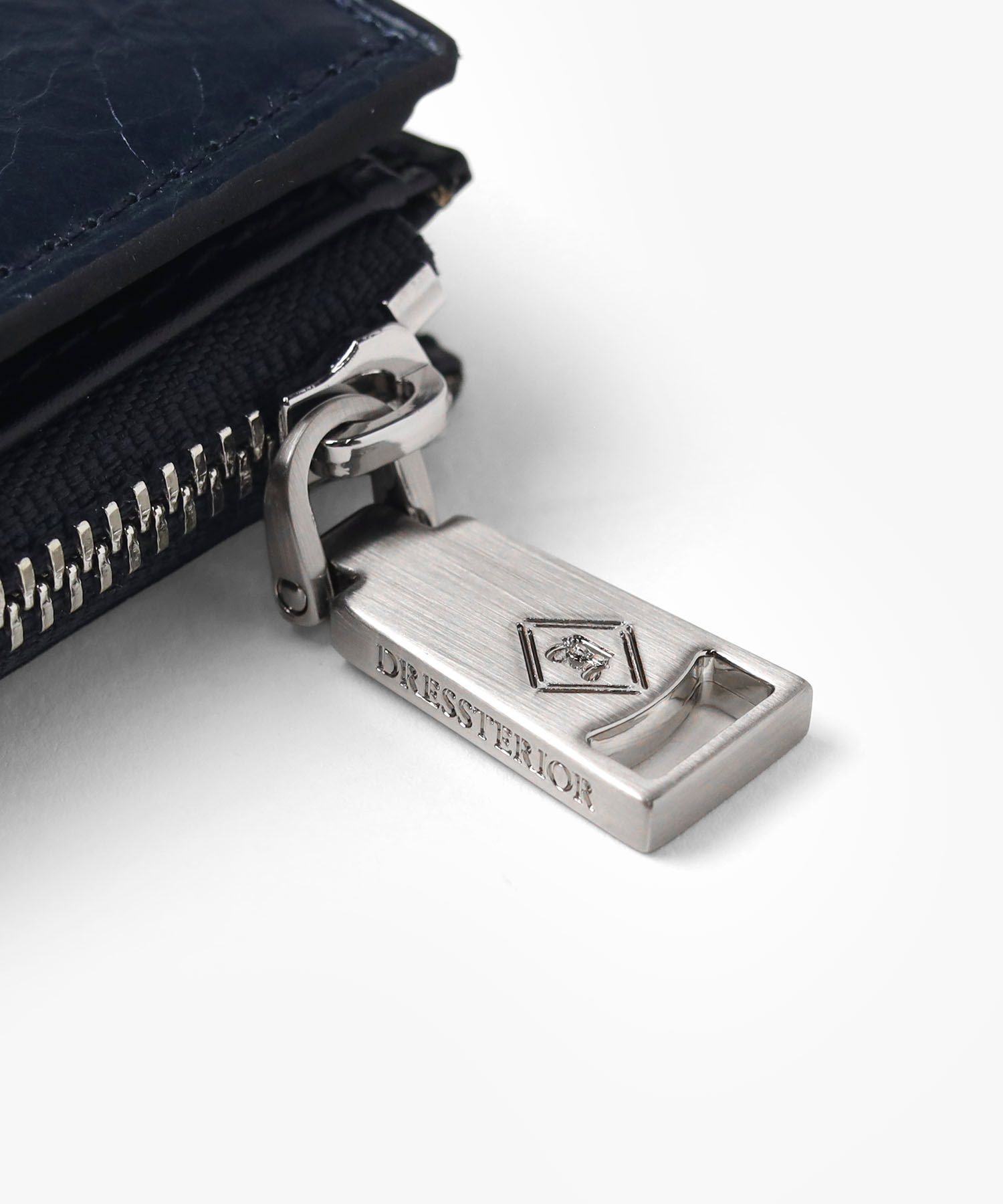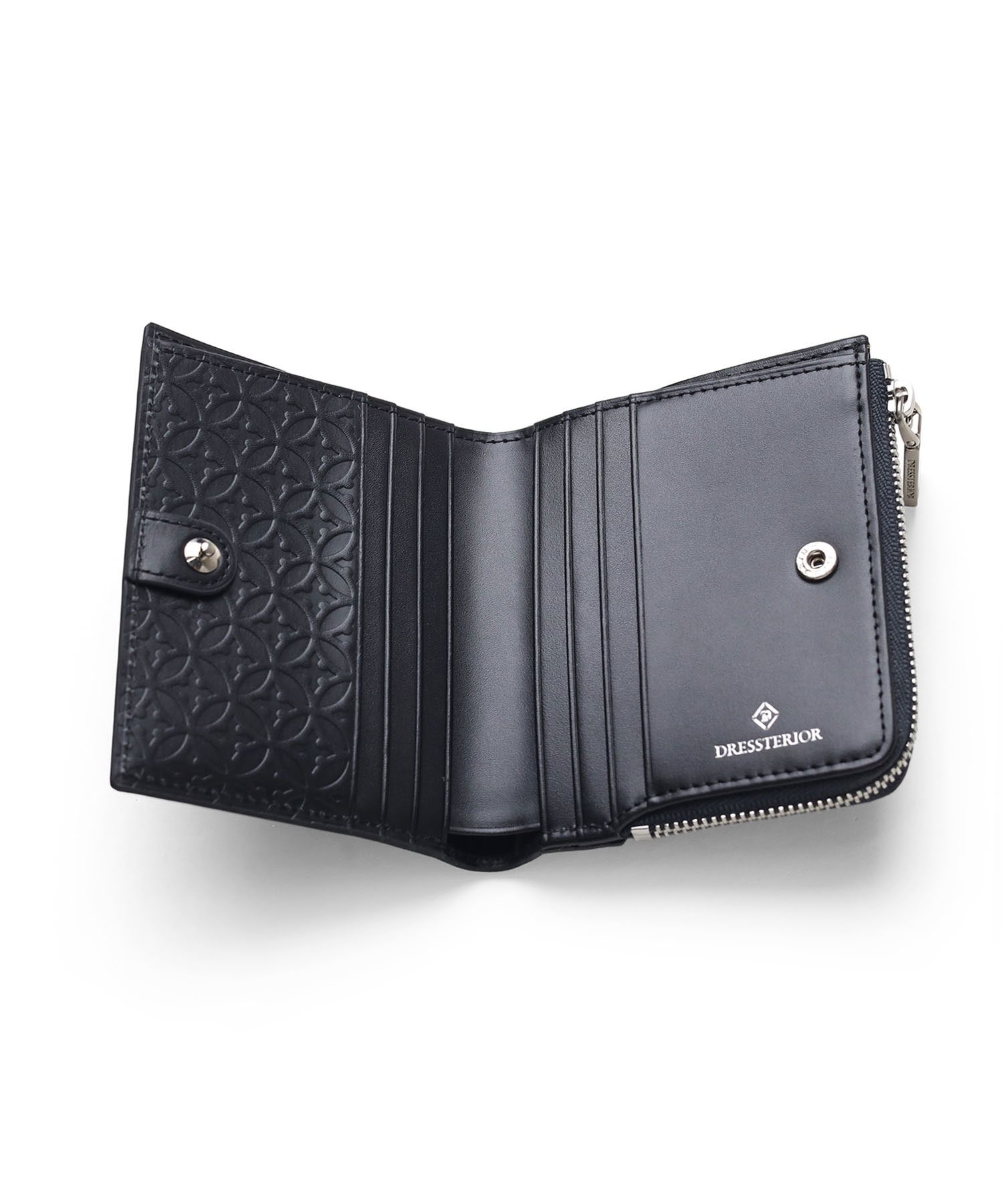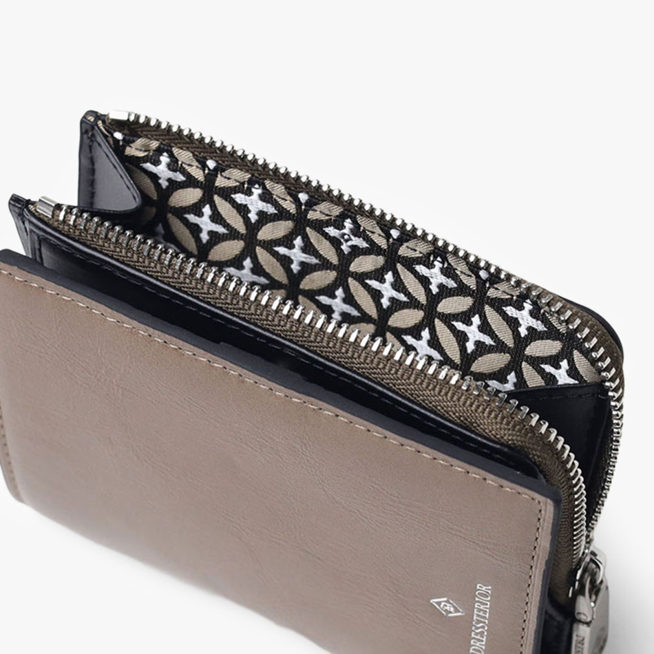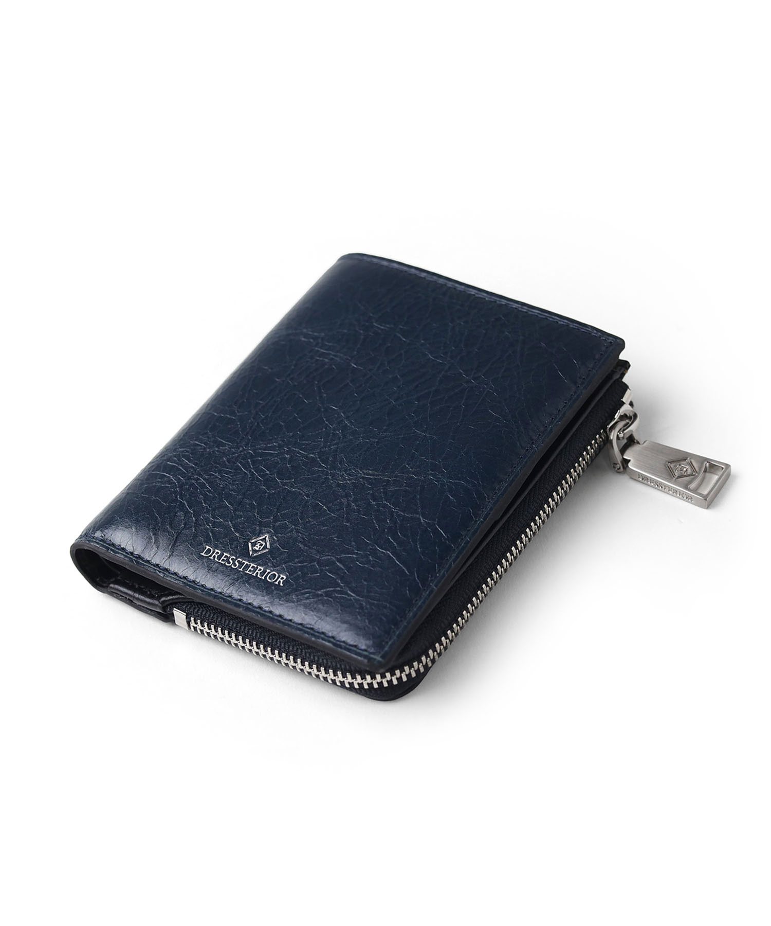 国産原皮にワックスを加えた特殊加工によって、大小ランダムなシワを際立たせているオリジナルリンクルレザーを使用した二つ折り財布です。内装革の一部にはドレステリアを象徴する柄である「オーバーラップサークル」をエンボスで表現し、裏地にも同様のオーバーラップサークル柄を使用しています。コンパクトで堅苦しすぎないデザインのため、カジュアルに使用できます。