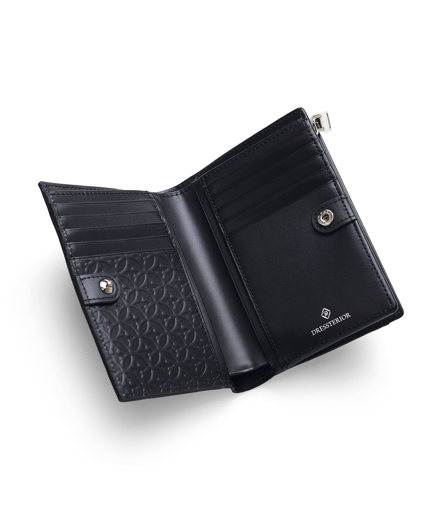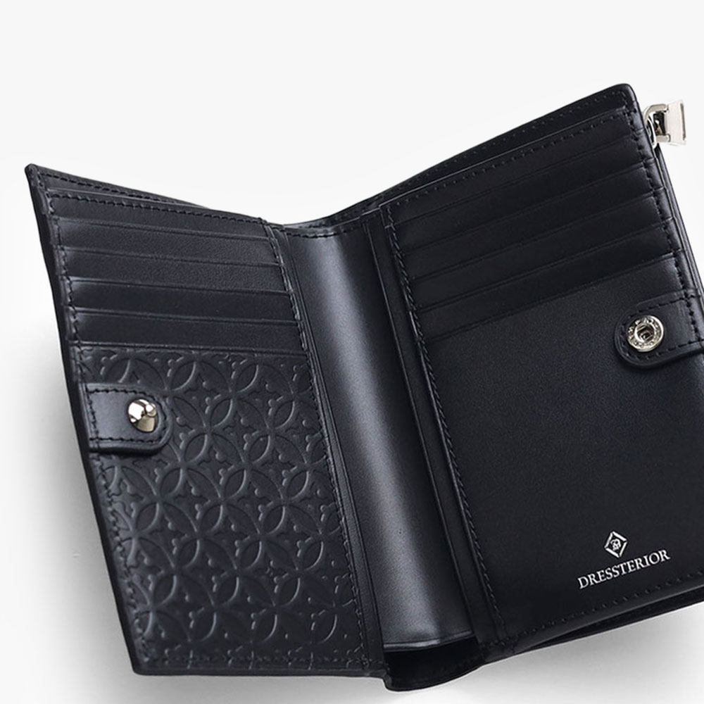 国産原皮にワックスを加えた特殊加工によって、大小ランダムなシワを際立たせているオリジナルリンクルレザーを使用したセミ長財布です。内装革の一部にはドレステリアを象徴する柄である「オーバーラップサークル」をエンボスで表現し、裏地にも同様のオーバーラップサークル柄を使用しています。大きすぎないサイズ感で収納力があり、堅苦しすぎないデザインのため、カジュアルに使用できます。