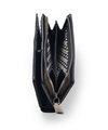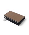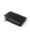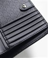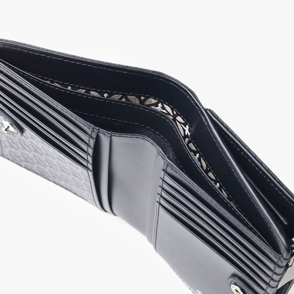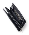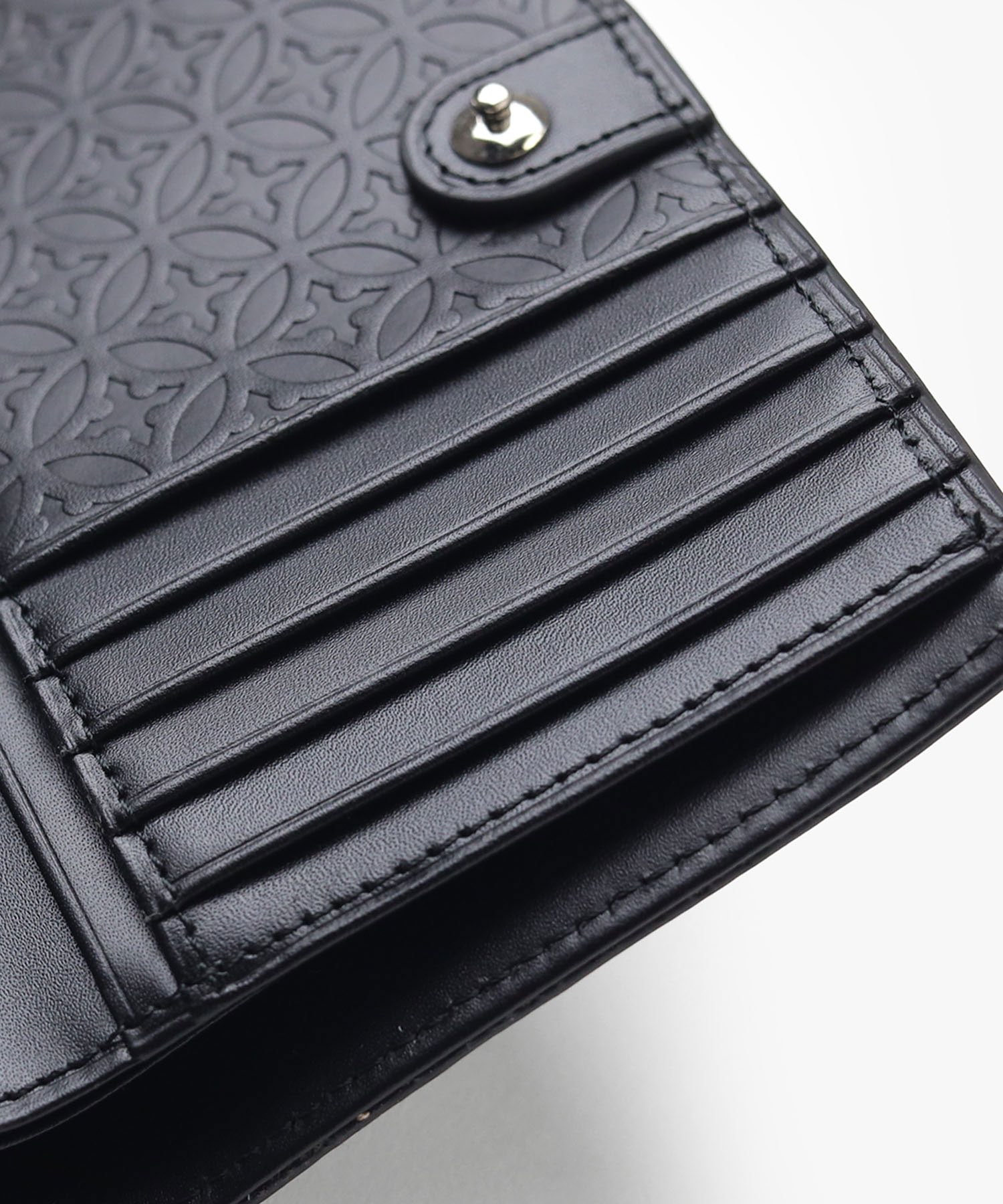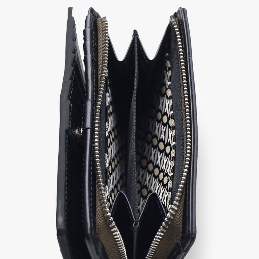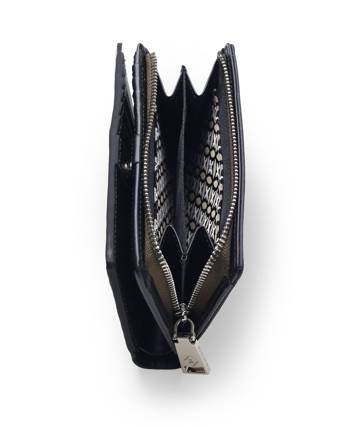 内装には札入れが2つ、カード段が計10段あり、カード段の裏側にはフリーポケットがそれぞれ2つ設けられている大容量設計です。L字ファスナーでアクセスできる仕切り付きの小銭入れは、大きく開いて中が見やすくスムーズに硬貨を出し入れすることができ、更にポケットが2つ設けられているため、鍵や交通系ICカードを忍ばせることができます。また、小銭入れの裏地やエンボス加工の施されたオーバーラップサークル柄が目を引くデザインとなっています。