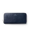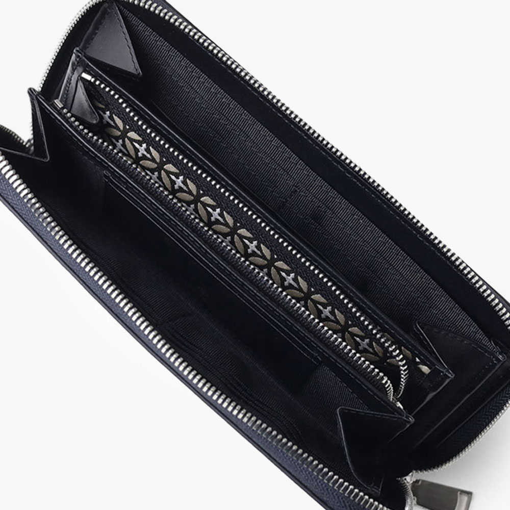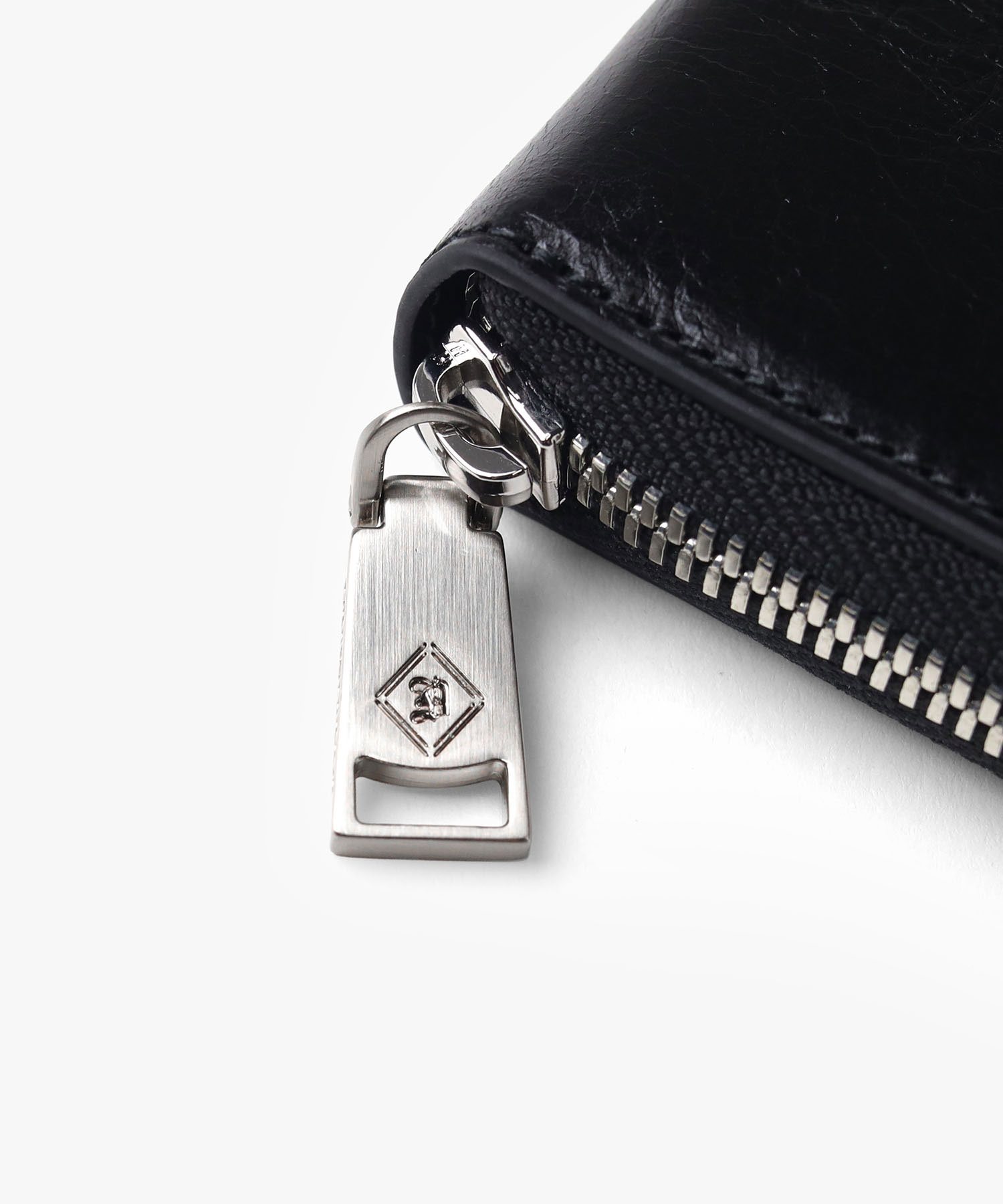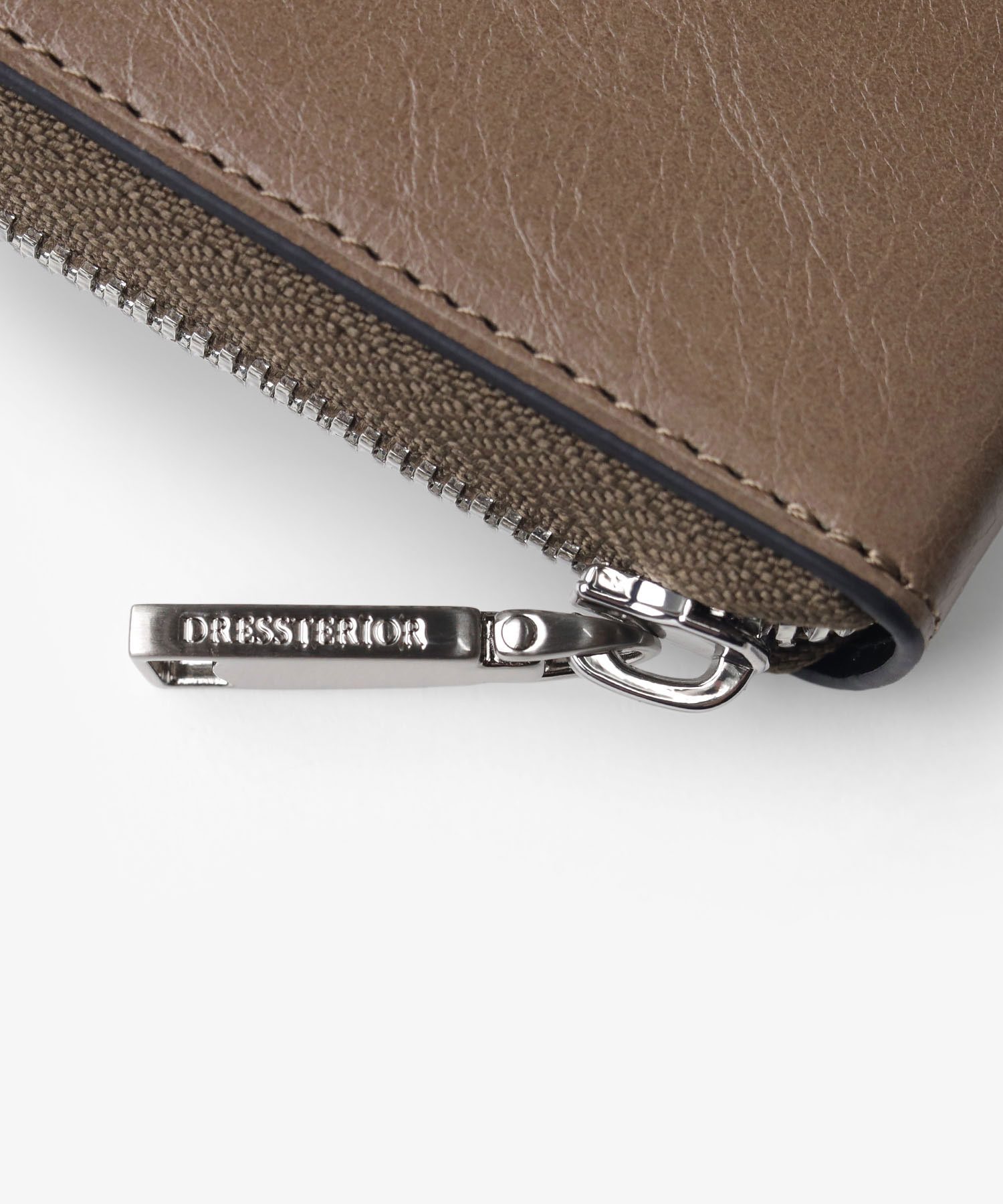 国産原皮にワックスを加えた特殊加工によって、大小ランダムなシワを際立たせているオリジナルリンクルレザーを使用したラウンドファスナー型長財布です。内装革の一部にはドレステリアを象徴する柄である「オーバーラップサークル」をエンボスで表現し、裏地にも同様のオーバーラップサークル柄を使用しています。大容量かつ堅苦しすぎないデザインのため、カジュアルに使用できます。