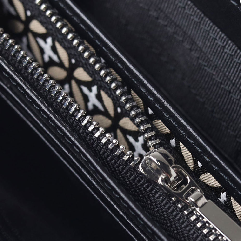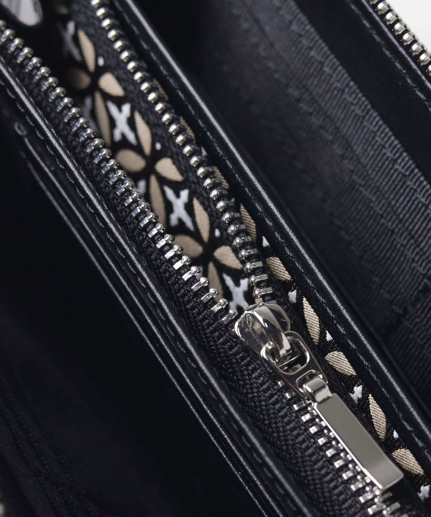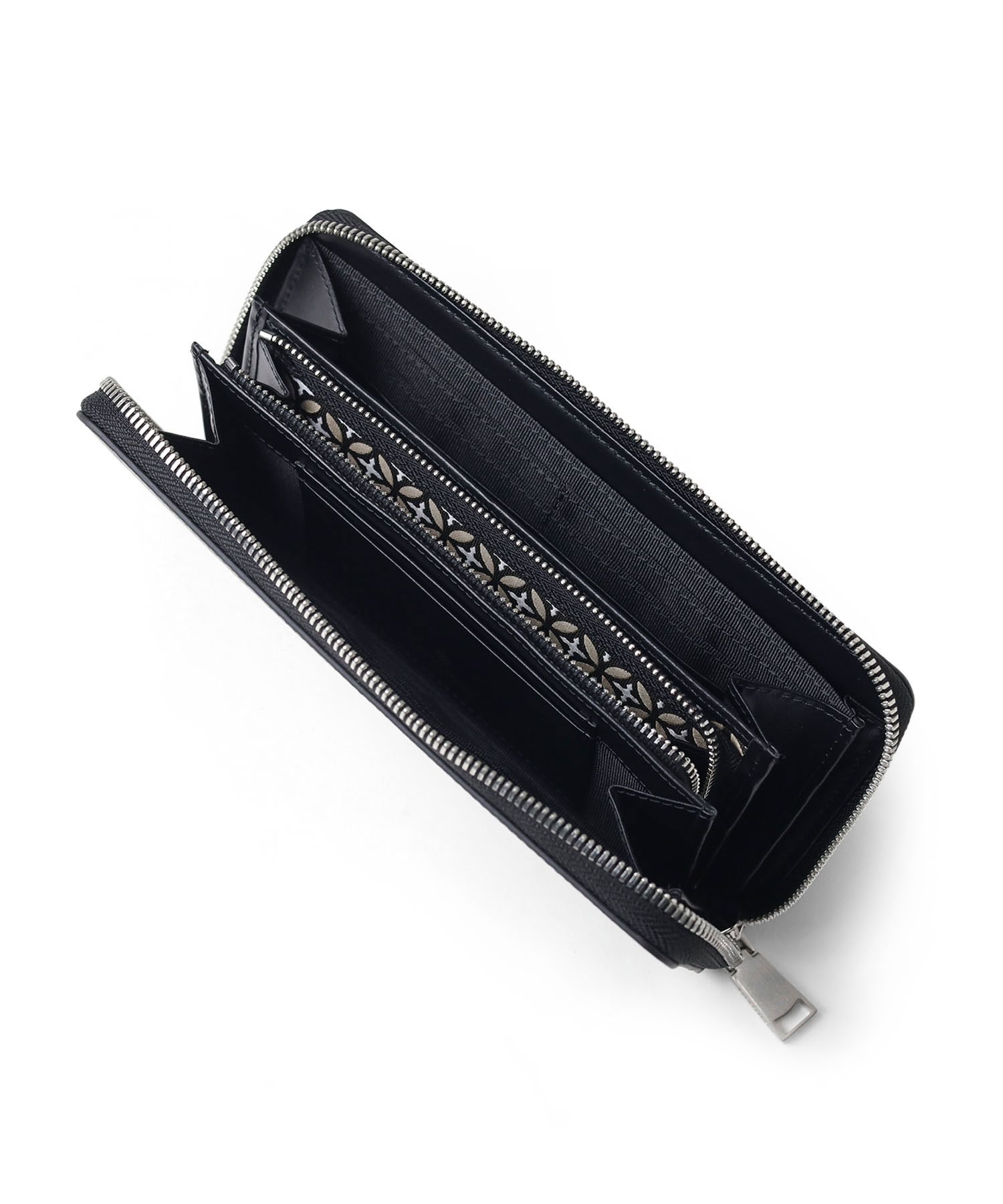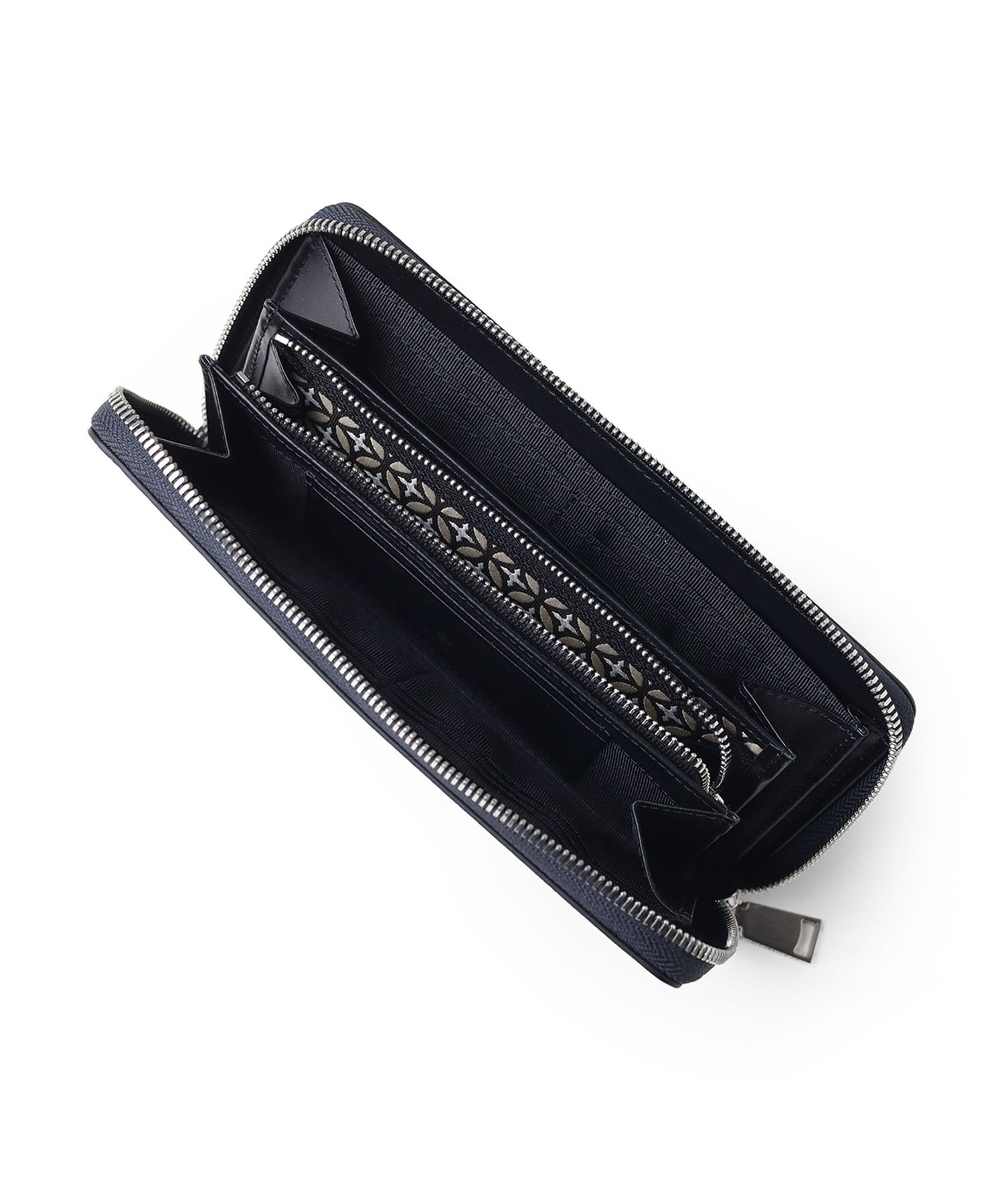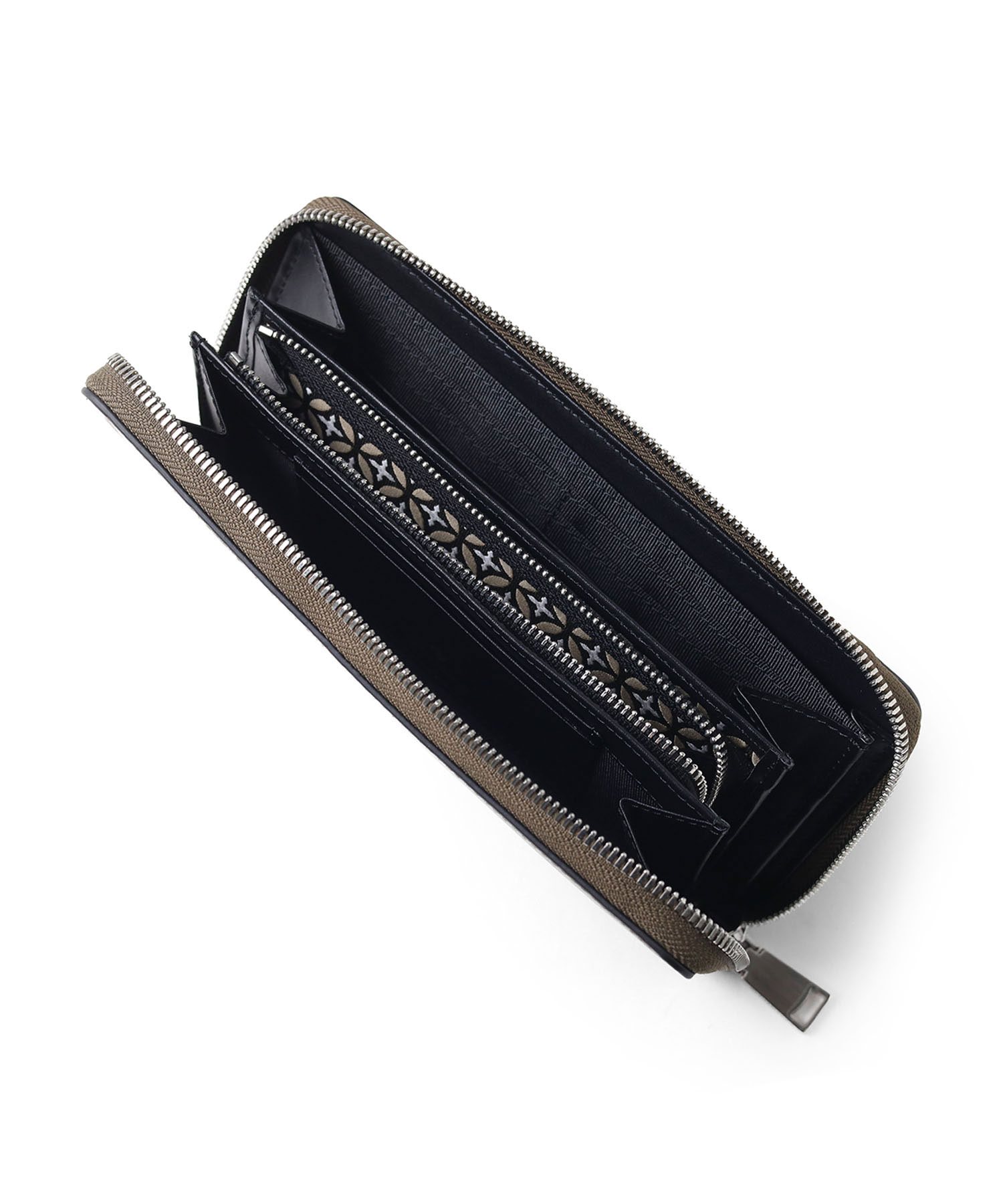 内装には札入れが2つ、カード段が計14段あり、カード段の裏側にはポケットが設けられているため、レシートやチケット類の収納と整理が可能です。小銭入れにはL字ファスナーを採用し、大きく開いて中が見やすくスムーズに硬貨を出し入れすることができます。また、小銭入れの裏地やエンボス加工の施されたオーバーラップサークル柄が目を引くデザインとなっています。