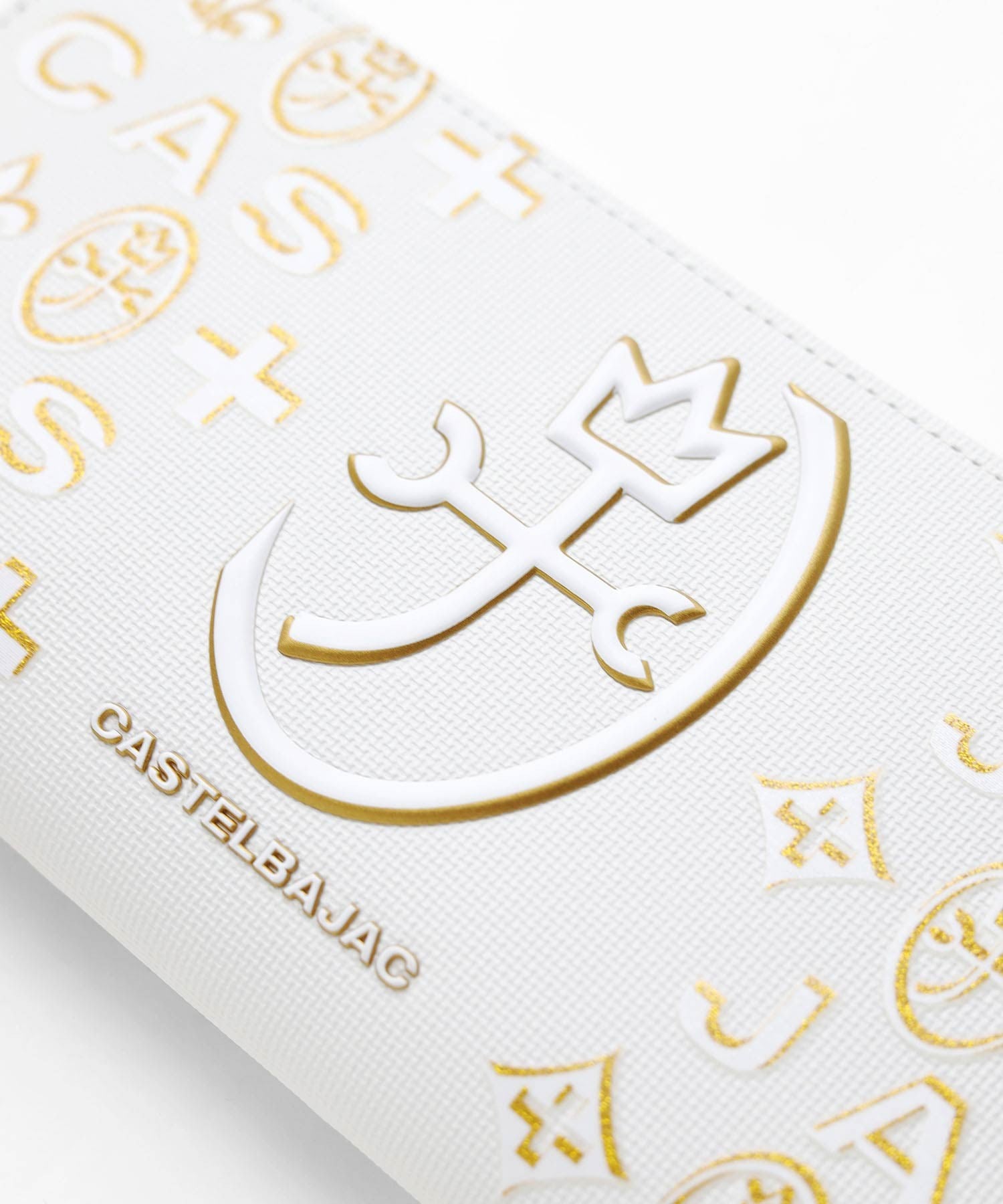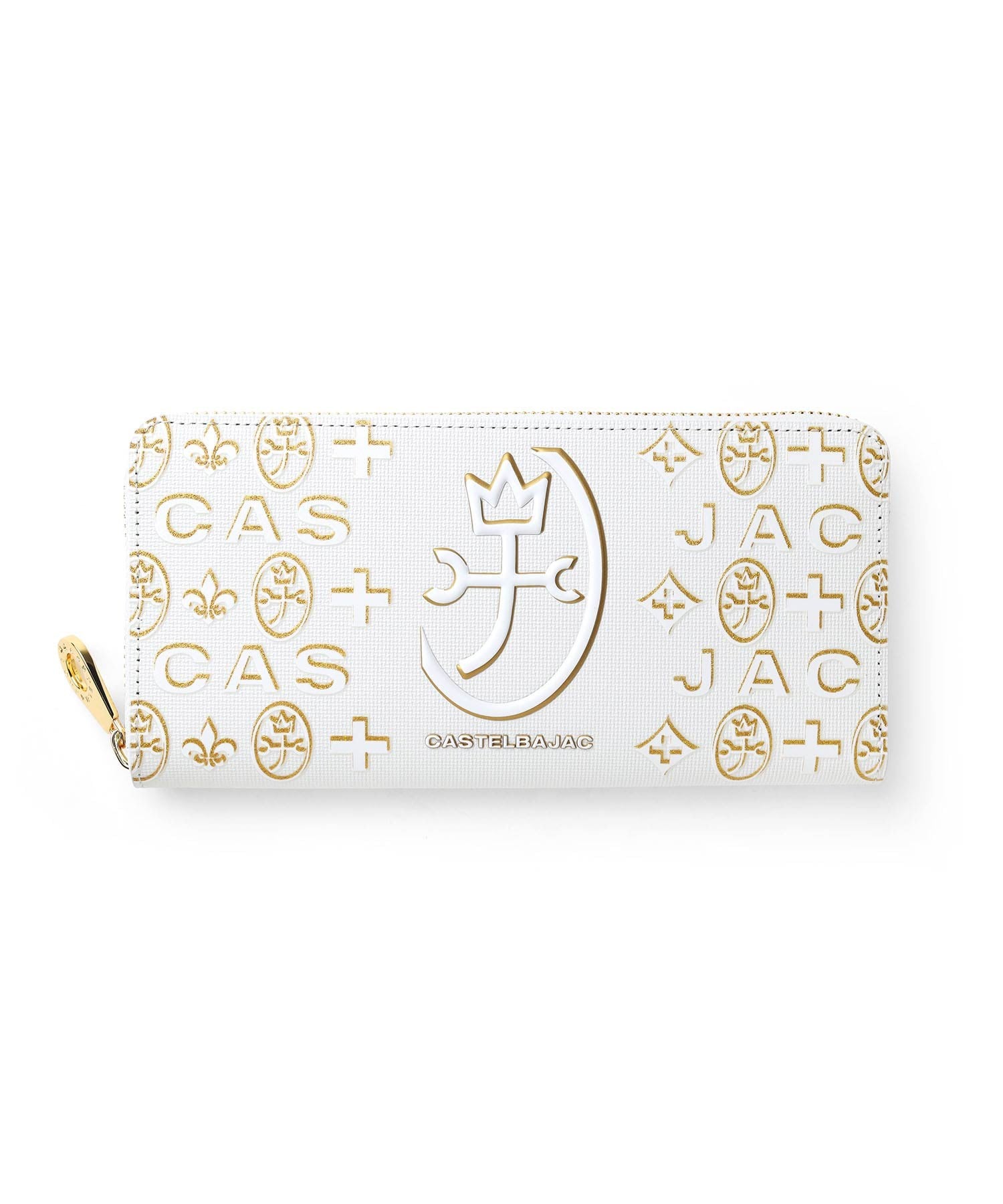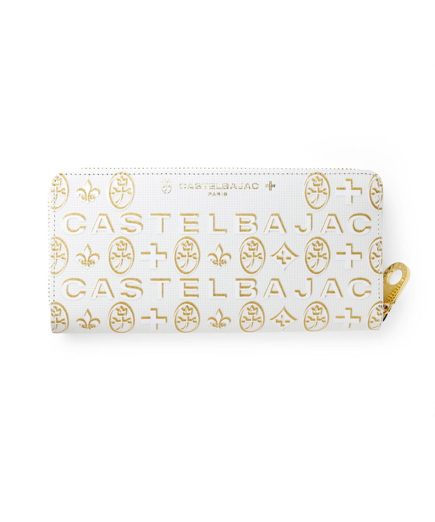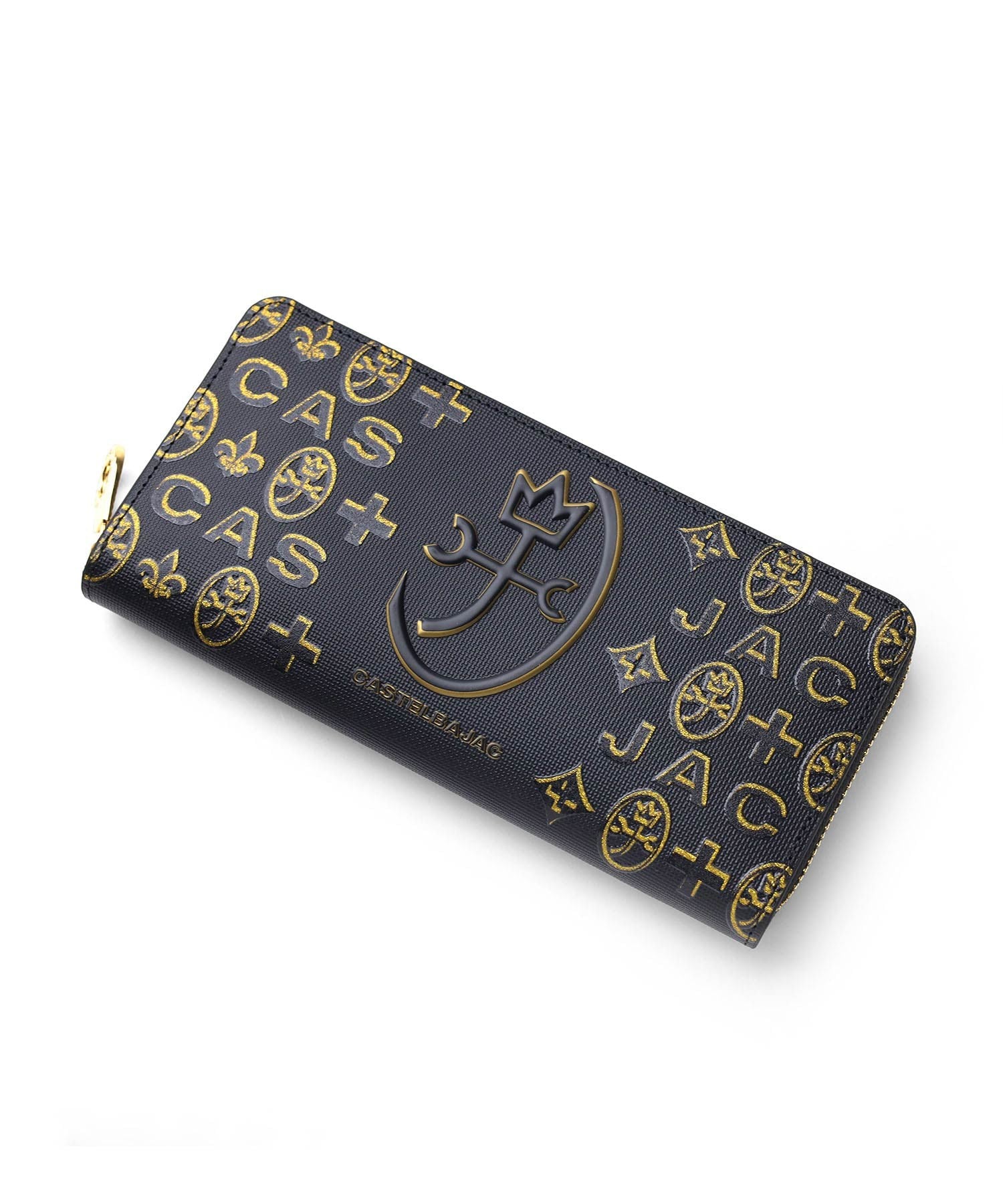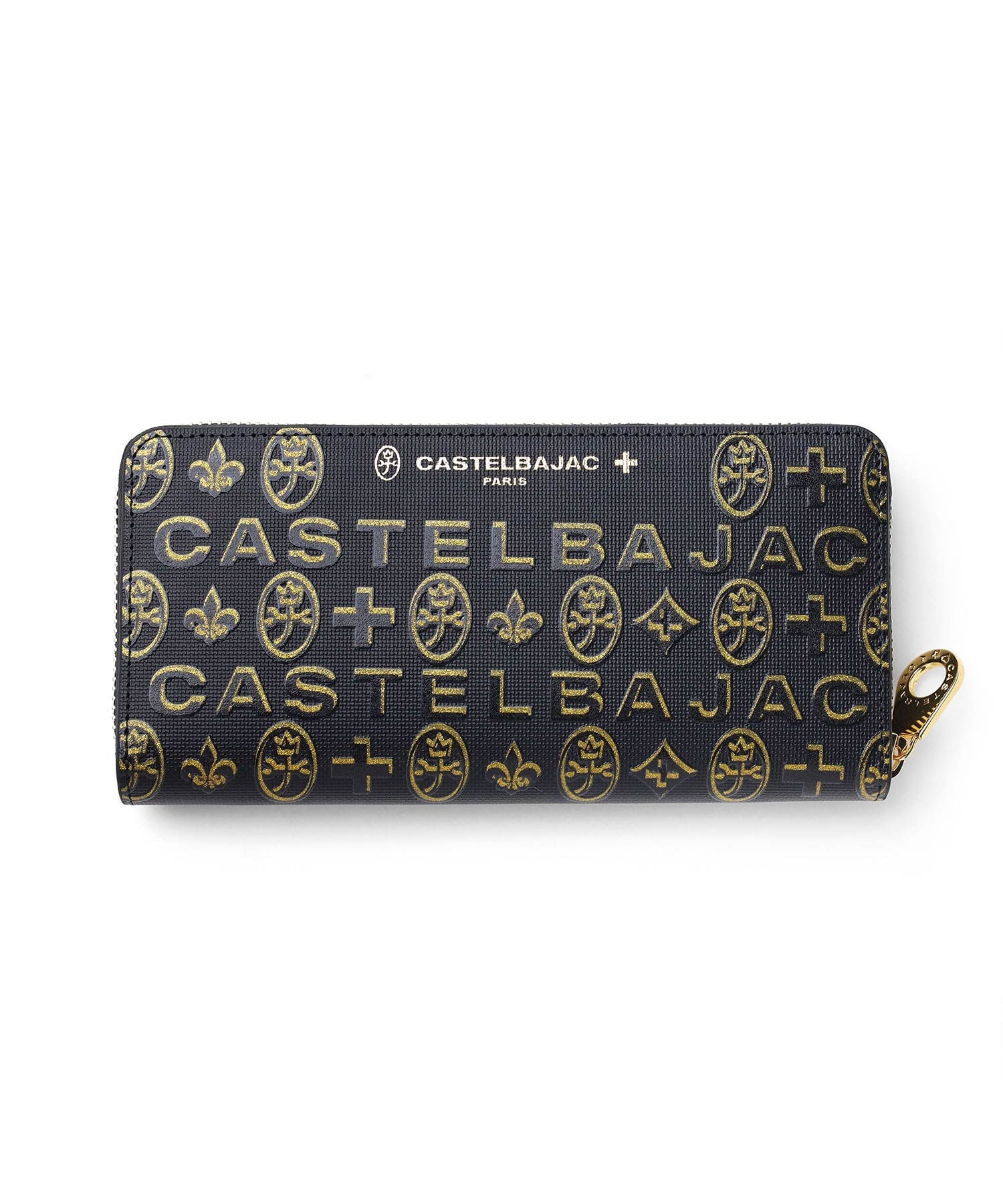 ゴールドプリントが華やかなカステルバジャックのラウンドファスナー長財布。ラウンドファスナーで大きく開き、収納力も抜群です。ゴールドの星屑が散りばめられたような、シャイニーで華やかな財布シリーズです。中央のブランド家紋はぷっくりと立体的に盛り上げています。バックプリントのデザインも魅力です。