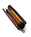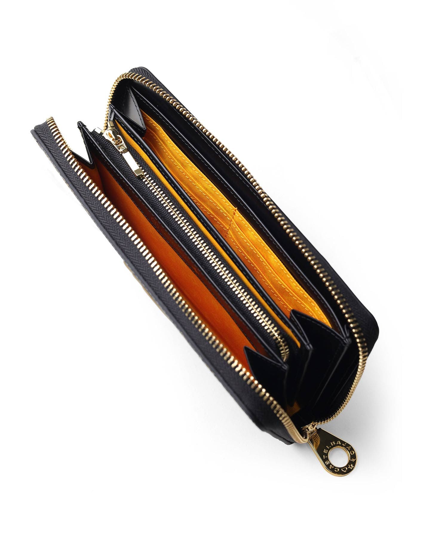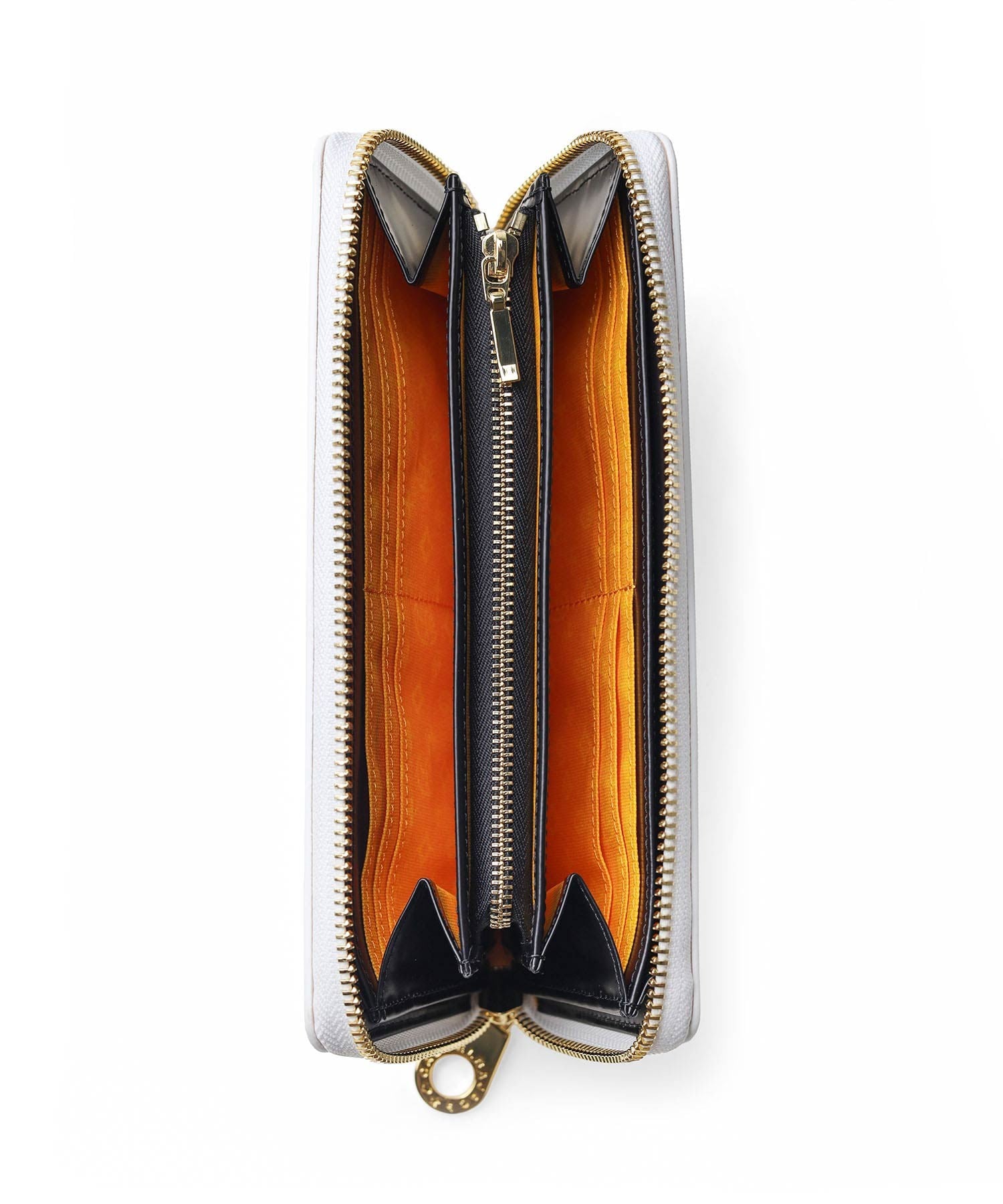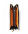ラウンドファスナー長財布を開くと、カード段が12、ポケットが2つ、札入れが2つ、小銭入れが1つあります。小銭入れはL字ファスナーになっており、中身が見やすく小銭の出し入れもしやすい設計です。札入れスペースも2つあるため、現金とレシート類を分けて収納可能です。