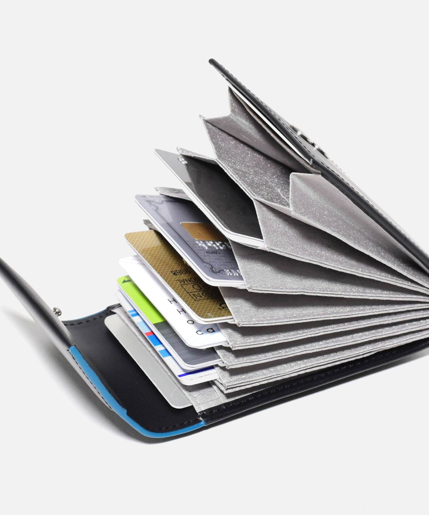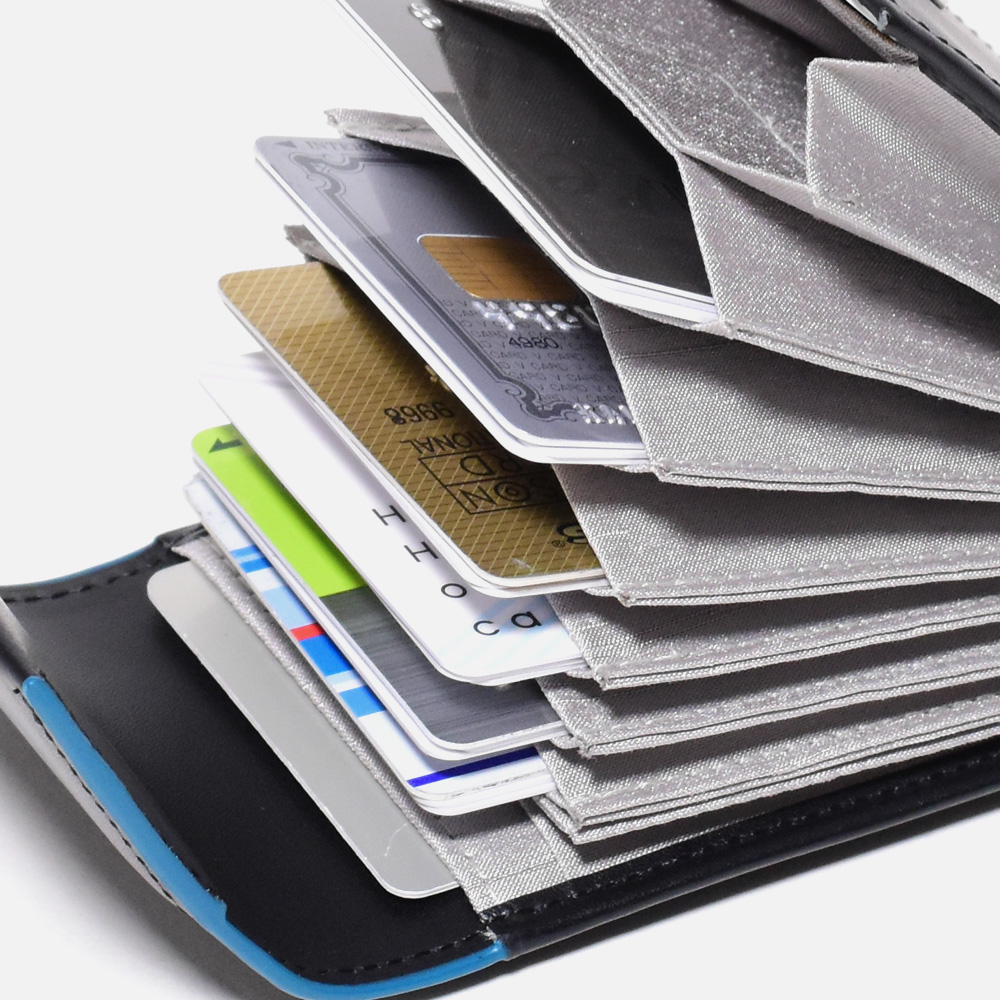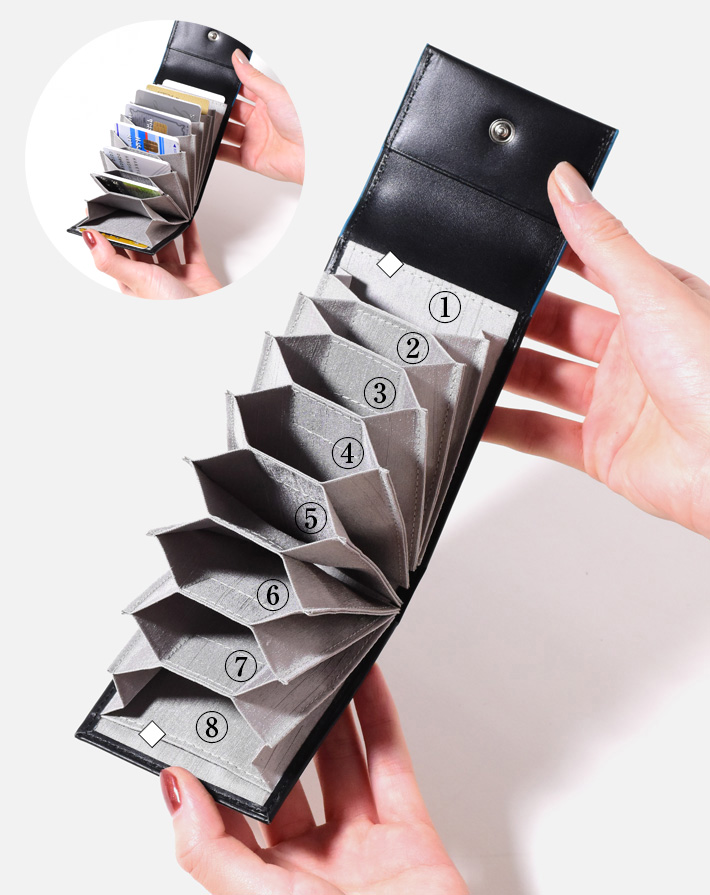 中はジャバラ式で大きく開くため、ひと目で探しやすい作りになっています。風琴マチ仕様のポケットになっているので、1ポケットに複数枚カードの収納が可能です。クレジットカード・診察券・ポイントカードなど種類を分けて収納するのに便利です。〇風琴マチポケット×8◆ポケット×2
