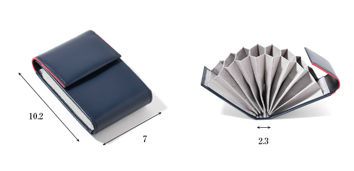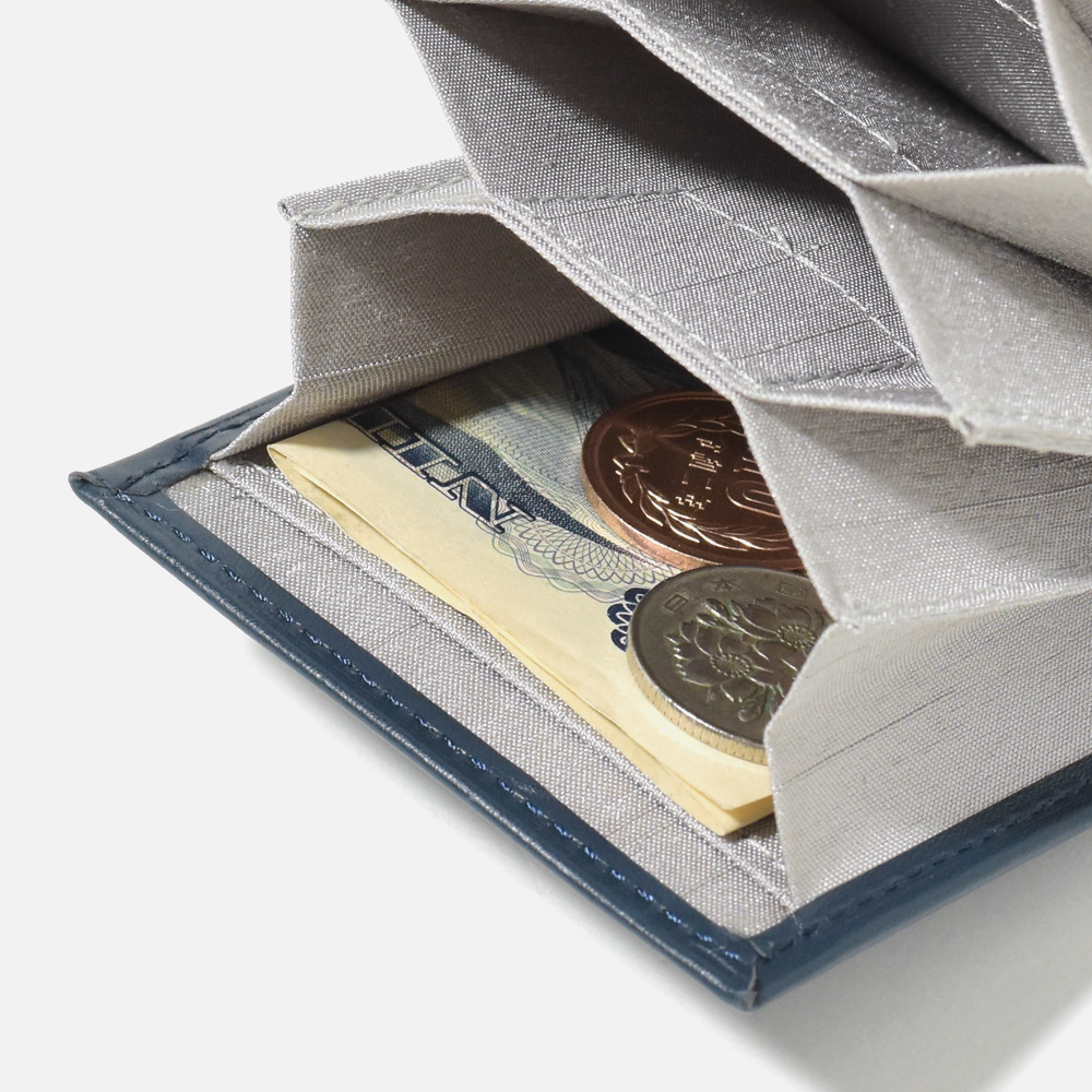 キャッシュレス派から現金派まで多様に使えるじゃばら式カードケース。多くのカードの収納を可能にし、更には折りたたんだお札がジャストサイズに入るよう設計しました。小銭を入れてもこぼれないようフラップタイプのデザインに仕上げています。普段キャッシュレス派でも、「少し現金を持ち歩く際にもう1つ小さい財布を用意するのは面倒…。」そんな声を参考に、「小さいのに全て1つにまとめれる」そんな財布を作りました。