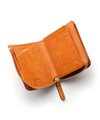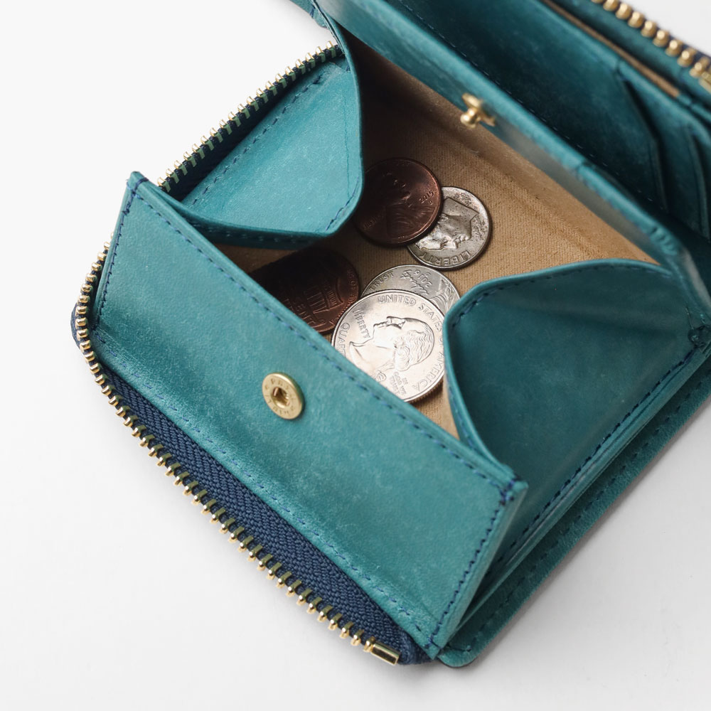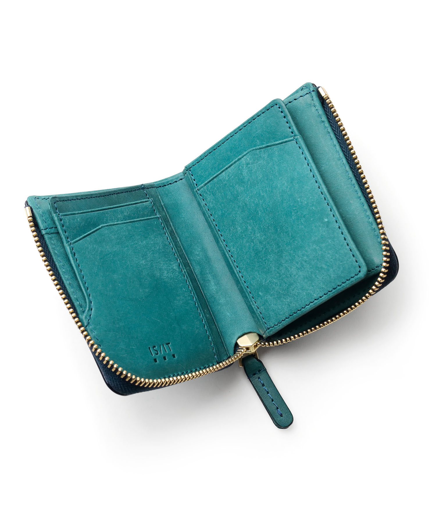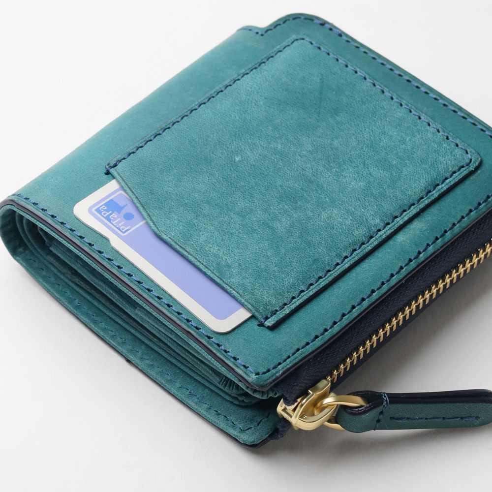 天然皮革ならではのナチュラルな風合いが特徴のイズイットのコンパクトな二つ折り財布。豊富なカードポケットや、見やすいBOX型の小銭入れなど、使いやすさにこだわった収納設計です。