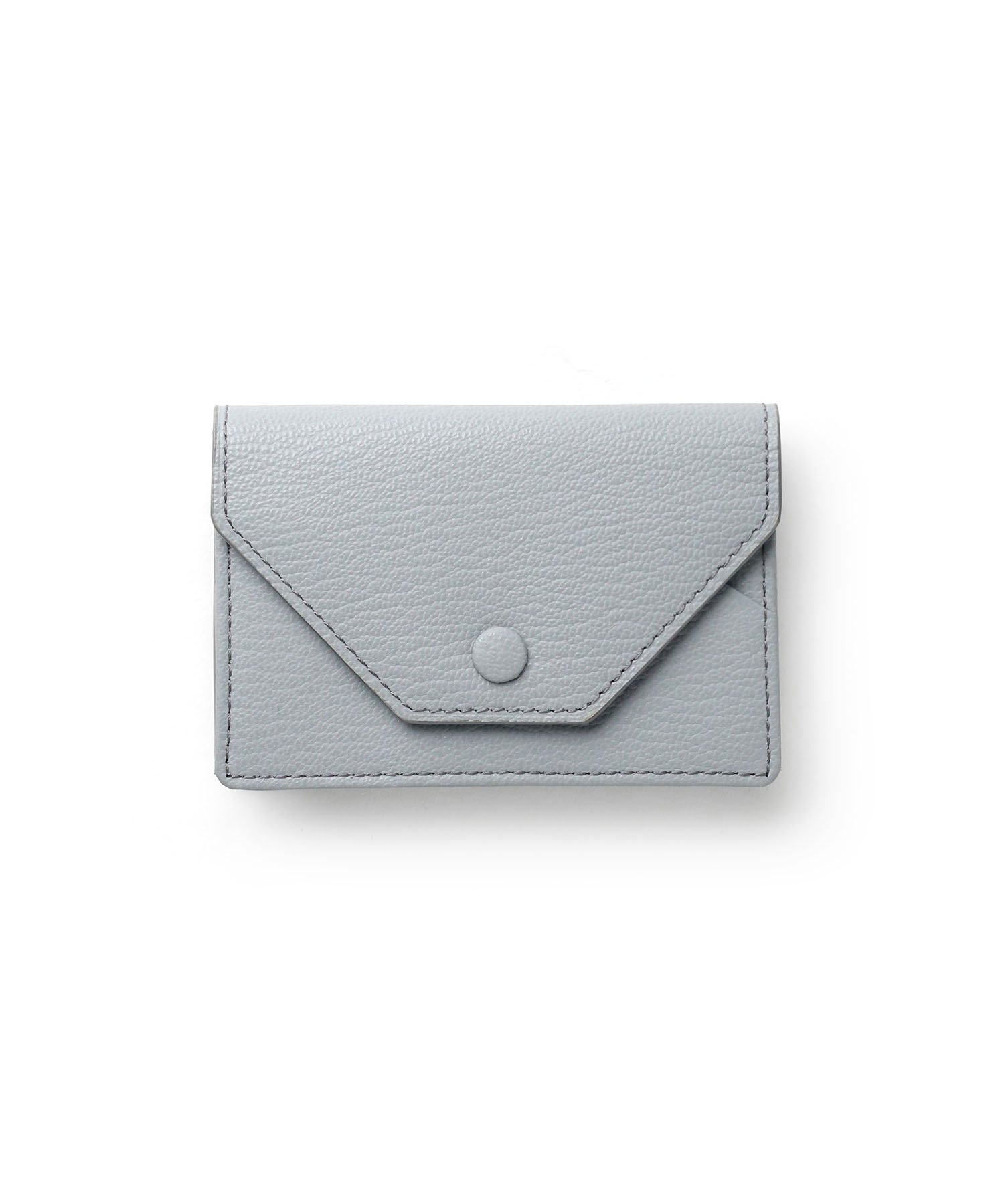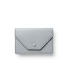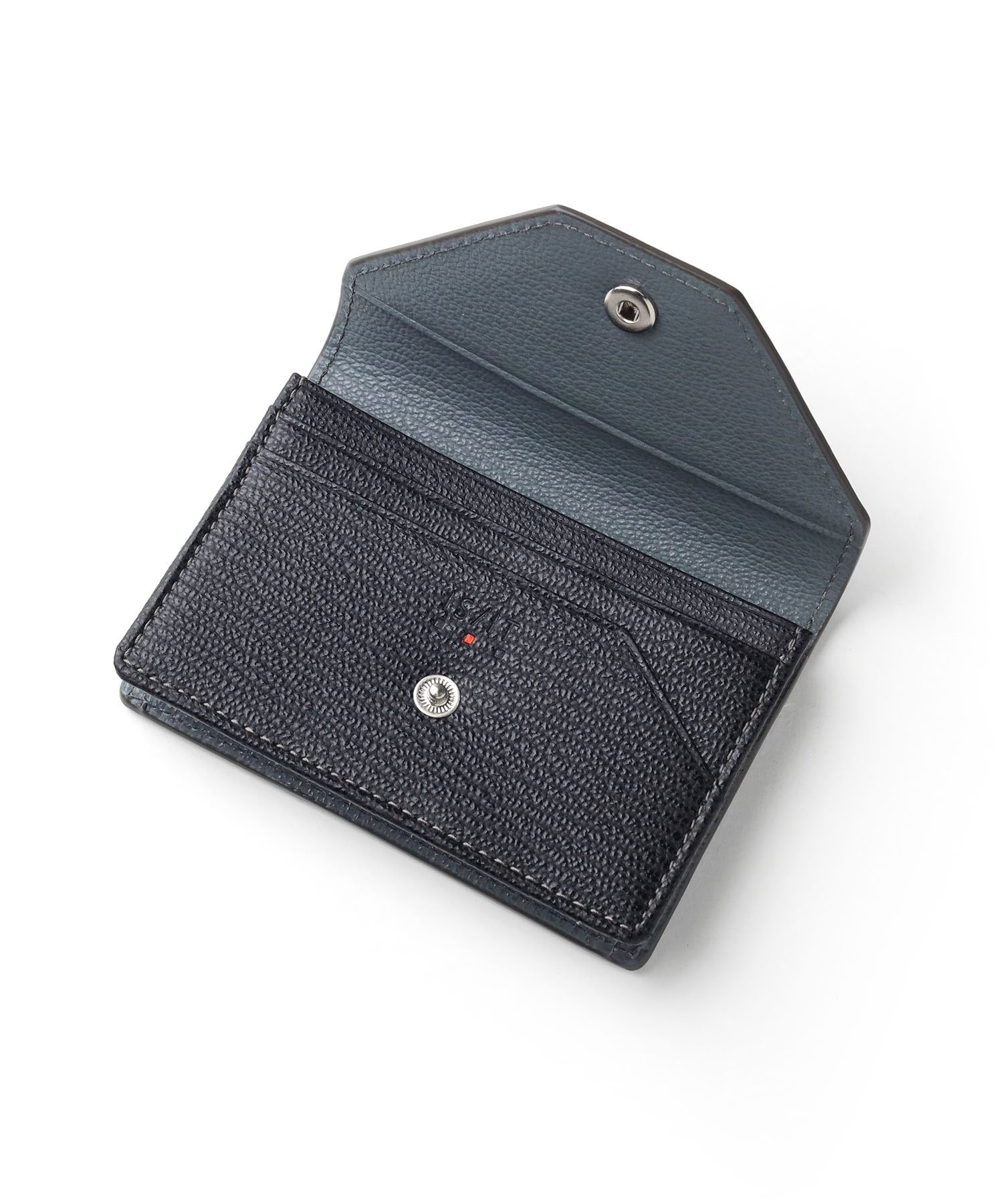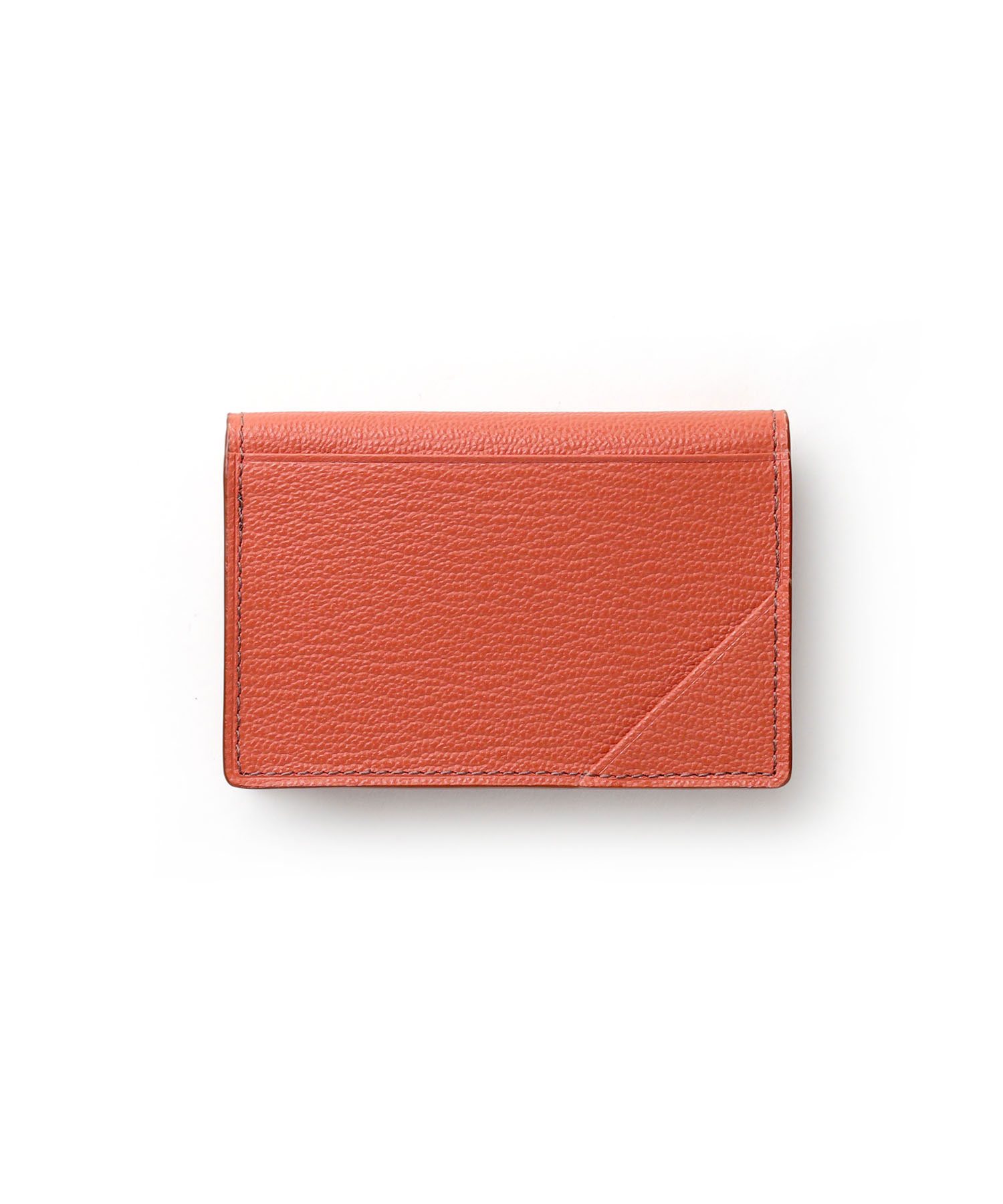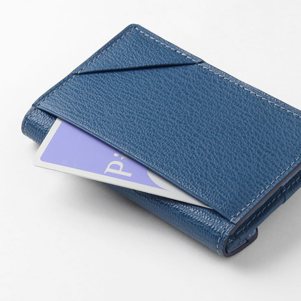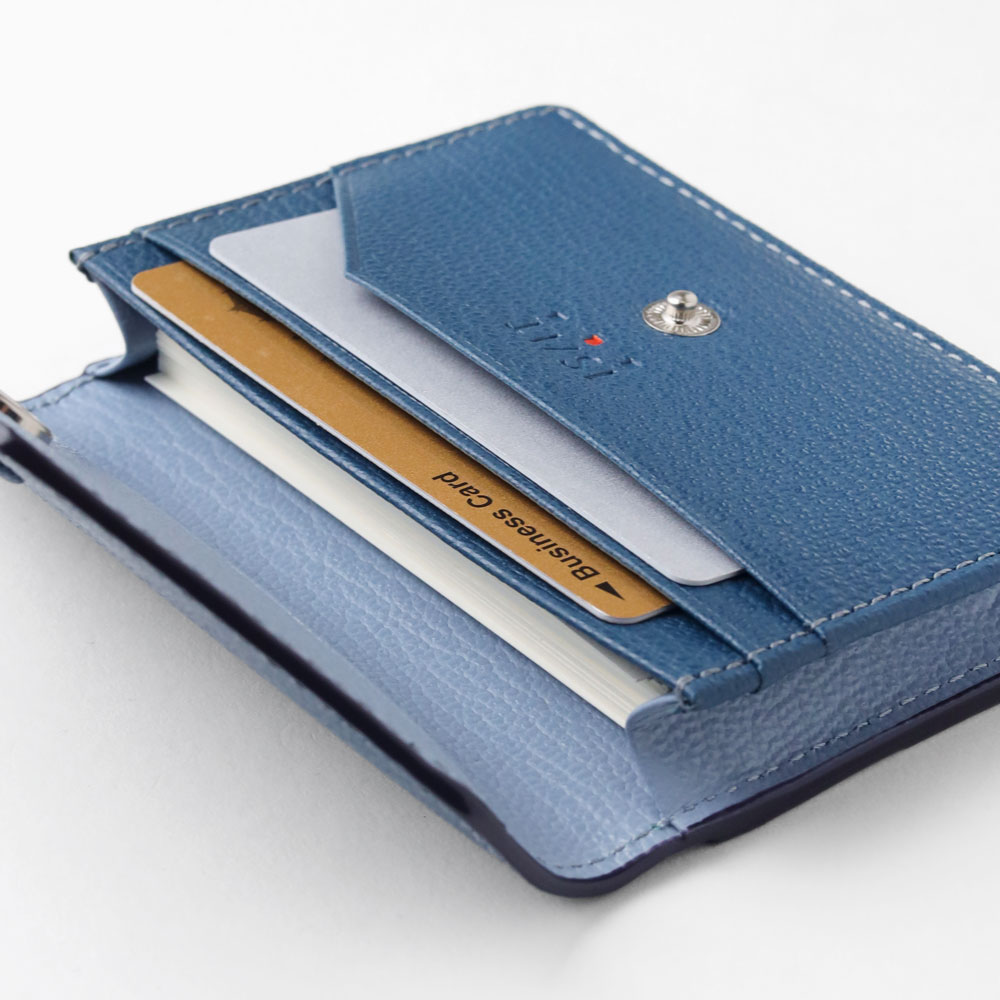 ゴートエンボス加工を施した牛革を使用した、洗練されたデザインの名刺入れ。繊細なニュアンスカラーと内外で異なるカラーコンビネーションが魅力です。男女問わず使いやすいカラーバリエーションで、ホック部分をレザーで包み込んだ「包みホック」がポイントとなっています。