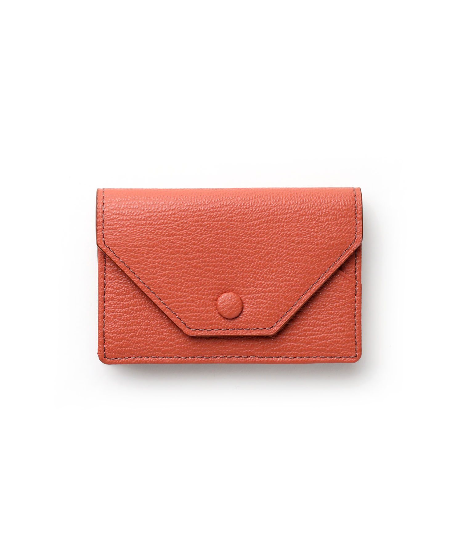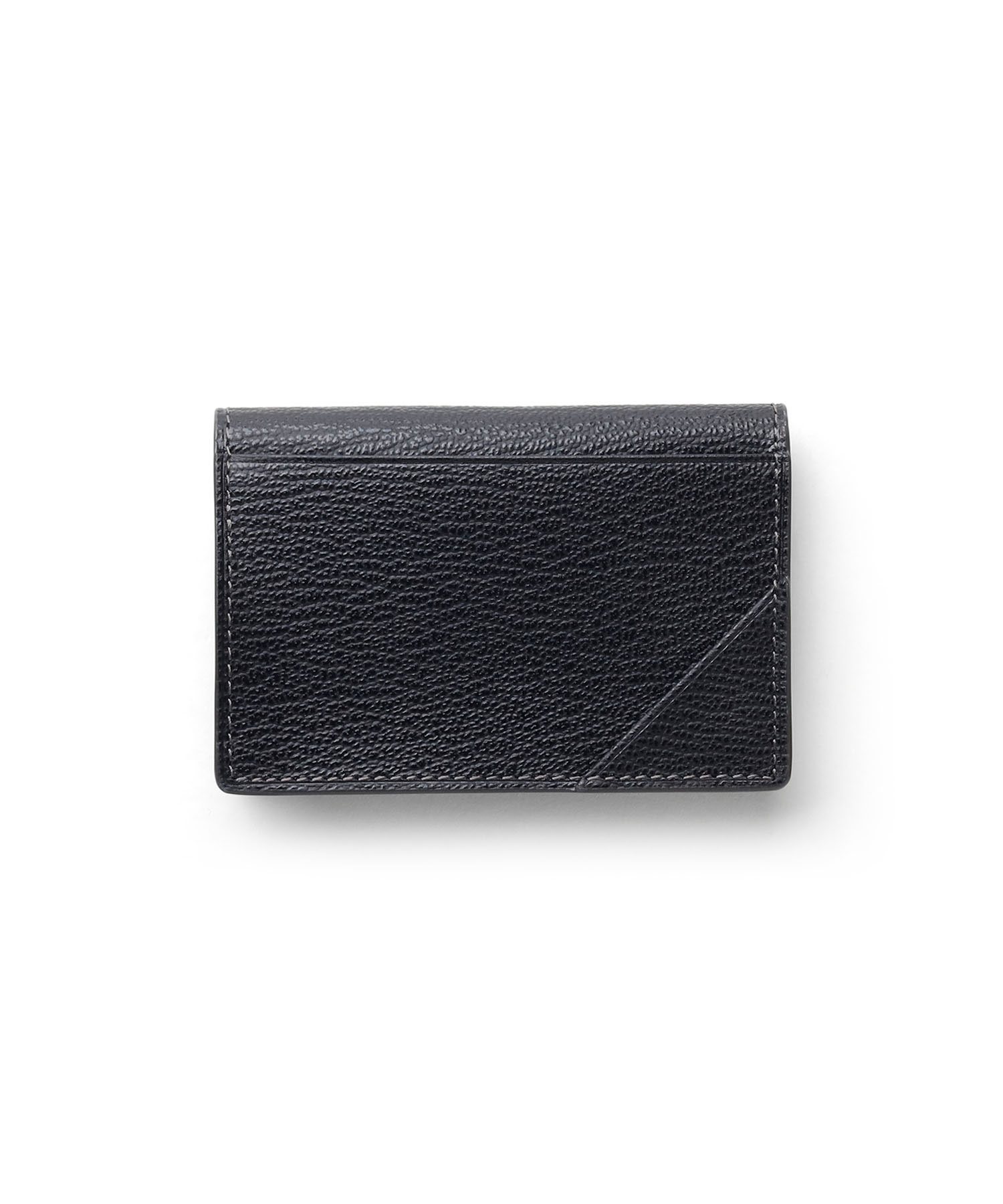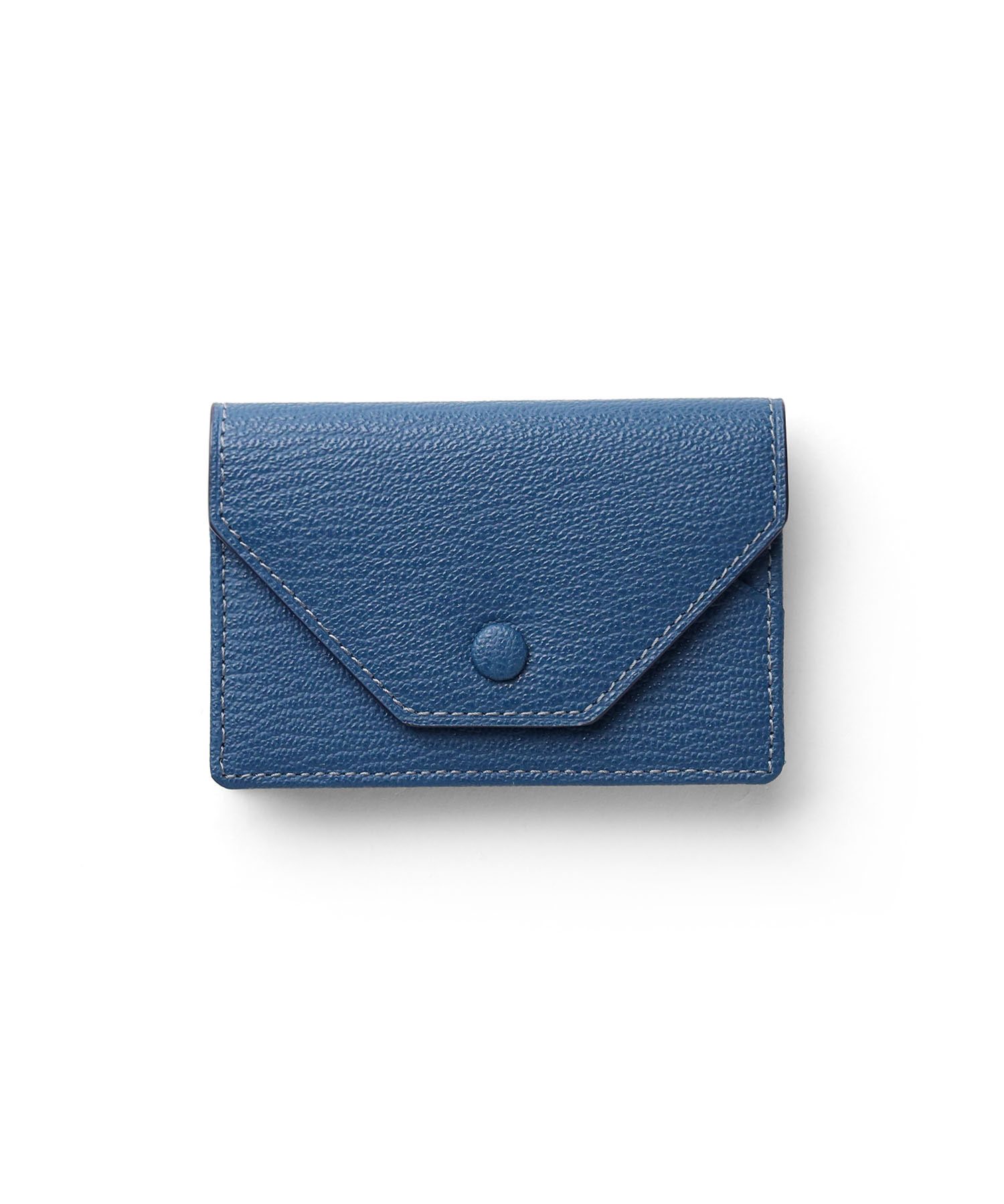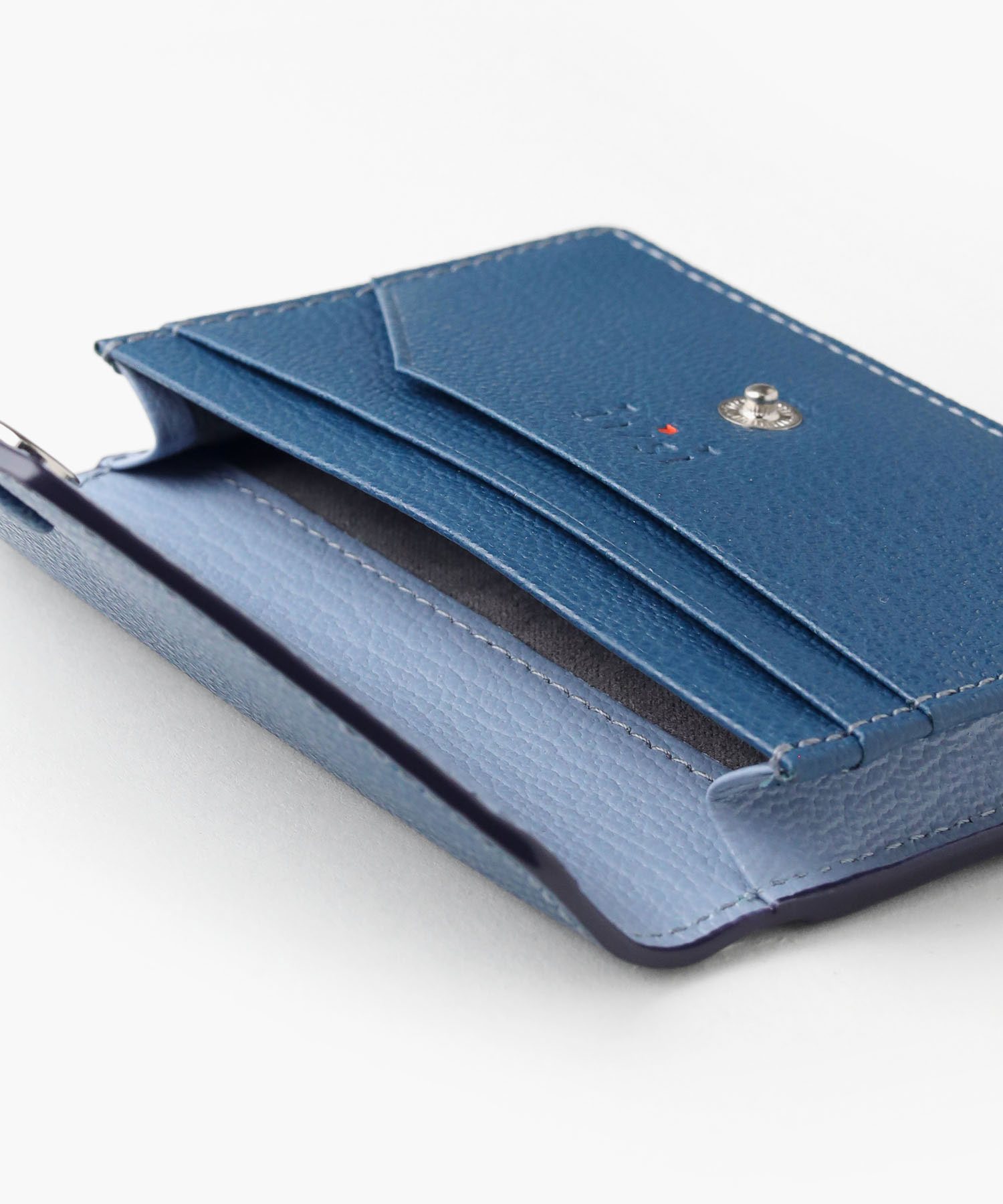 ゴートエンボス加工を施した牛革を使用した、洗練されたデザインの名刺入れ。繊細なニュアンスカラーと内外で異なるカラーコンビネーションが魅力です。男女問わず使いやすいカラーバリエーションで、ホック部分をレザーで包み込んだ「包みホック」がポイントとなっています。